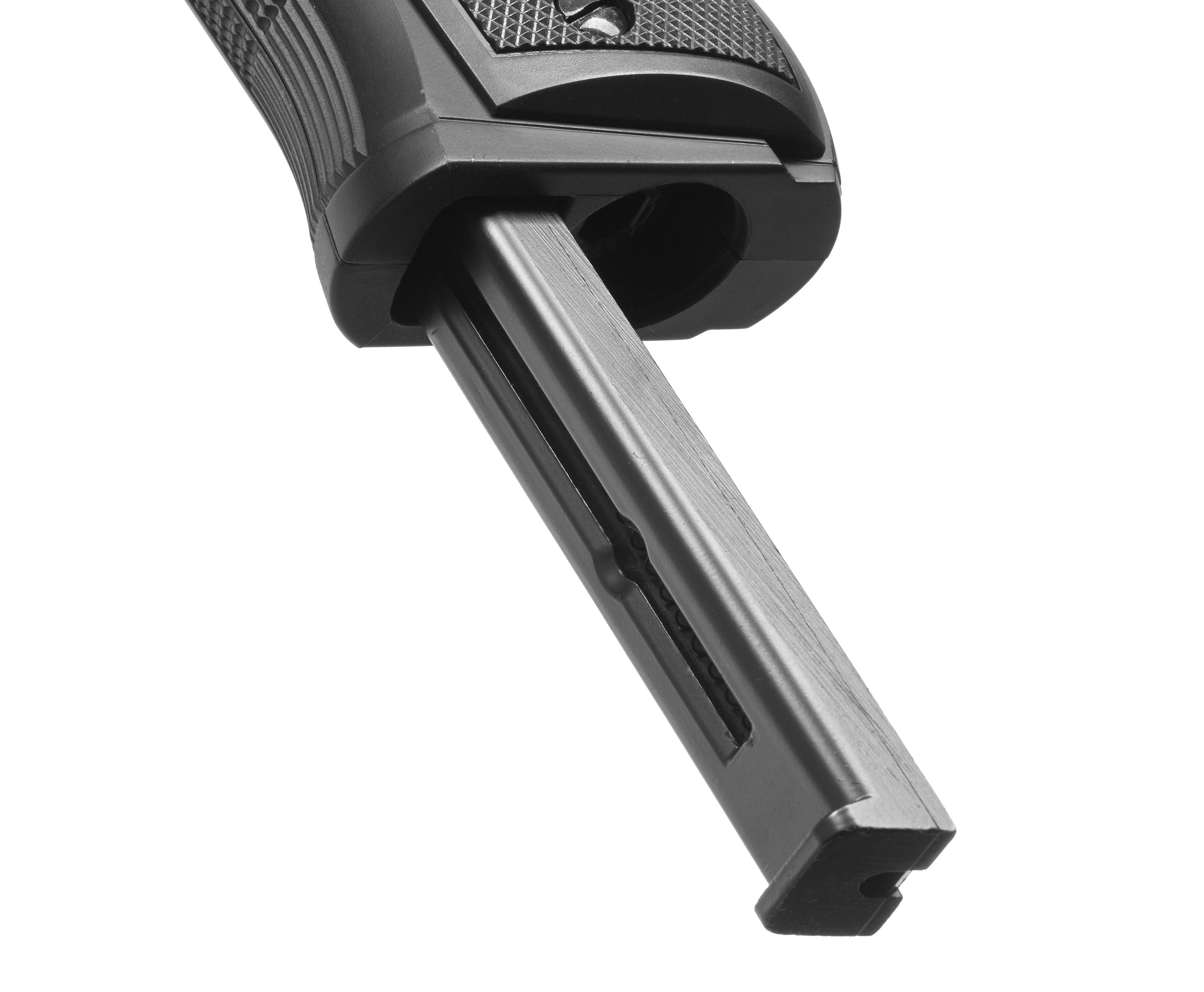 Для подачи газа в канал гладкого ствола потребуется установить одноразовый баллон CO2 12 грамм в приемник, находящийся внутри рукояти. Размещенный резервуар затягивается винтом до момента прокола носовой части и окончания появившегося стравливающего звука. Боепитание пистолета Беретта от Сталкер осуществляется посредством отъемного магазина, рассчитанного на 20 шариков BB, досылание которых выполняется за счет пружинного бегунка.