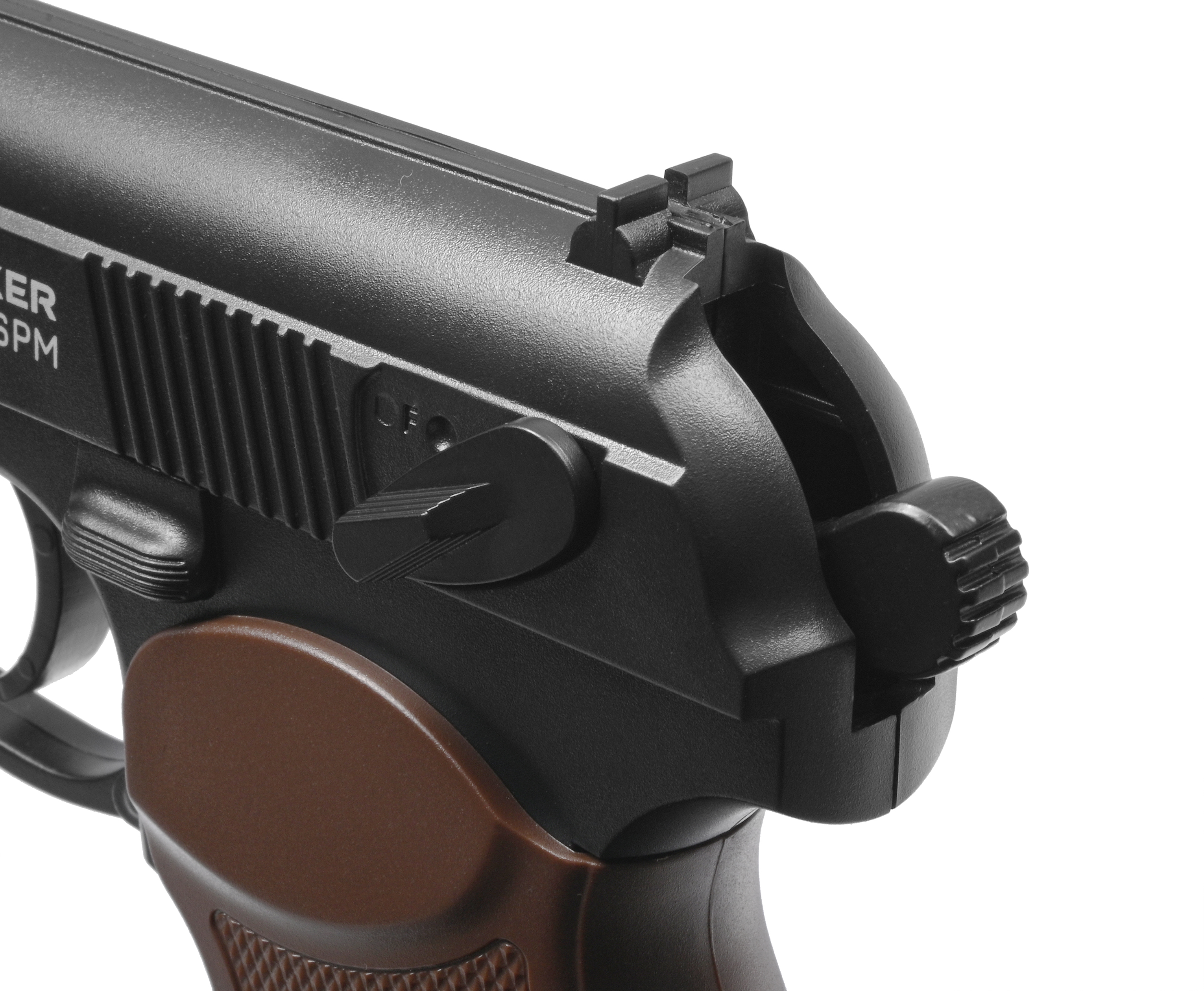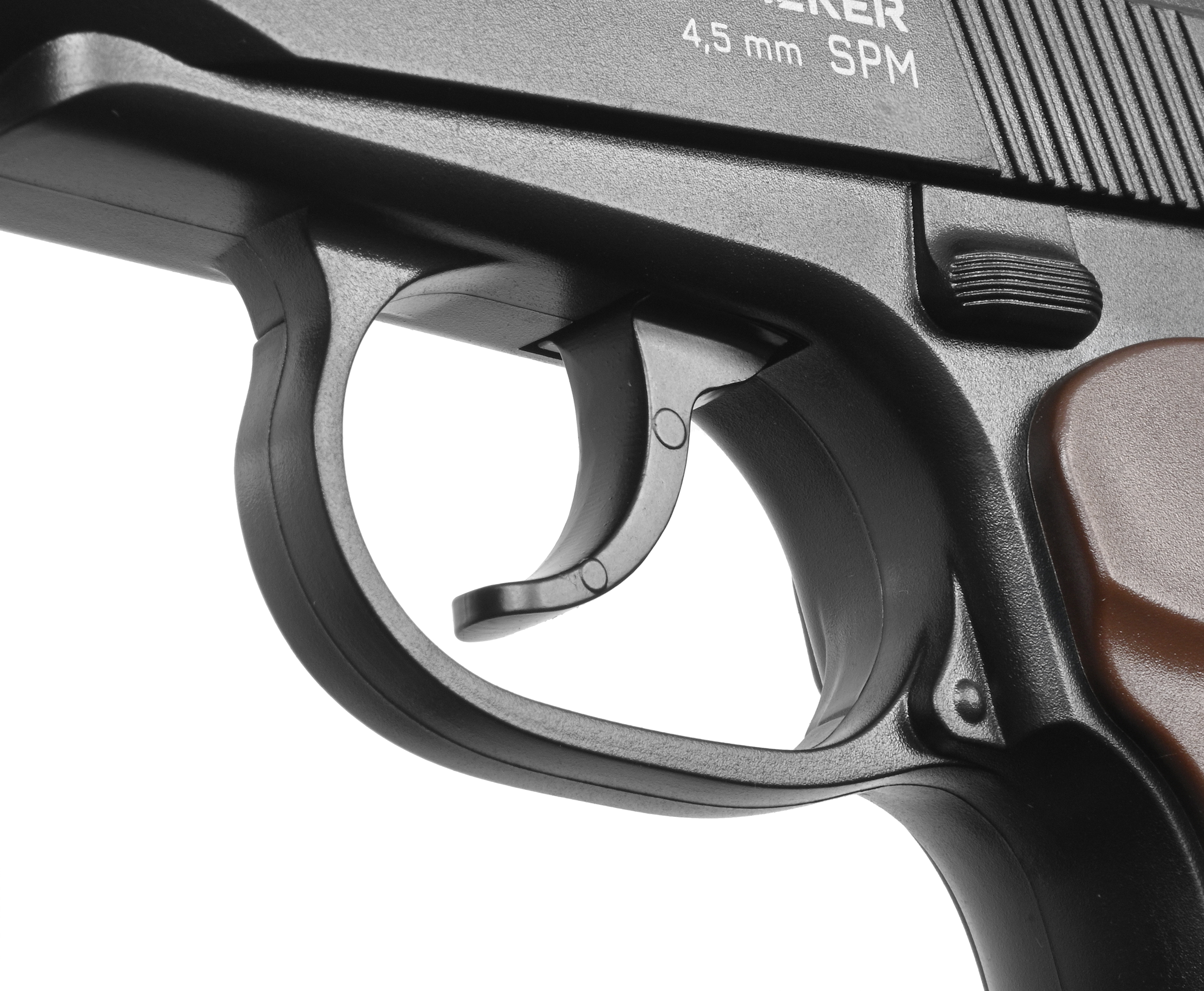 Модель SPM оснащается гладким стволом, рассчитанным под стальные шарики калибром 4.5 мм. Боеприпасы не придется приобретать самостоятельно - небольшой запас снарядов, как и бумажные мишени, идет совместно с пистолетом. Таким образом, можно сразу приступить к практическим занятиям.