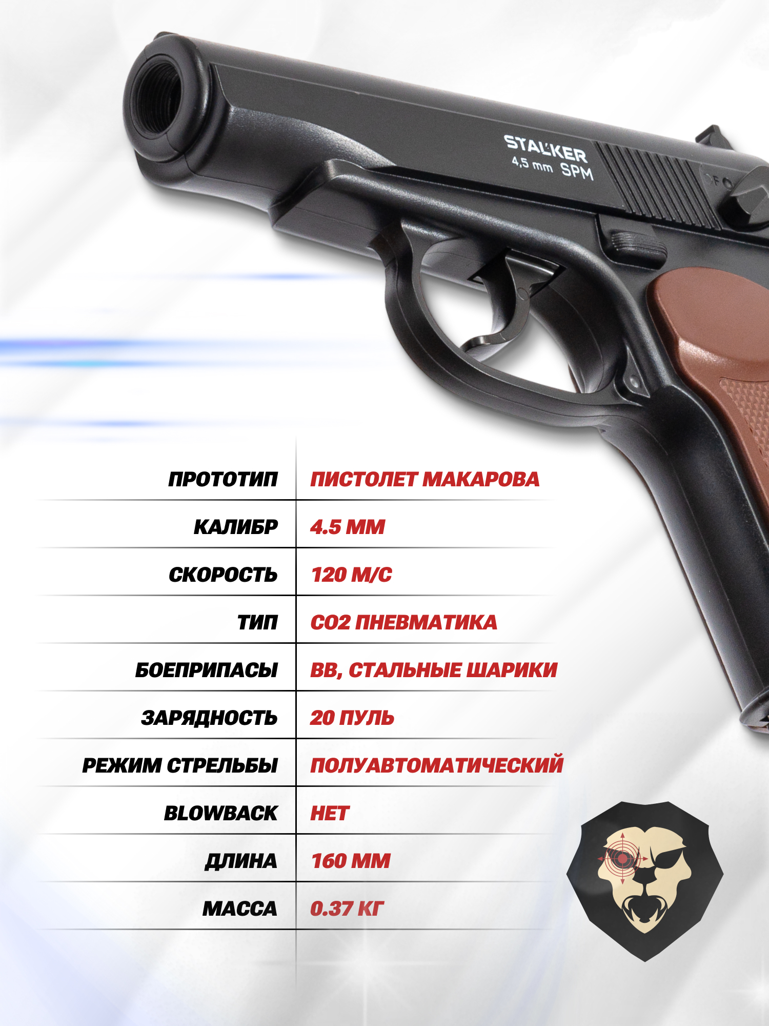 Важно отметить, что для покупки не нужно оформлять разрешающие документы. Пневматический пистолет Макарова компании Stalker соответствует разрешенному диапазону мощности до 3 Дж, ввиду чего доступен каждому желающему по мере достижения возраста 18 лет. Тем не менее, заложенного в конструкцию потенциала хватит, чтобы разогнать сферическую пулю до 120 метров в секунду.