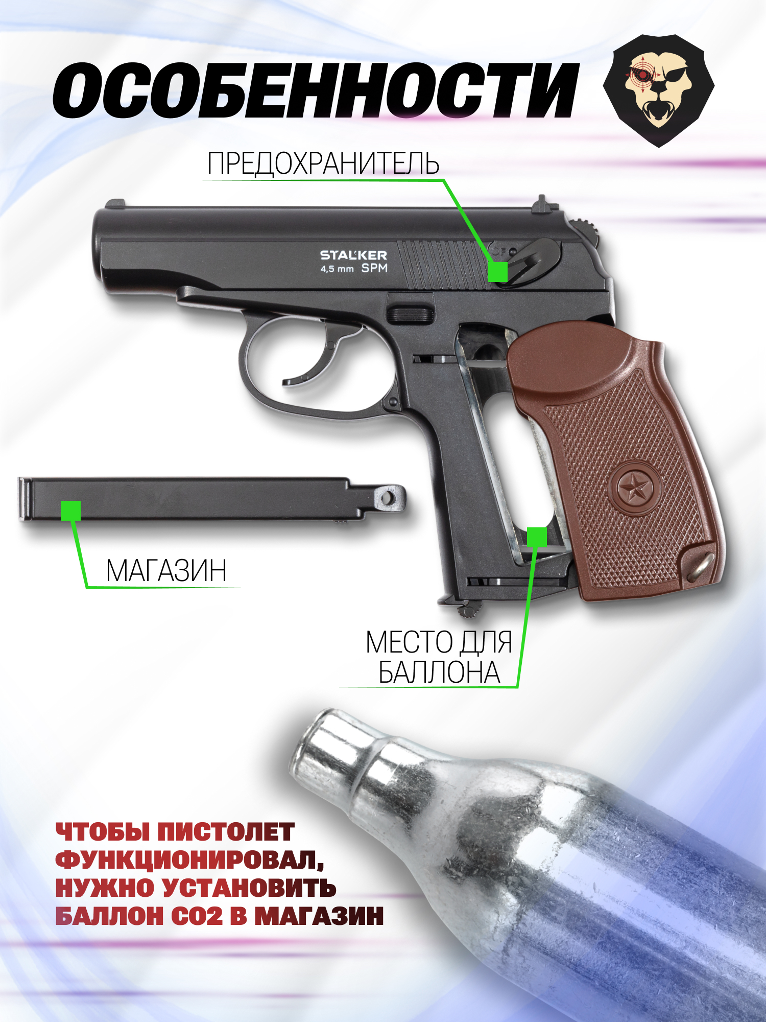 Рассматриваемый набор Хантер составлен на основе пневматического газобаллонного пистолета Stalker SPM. Модель создана по мотивам самого известного российского короткоствольного оружия, разработанного Н.Ф. Макаровым в середине двадцатого века. Благодаря простой надежной конструкции и своим характеристикам ПМ по сей день используется в служебных целях как на территории России, так и ряда других стран.
