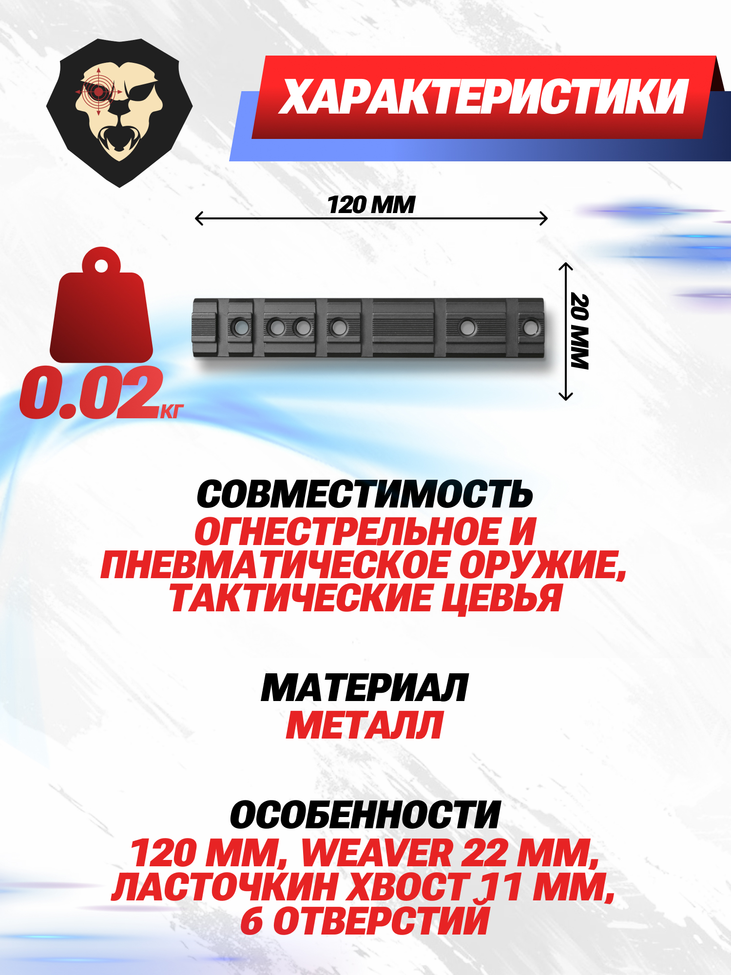 | Особенности | 120 мм, Weaver 22 мм, Ласточкин хвост 11 мм, 6 отверстий |