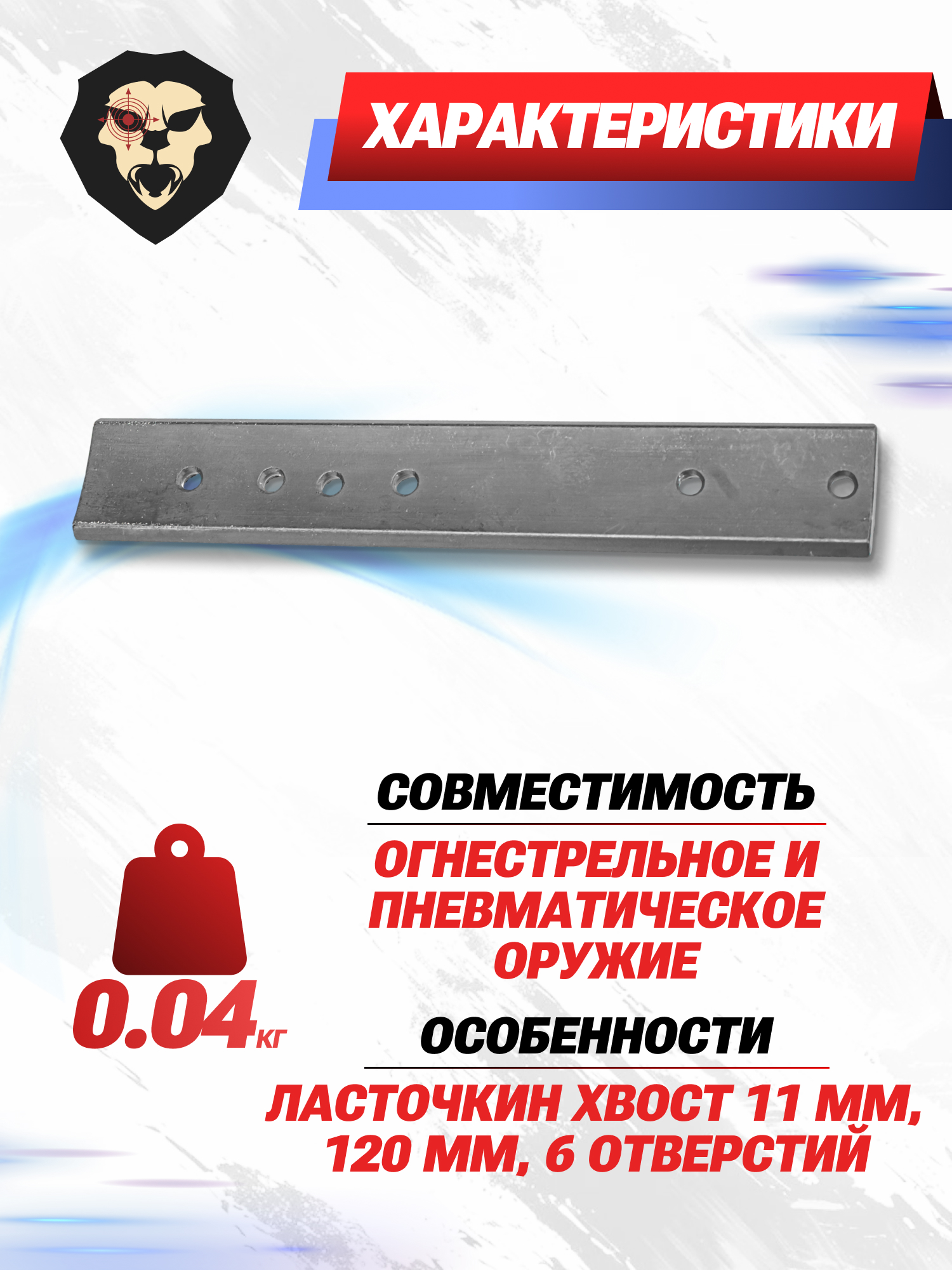 | Особенности | Ласточкин хвост 11 мм, 120 мм, 6 отверстий |