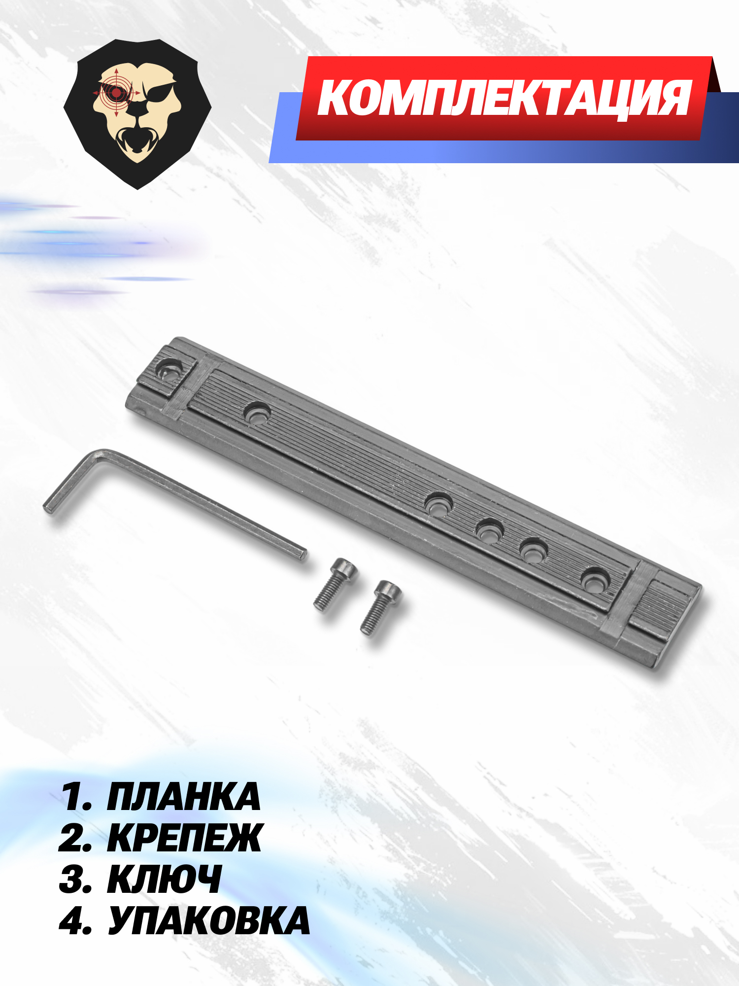 Прицельная планка Ласточкин хвост крепится к оружию посредством винтов с плоской головкой и выемкой под шестигранный ключ. Крепеж и необходимый для его установки ключ присутствует в упаковке с изделием. Выбирая обозреваемую планку следует проверить, сходится ли расположение отверстий.