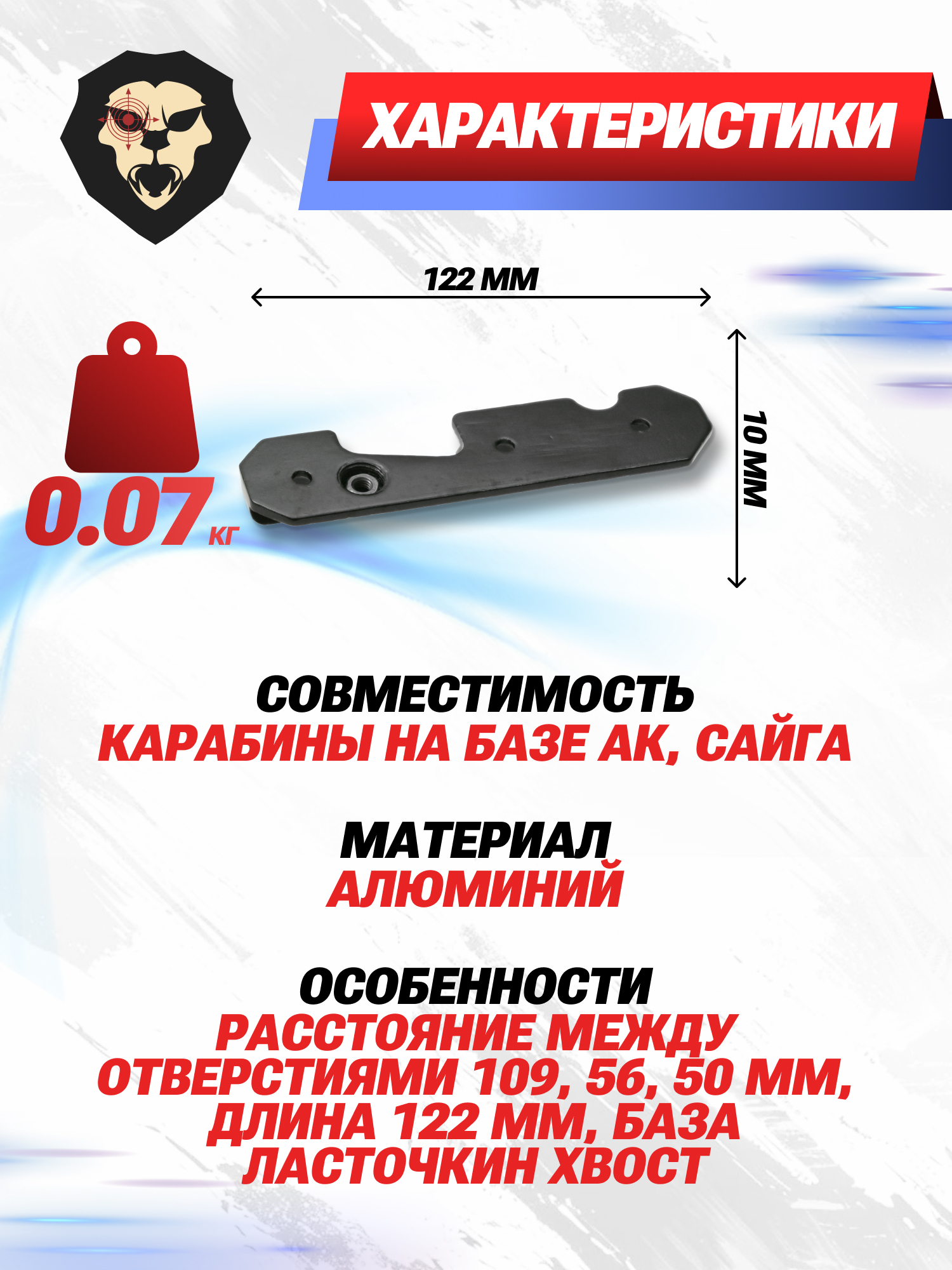| Особенности | Расстояние между отверстиями 109, 56, 50 мм, длина 122 мм, база Ласточкин хвост |