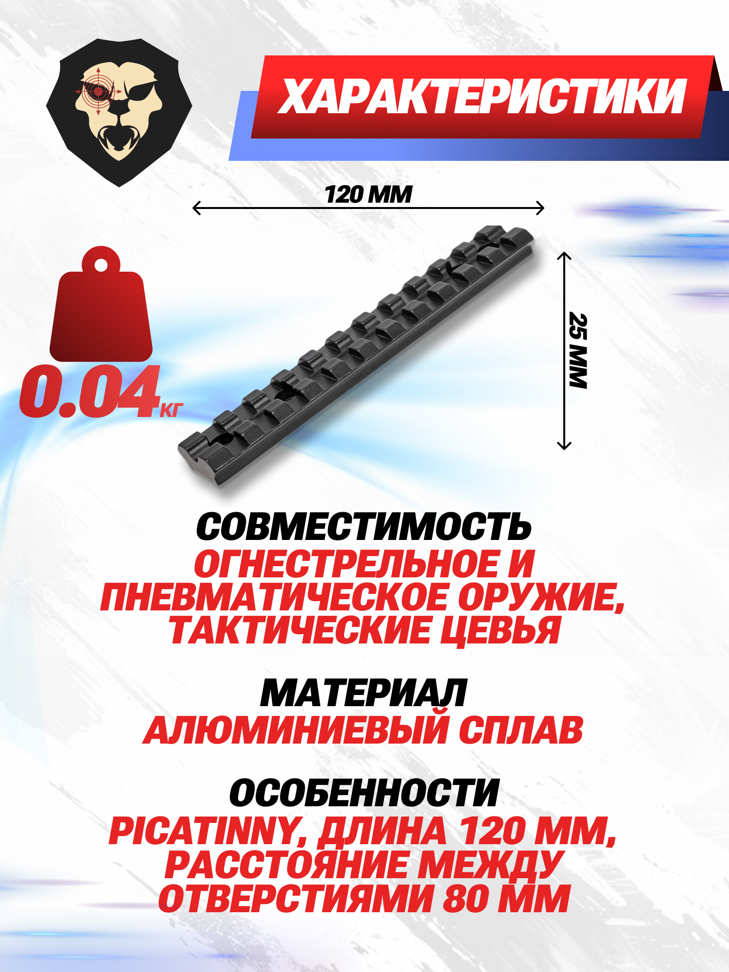 | Особенности | Picatinny, длина 120 мм, расстояние между отверстиями 80 мм |