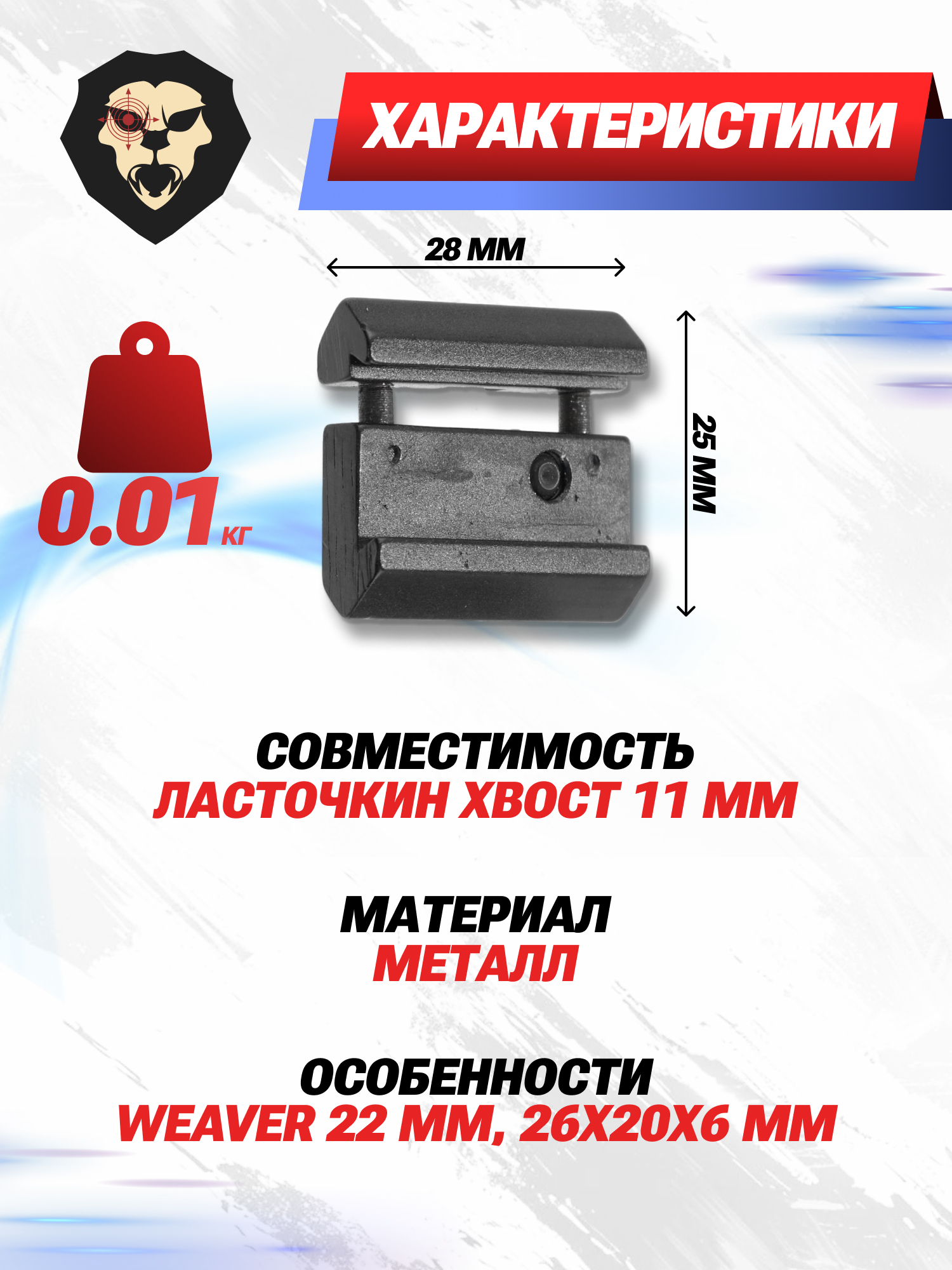 | Особенности | Weaver 22 мм, 26х20х6 мм |