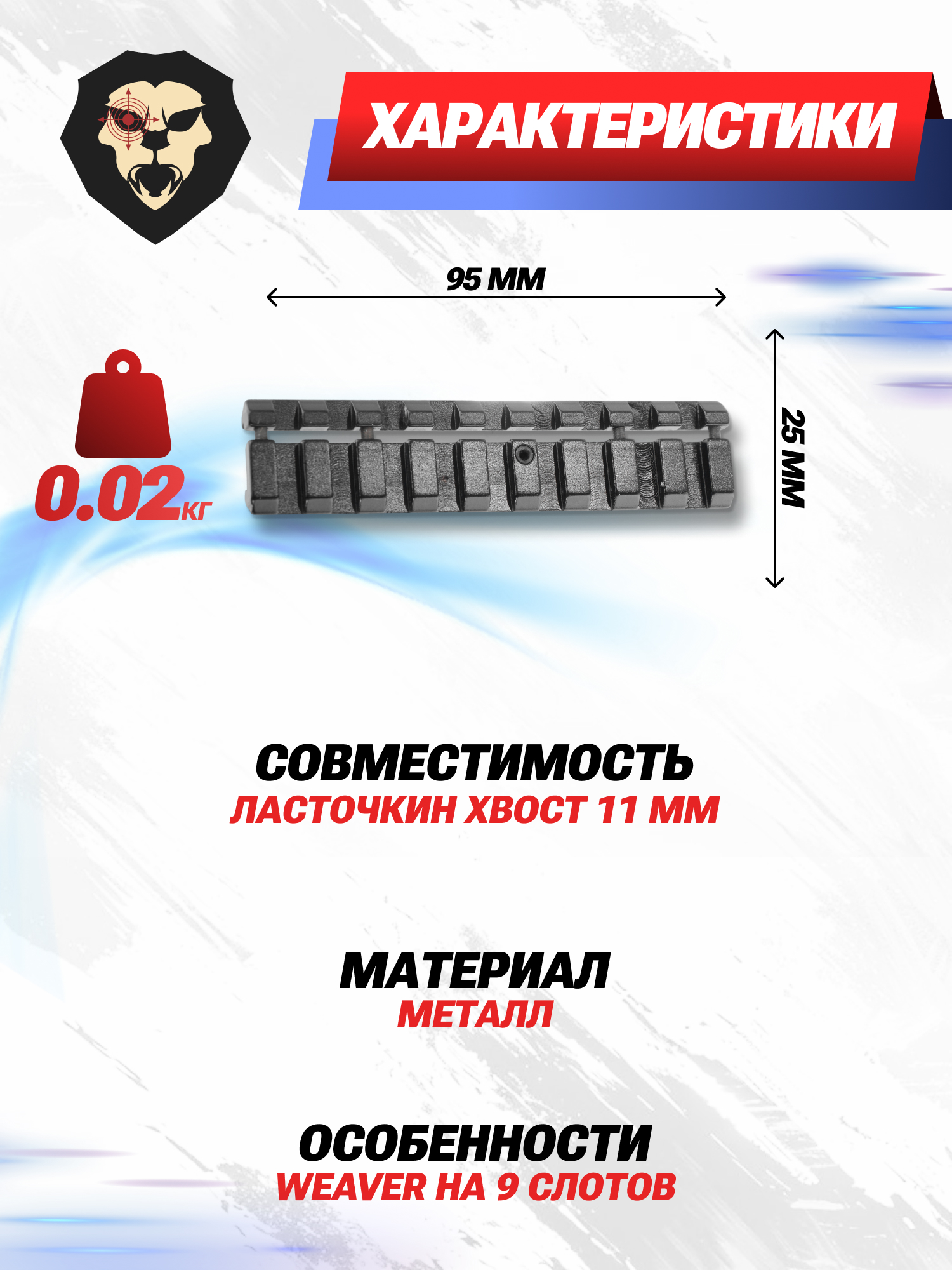 Рассматриваемый переходник Ласточкин хвост на Вивер от Patriot подходит не только под раздельные кольца - 9 слотов планки позволят разместить на ней полноценный кронштейн. Деталь изготовили из алюминия. Поверхность - анодирование.