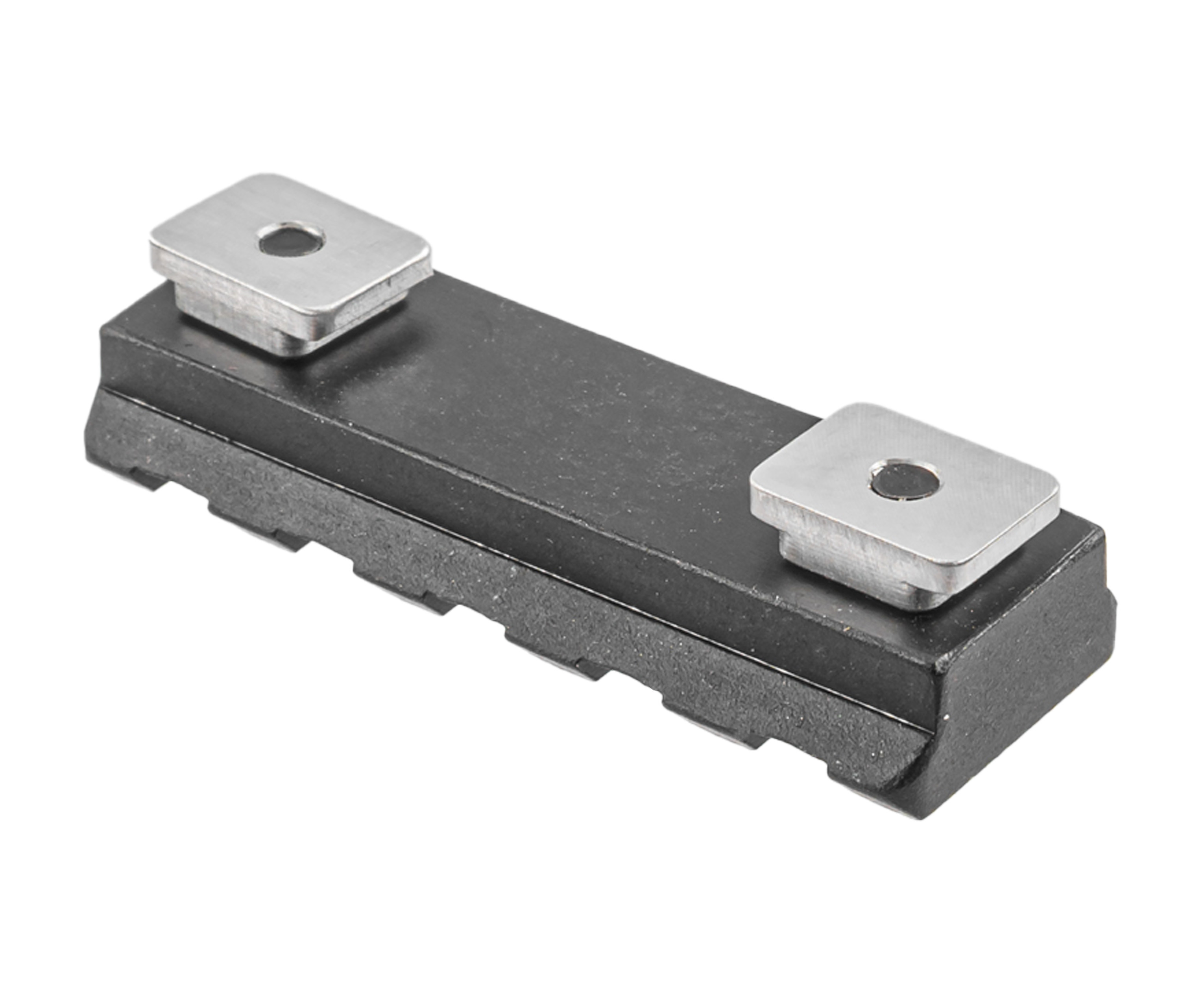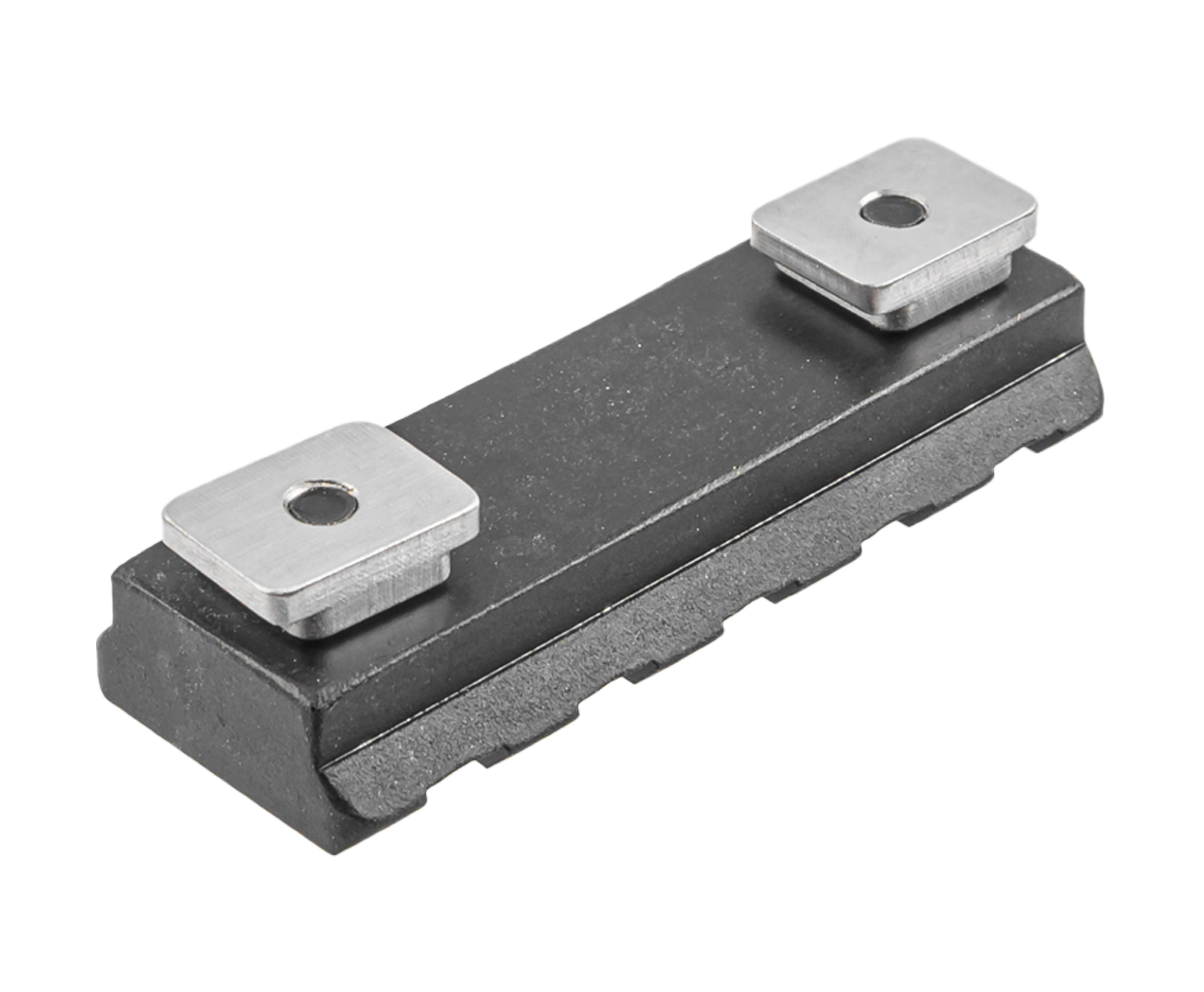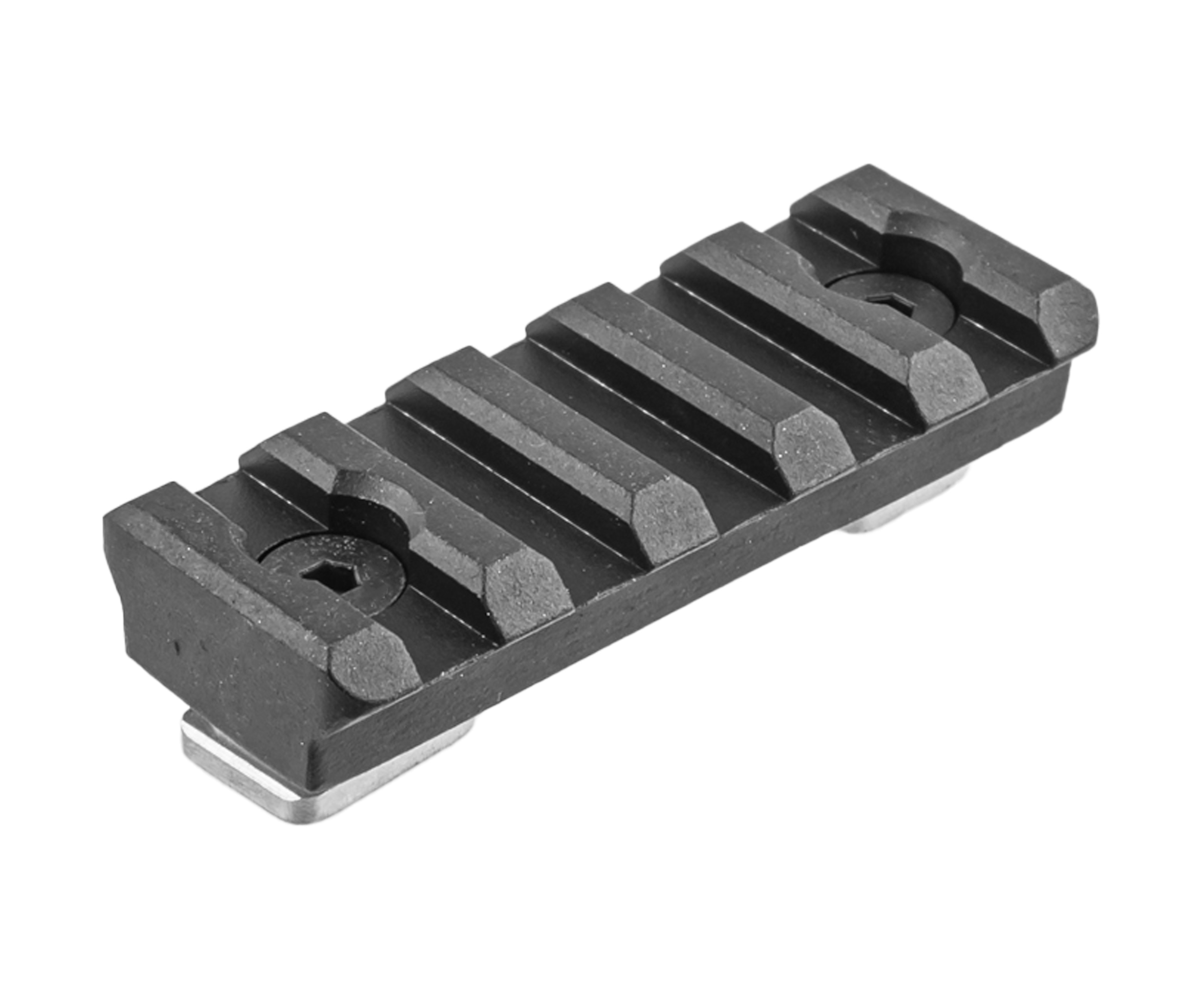Изделие металлическое, за счет чего не приходится переживать о надежности и долговечности соединения. В планке присутствуют 5 слотов для крепления. Это позволяет оставаться ей компактной, но в то же время вместимой - такого количества хватит для размещения сошек, рукоятки или лазера.