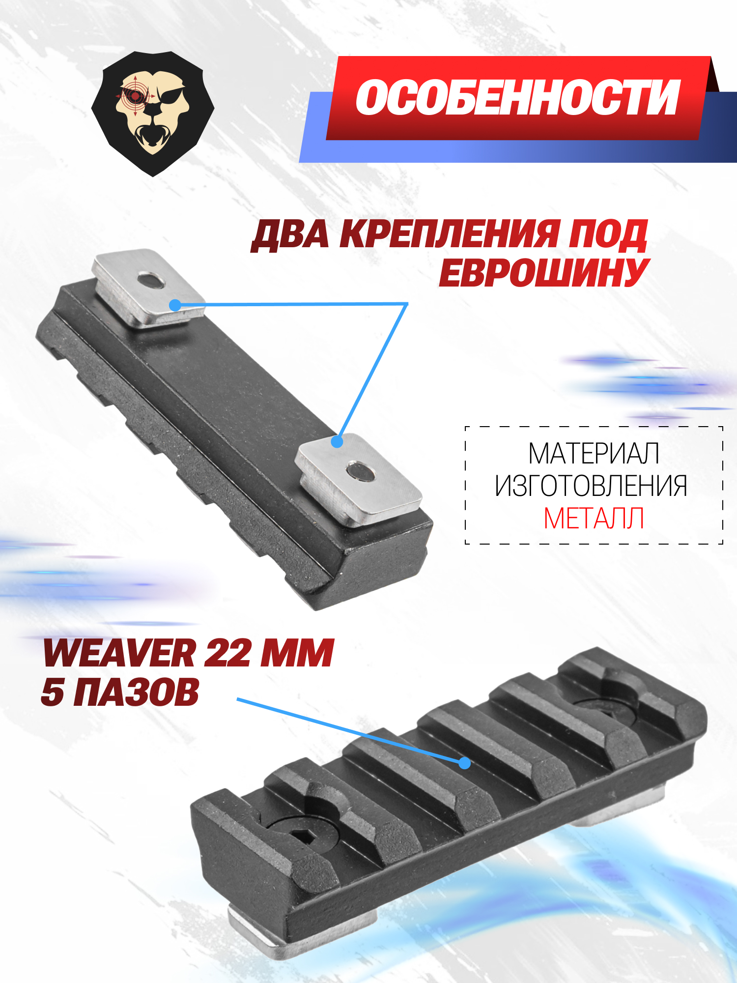 Компания НКВД оснащает часть винтовок из собственной линейки Шторм передним креплением типа Еврошина - особенность такой планки заключается в низком профиле, она не выходит за габарит цевья и соответственно не мешает удержанию тогда, когда в ней нет необходимости. Помимо аксессуаров этого же стандарта сюда можно закрепить оборудование и с иным видом монтажа, в чем поможет планка переходник на Вивер 22 мм. Деталь подходит не только к указанной пневматике, но и другому оружию с таким же креплением.