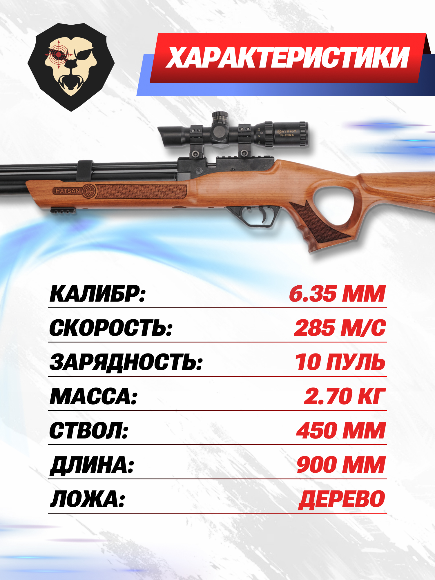 Информация о товаре "Пневматическая винтовка Hatsan Flash W 6.35 мм (PCP, дерево)" носит ознакомительный характер, и не является публичной офертой, определяемой положениями Статьи 437 Гражданского кодекса Российской Федерации, характеристики, внешний вид, цвет и комплектация могут быть изменены производителем без уведомления.