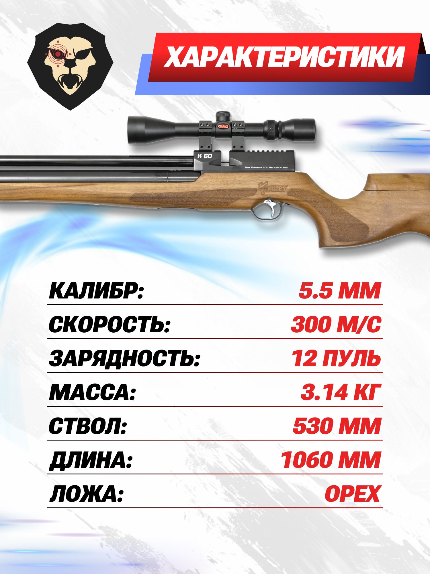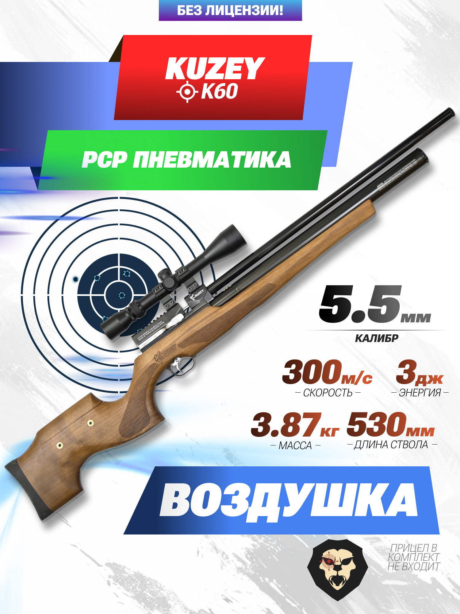 В России пневматическая PCP винтовка Kuzey K60 5.5 мм приобретается свободно благодаря снижению мощности выстрела изготовителем в пределе, не превышающем отметку три Джоуля. Для других стран такого ограничения не предусмотрено, что позволяет при стрельбе из штатного образца пневматики разгонять пулевой снаряд до скорости больше 300 метров в секунду и метко поражать цели, расположенные на большом отдалении.