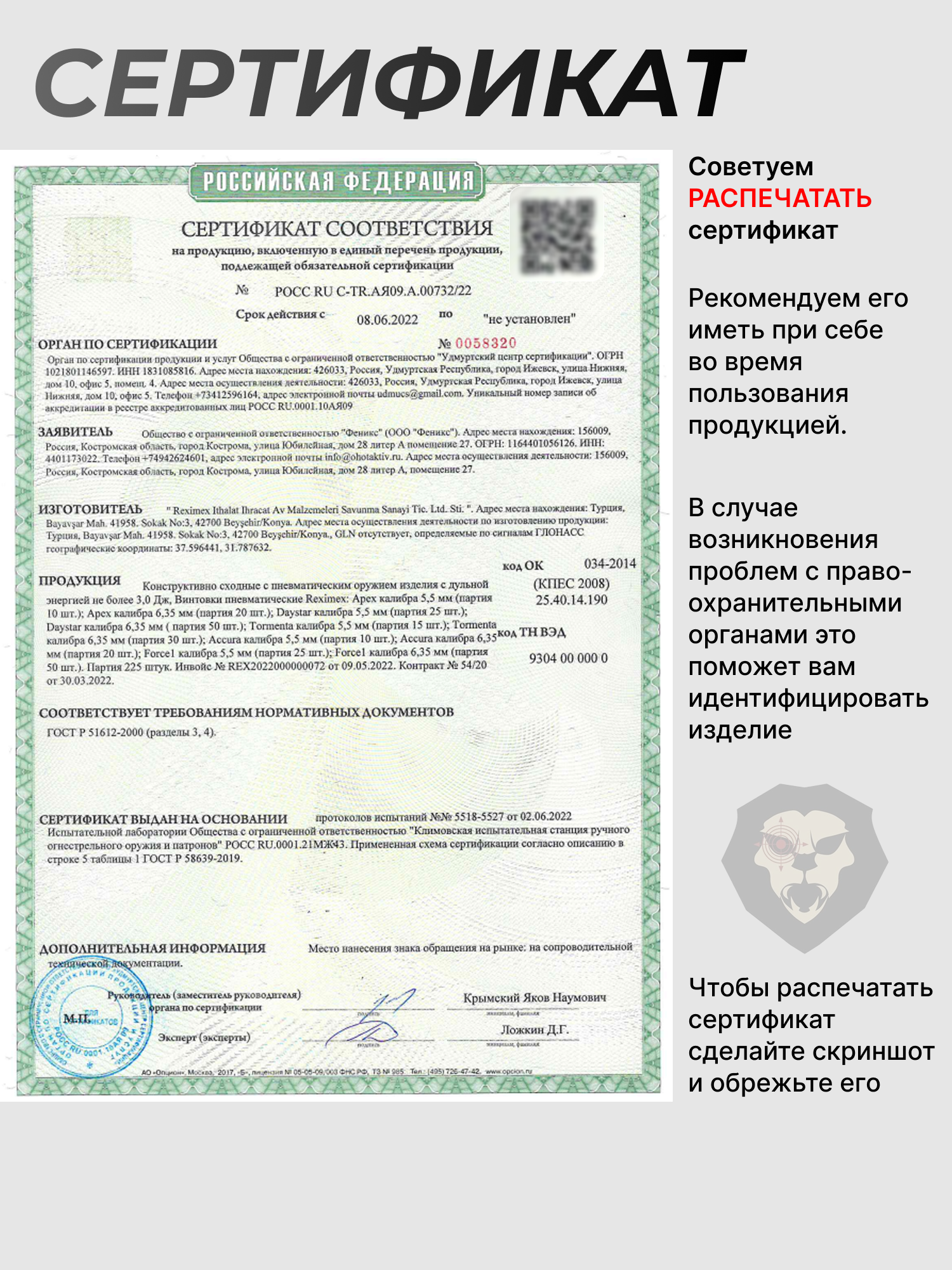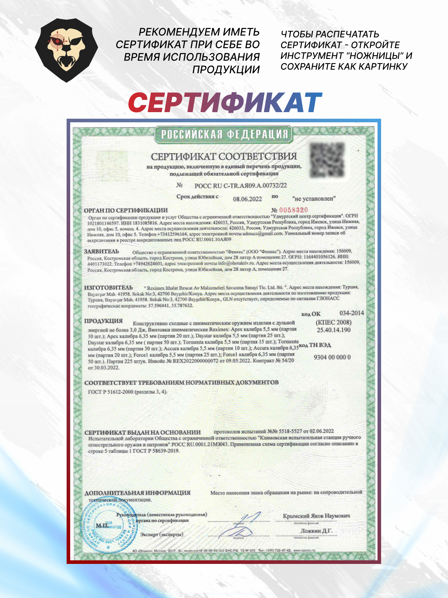 Как и другие модели турецкой фирмы Рексимекс, обозреваемый образец приобретается без требования к наличию лицензии, так как мощность винтовки перед продажей ограничивается до 3-х Дж. Однако заявленные заводские показатели начальной скорости снаряда, выпущенного из пневматики, достигают 270 м/с.