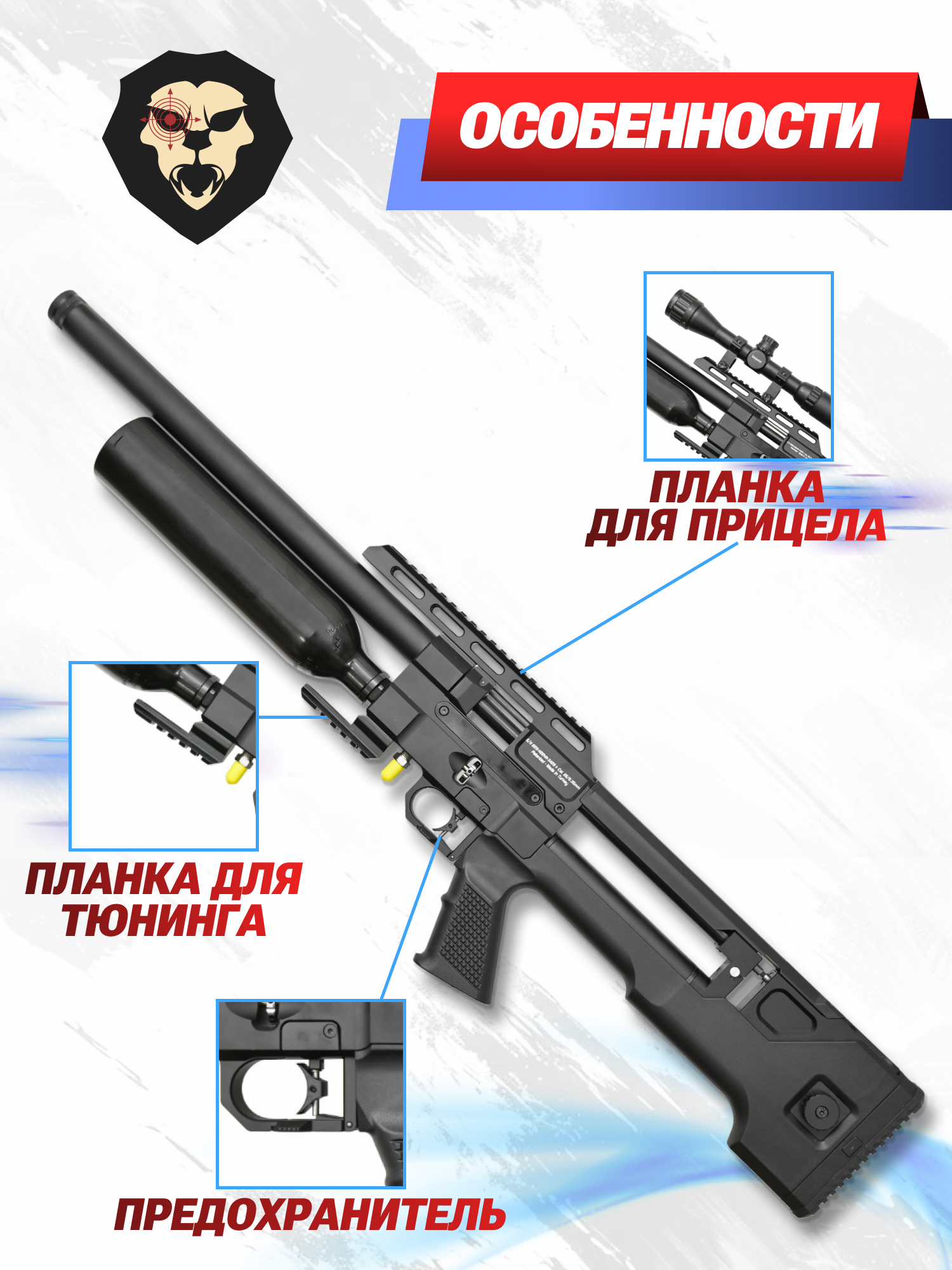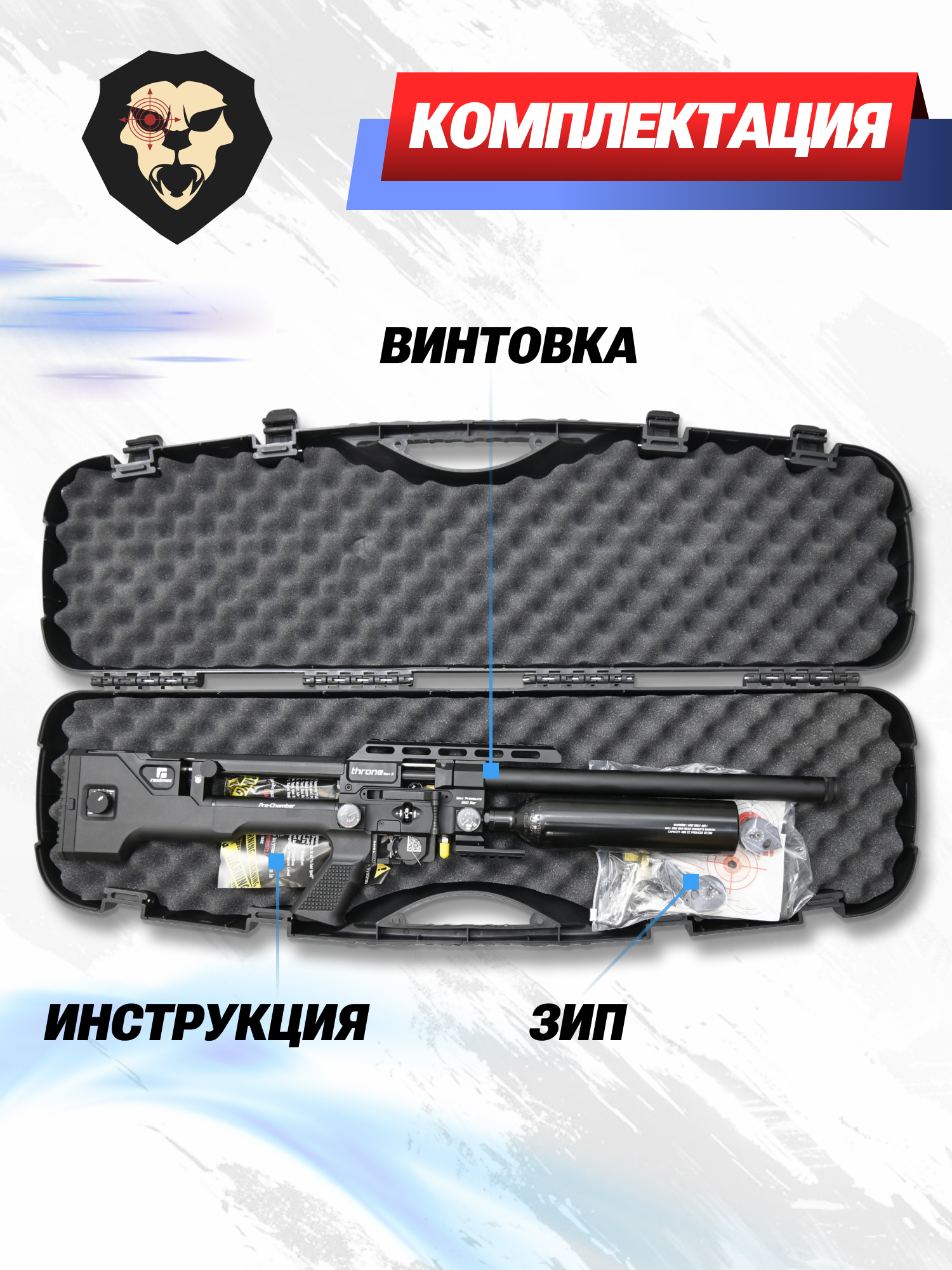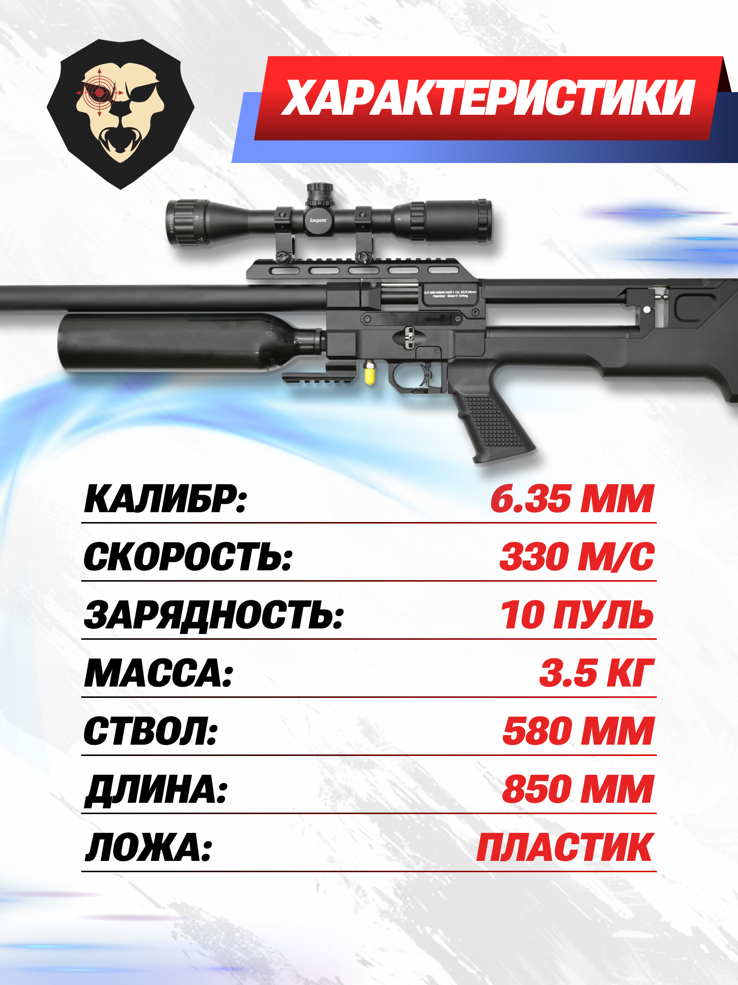 | Комплектация | Винтовка, упаковка, заправочный штуцер, набор уплотнителей, два магазина, краткая документация, копия сертификата (по запросу покупателя) |