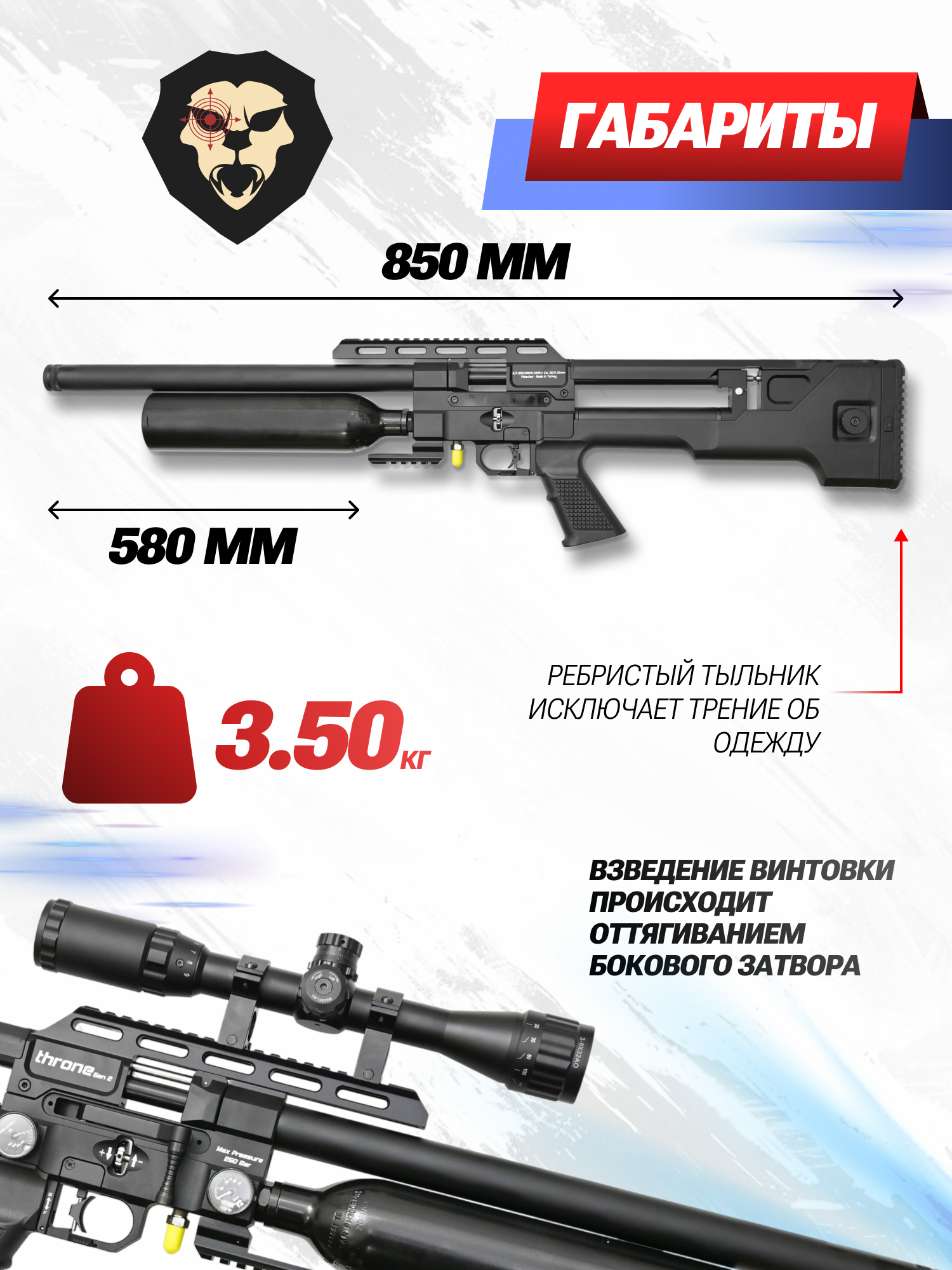 Новейшая пневматическая винтовка Reximex Throne второго поколения сравнительно недавно посетила российский прилавок. Как и предшественница, модель выполнена по схеме bull-pup, при которой спусковой механизм и органы управления винтовкой выносятся перед магазином. Благодаря такой компоновке 580 миллиметровый стволик пневматики занимает добрую половину размера экземпляра, который составляет 850мм