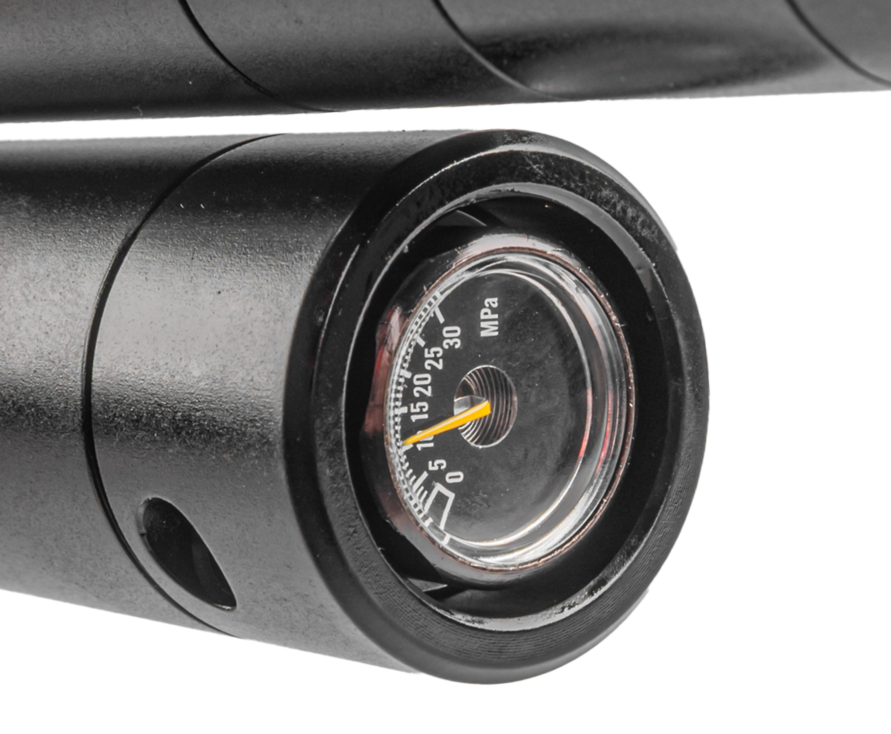 Для подключения к ручному или электрическому насосу используется съемный штуцер, вставляемый в переднюю пробку ресивера. Контролировать поступление воздуха позволит встроенная шкала манометра.