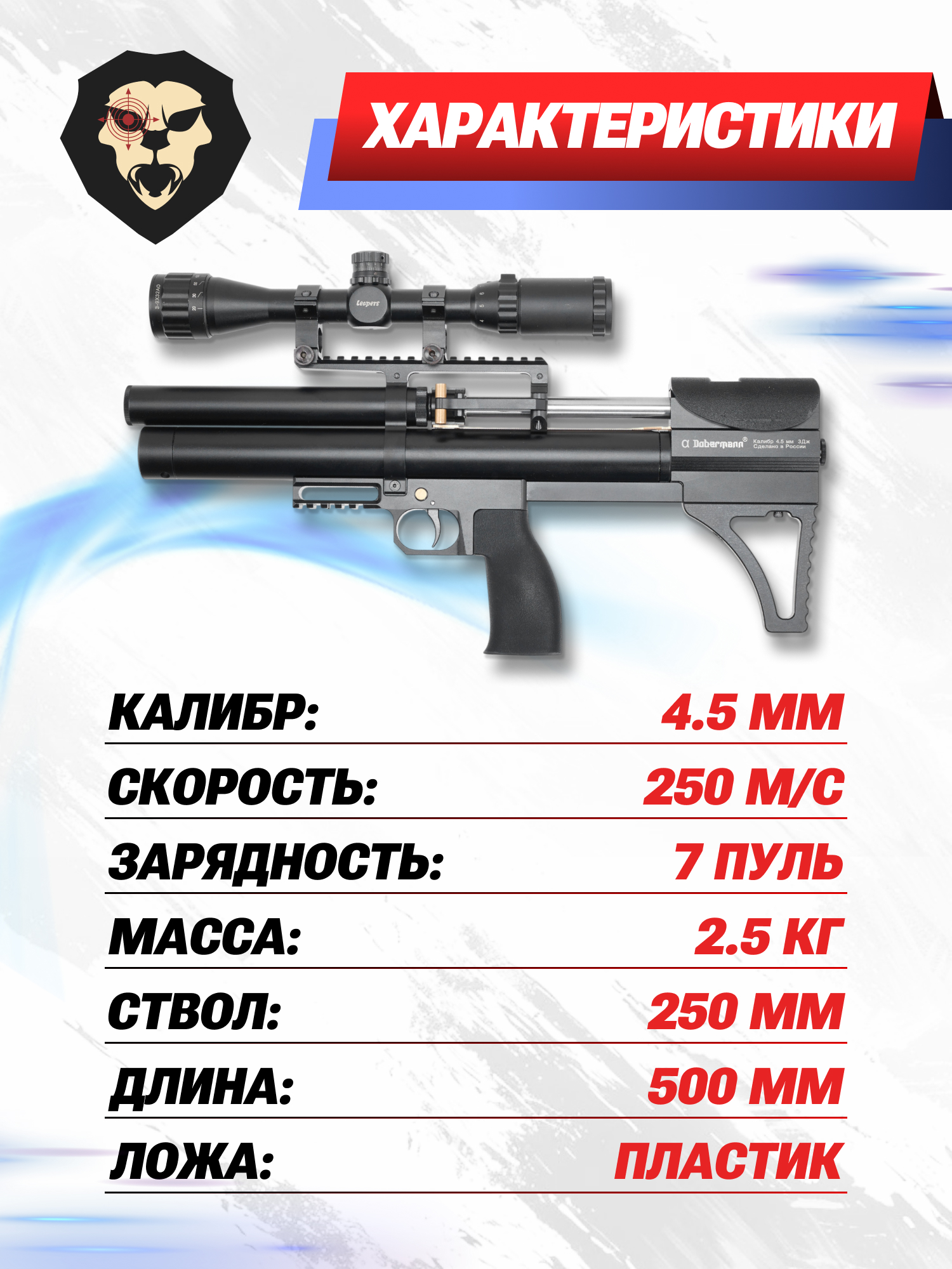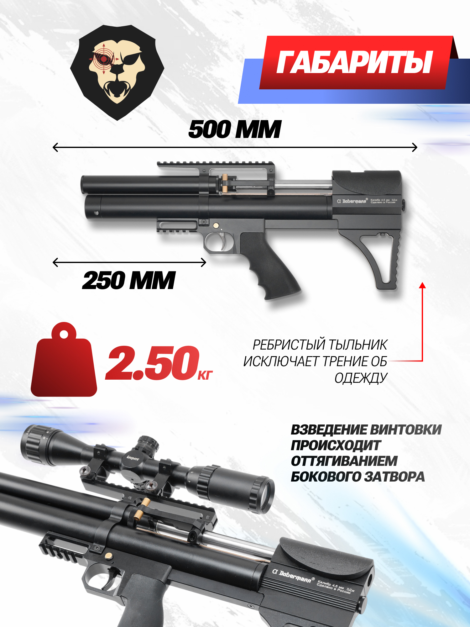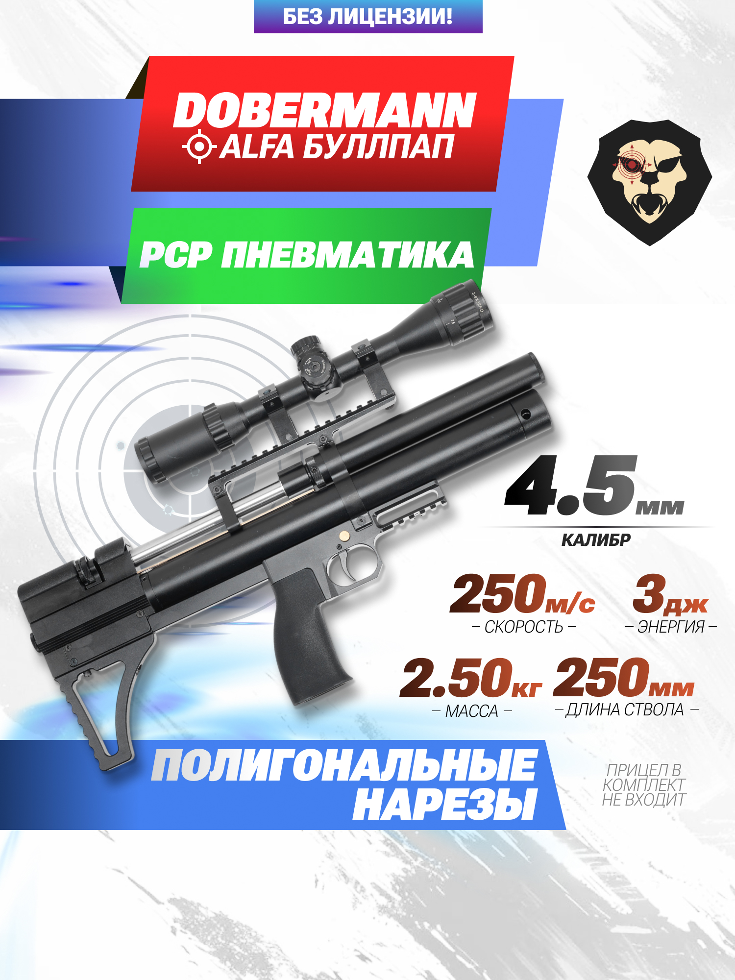 Информация о товаре "Пневматическая винтовка Dobermann Alfa Буллпап 4.5 мм (250 мм, полигональные нарезы, передний взвод)" носит ознакомительный характер, и не является публичной офертой, определяемой положениями Статьи 437 Гражданского кодекса Российской Федерации, характеристики, внешний вид, цвет и комплектация могут быть изменены производителем без уведомления.