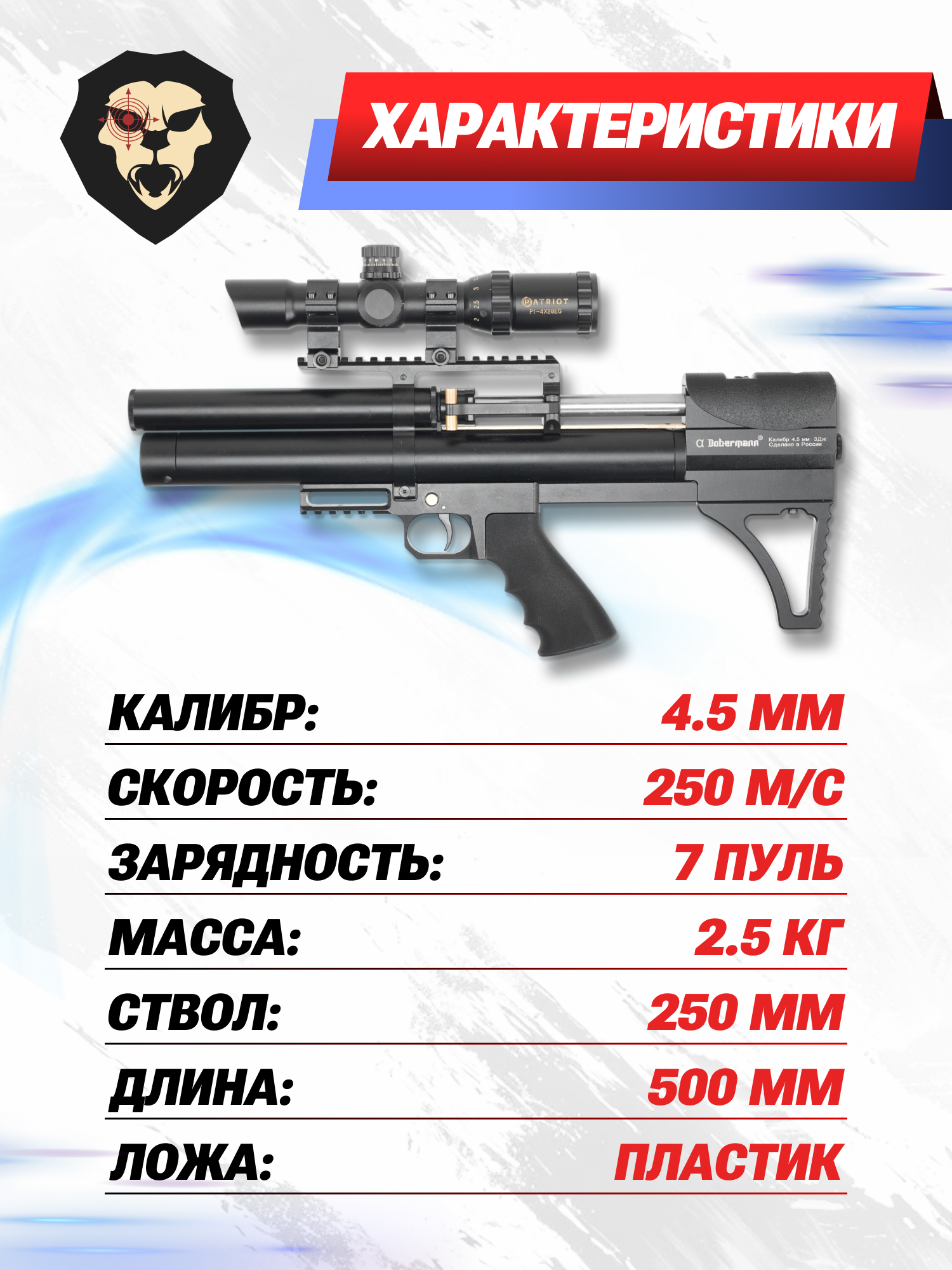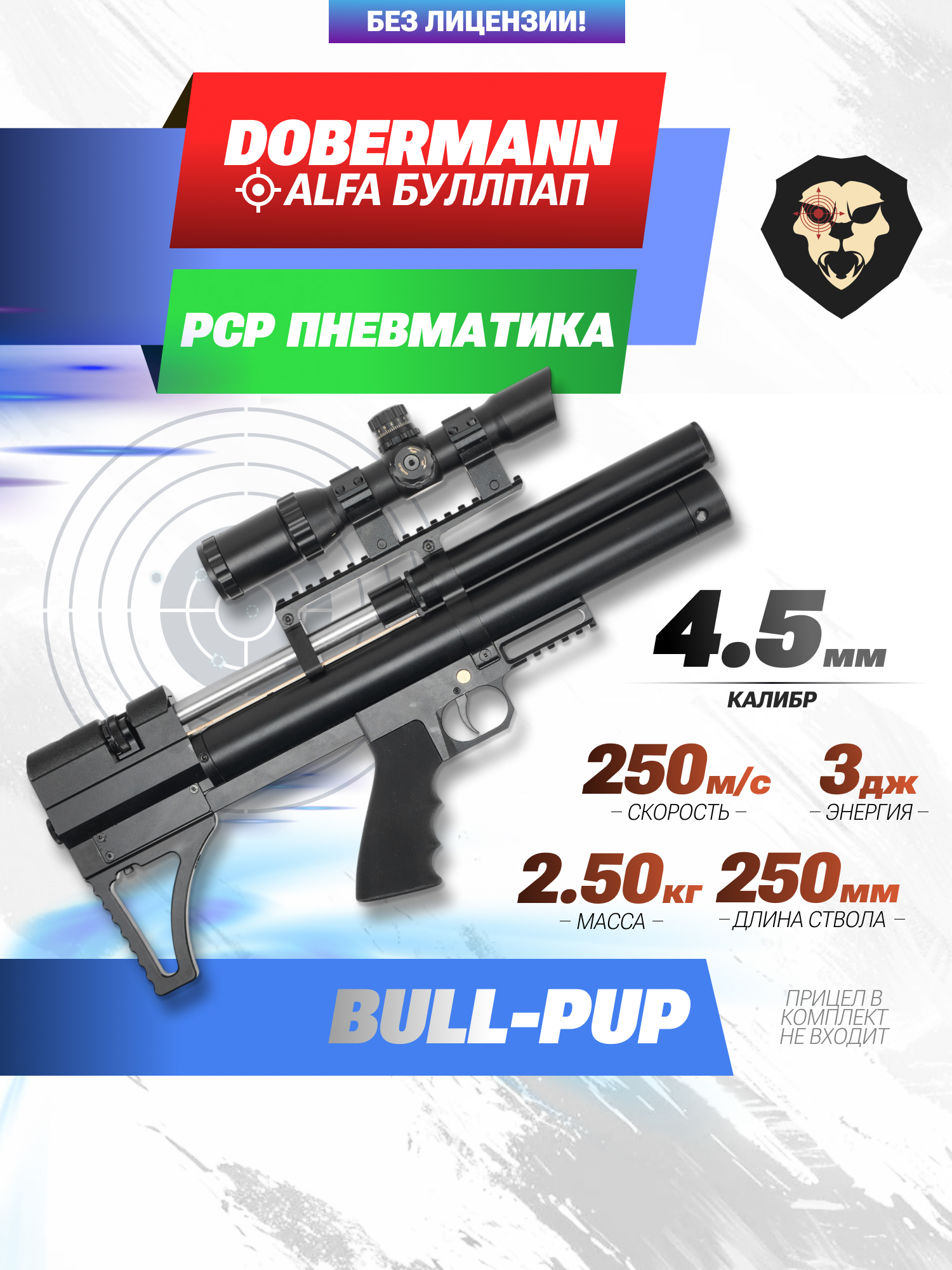 Информация о товаре "Пневматическая винтовка Dobermann Alfa Буллпап 4.5 мм (250 мм, стандартные нарезы, передний взвод)" носит ознакомительный характер, и не является публичной офертой, определяемой положениями Статьи 437 Гражданского кодекса Российской Федерации, характеристики, внешний вид, цвет и комплектация могут быть изменены производителем без уведомления.