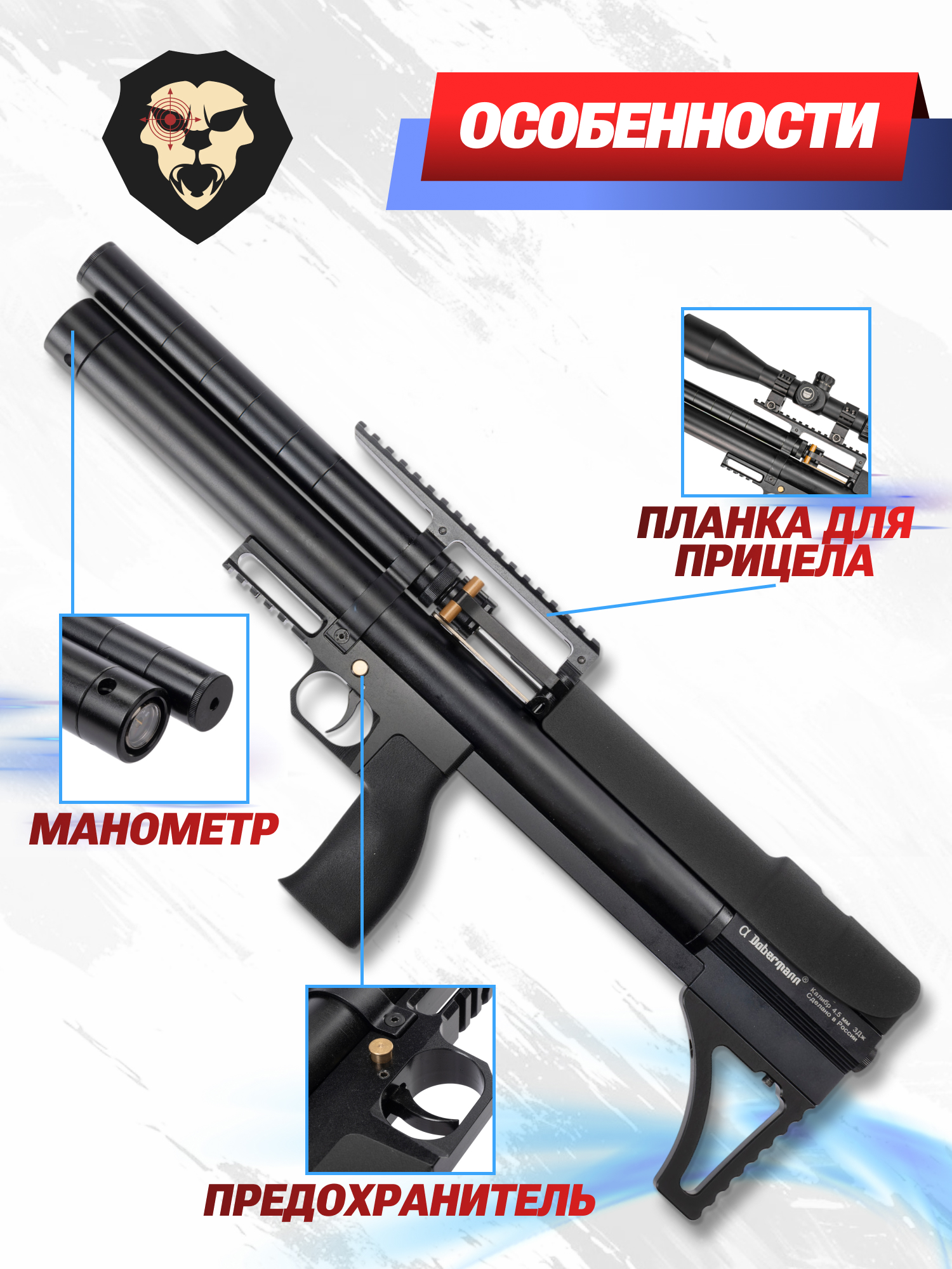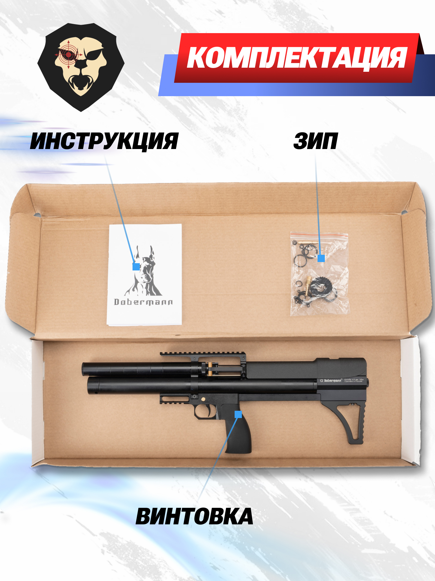 Dobermann винтовка характеризуется строением с редукторным принципом распределения воздуха из ресивера в ствол. Исходя из этого, у будущего владельца будет возможность отрегулировать систему под собственные нужды, выставив требуемое давление. При этом максимальный рабочий показатель в самом резервуаре равен 250 Бар.