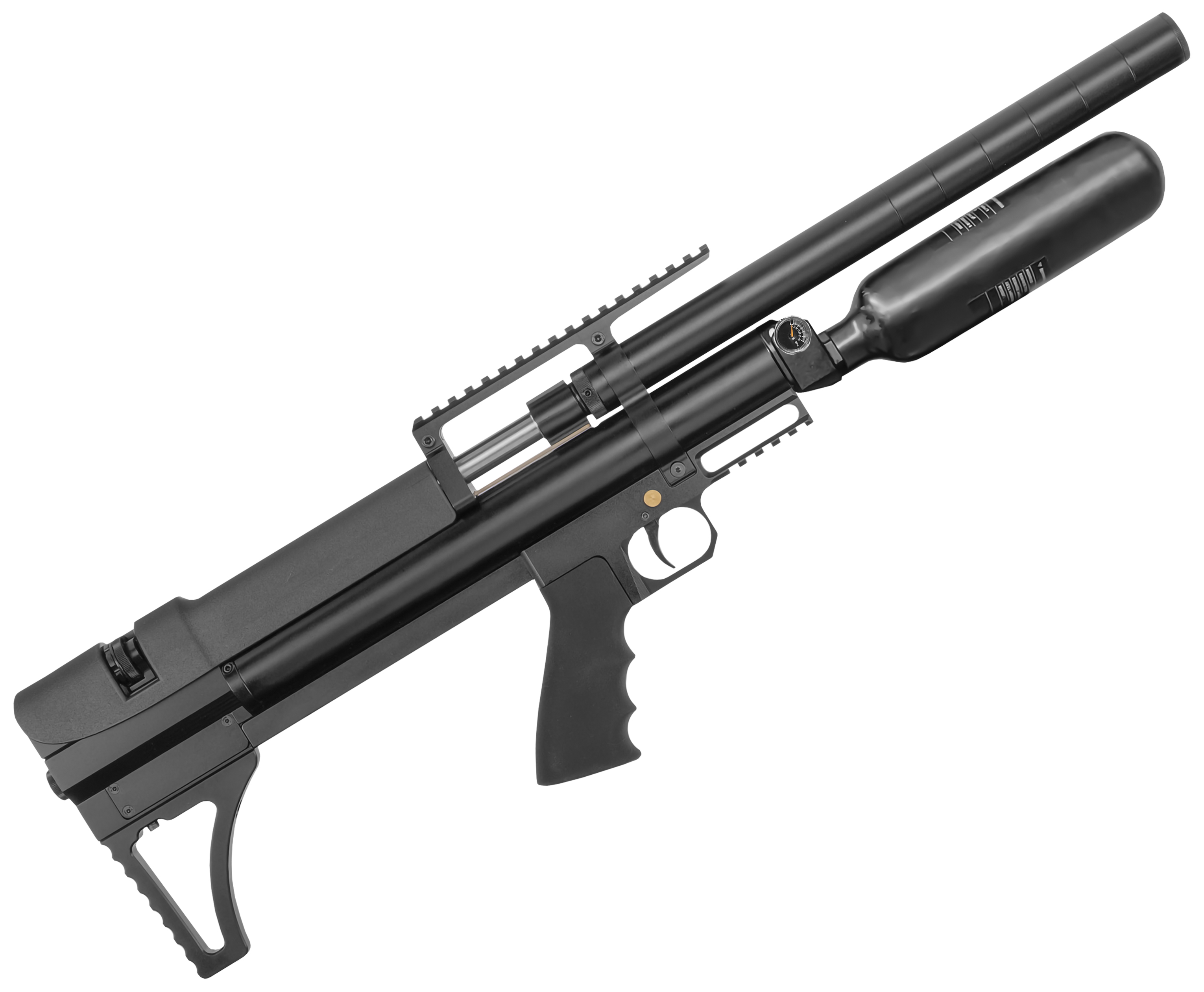 Такое исполнение получили популярные модели винтовок Alfa Bull-Pup от российской компании Dobermann. В представленном экземпляре колбовый ресивер работает в связке со стволом 450 мм, причем баллон не выступает за границы бланка и минимально сказывается на эргономических качествах. В то же время внутрь накачивается больший объем газа, что отражается на автономности эксплуатации оружия.