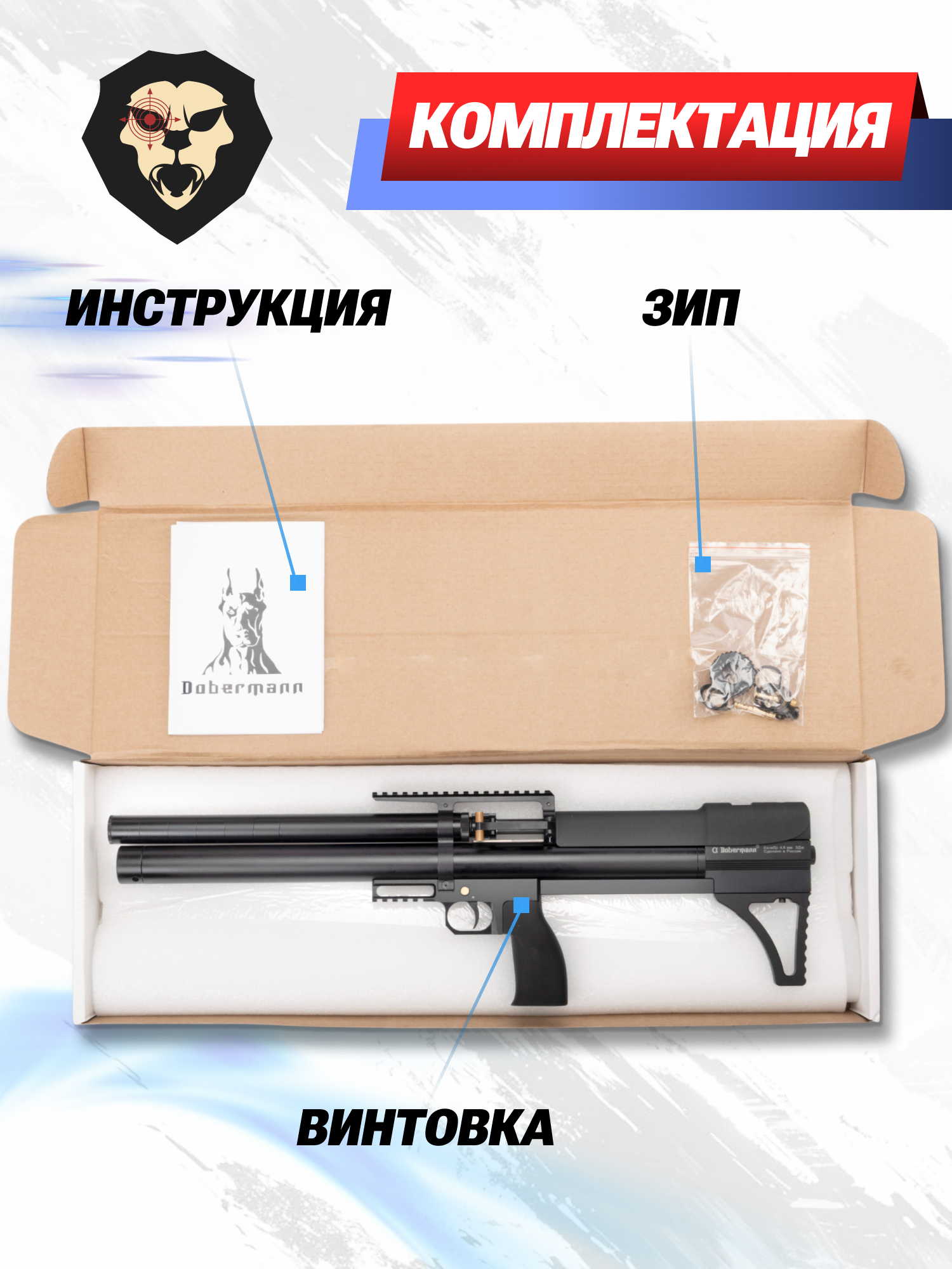 Doberman винтовка оснащена стволом классического калибра - размер канала ствола составляет 4.5 мм, за счет чего у пользователя будет доступ к наиболее широкому каталогу пневматических пуль. Потенциал винтовки позволит раскрыть все достоинства указанного размера зарядов - конструктив рассчитан на разгон таких снарядов до 300 метров в секунду. В то же время в российских образцах ограничивают проходное отверстие перепуска так, чтобы параметр мощности не выходит за отметку в 3 Дж.