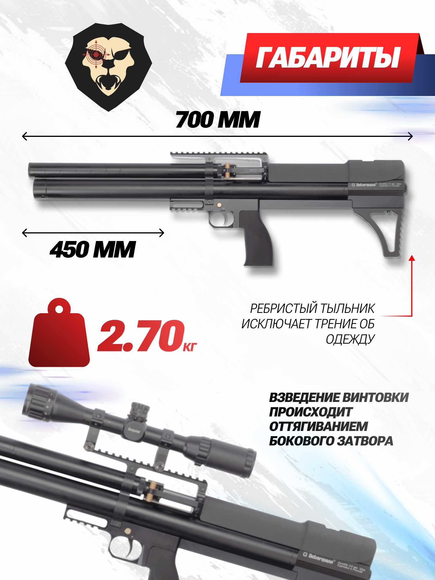 | Комплектация | Винтовка, магазин - 1 шт, упаковка, заправочный штуцер, краткая документация, копия сертификата (по запросу покупателя) |