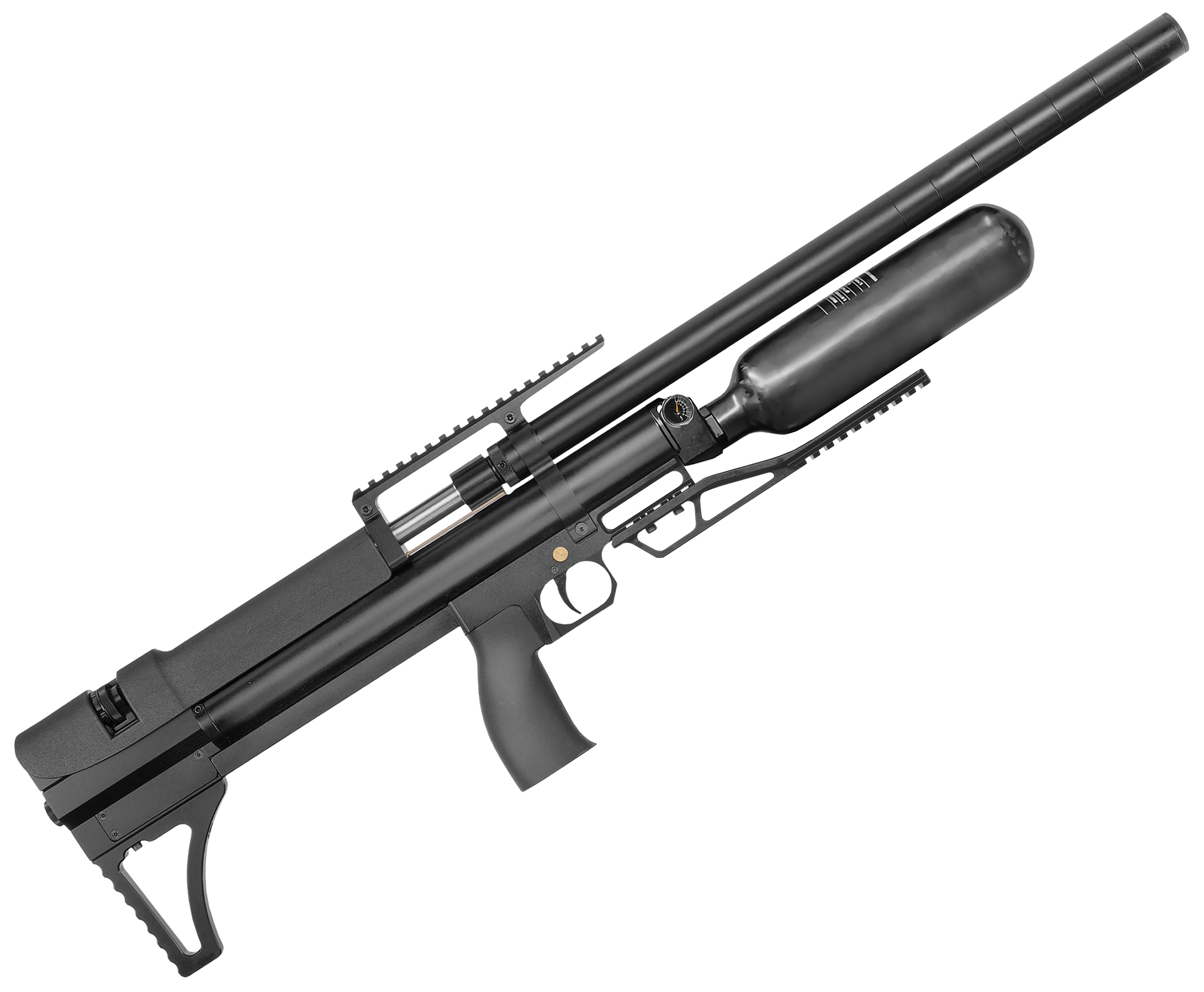 Серия Alfa BullPup всегда стояла у любителей пневматики с преднакачкой на особом счету благодаря продуманной конструкции и компактности. Обозреваемая модификация стала еще привлекательнее за счет предустановленной заводской колбы. Альтернативное хранилище по умолчанию имеет объем 345 куб. см, причем инженеры удачно совместили его с классическим линейным резервуаром, что в итоге позволило дополнительно увеличить вместимость до 550 кубических см.
