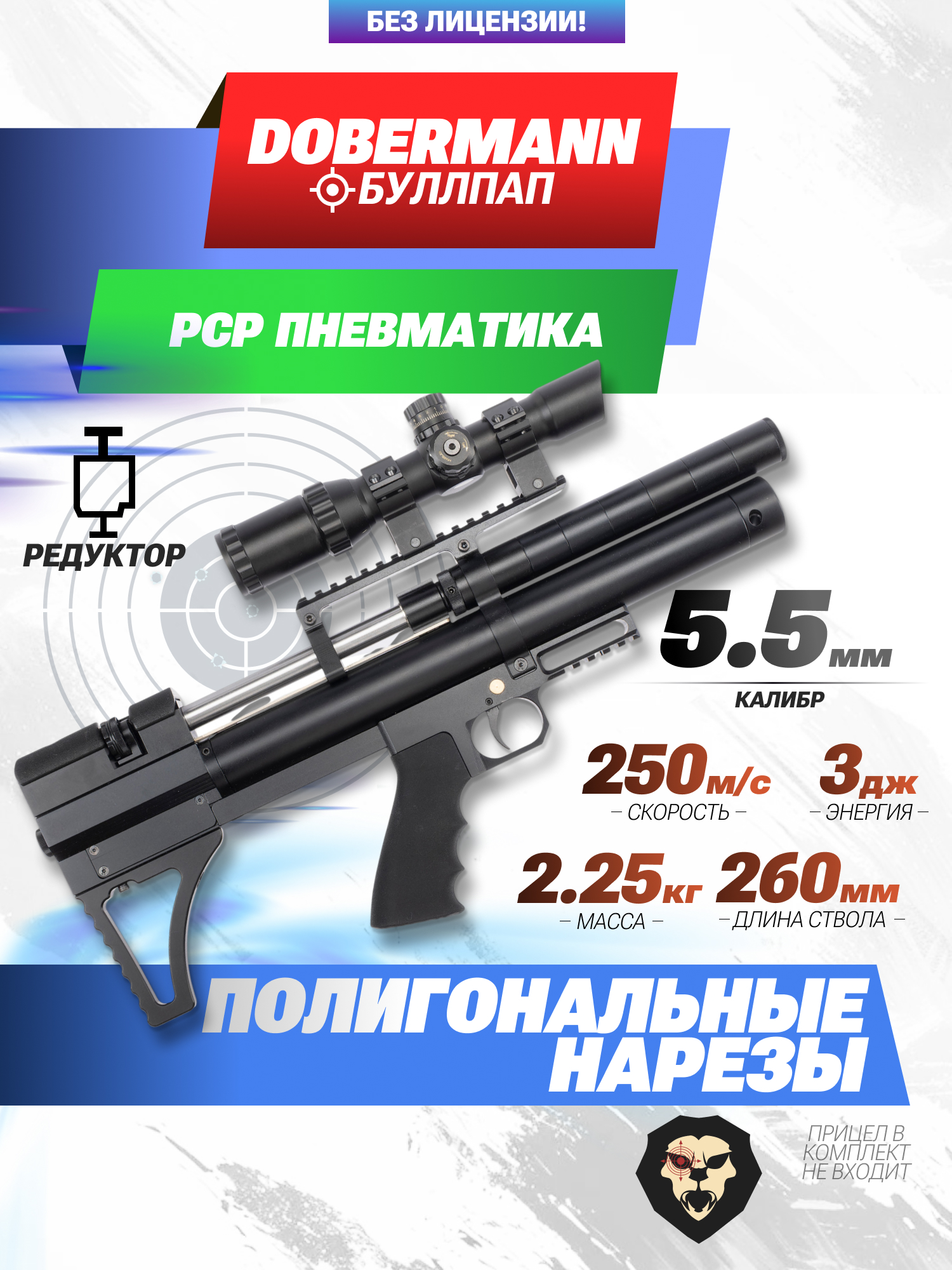 Ключевое достоинство пневматики PCP типа заключается в разнообразии доступных вариаций исполнения, таким образом, каждый подберет оружие по душе. Модельный ряд винтовок с таким принципом устройства по привлекательной цене предлагает российская компания Dobermann. Из ассортимента бренда пристального внимания заслуживают экземпляры в Булл-Пап компоновке.