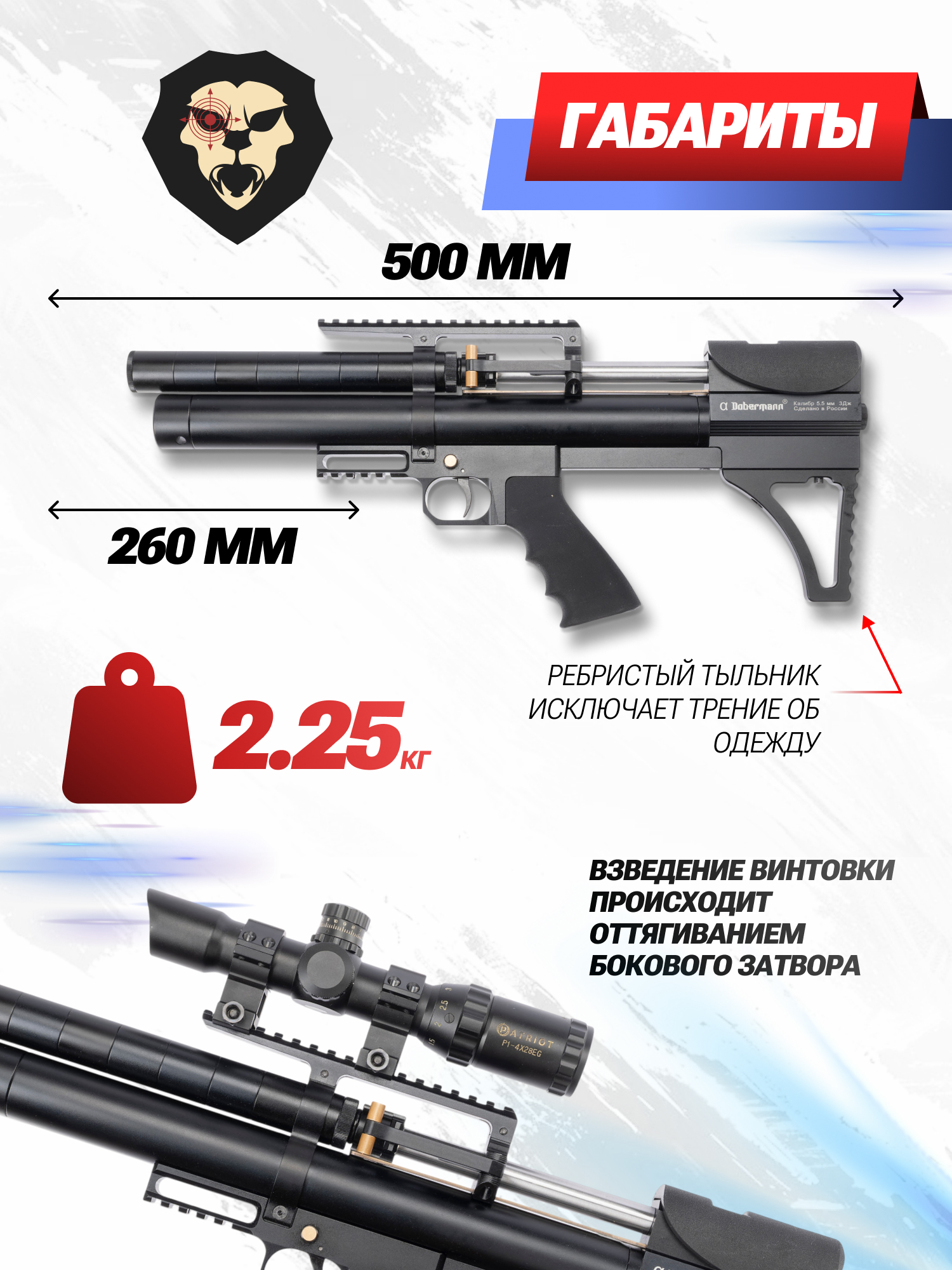 Такие образцы компактны и эргономичны, а благодаря вариативности можно легко подобрать подходящее сочетание параметров, включая ствол подходящей длины нужного калибра. Обозреваемая ПСП винтовка Доберман оснащается бланком 260 миллиметров - самым коротким в линейке, что дополнительно укорачивает общий размер изделия.