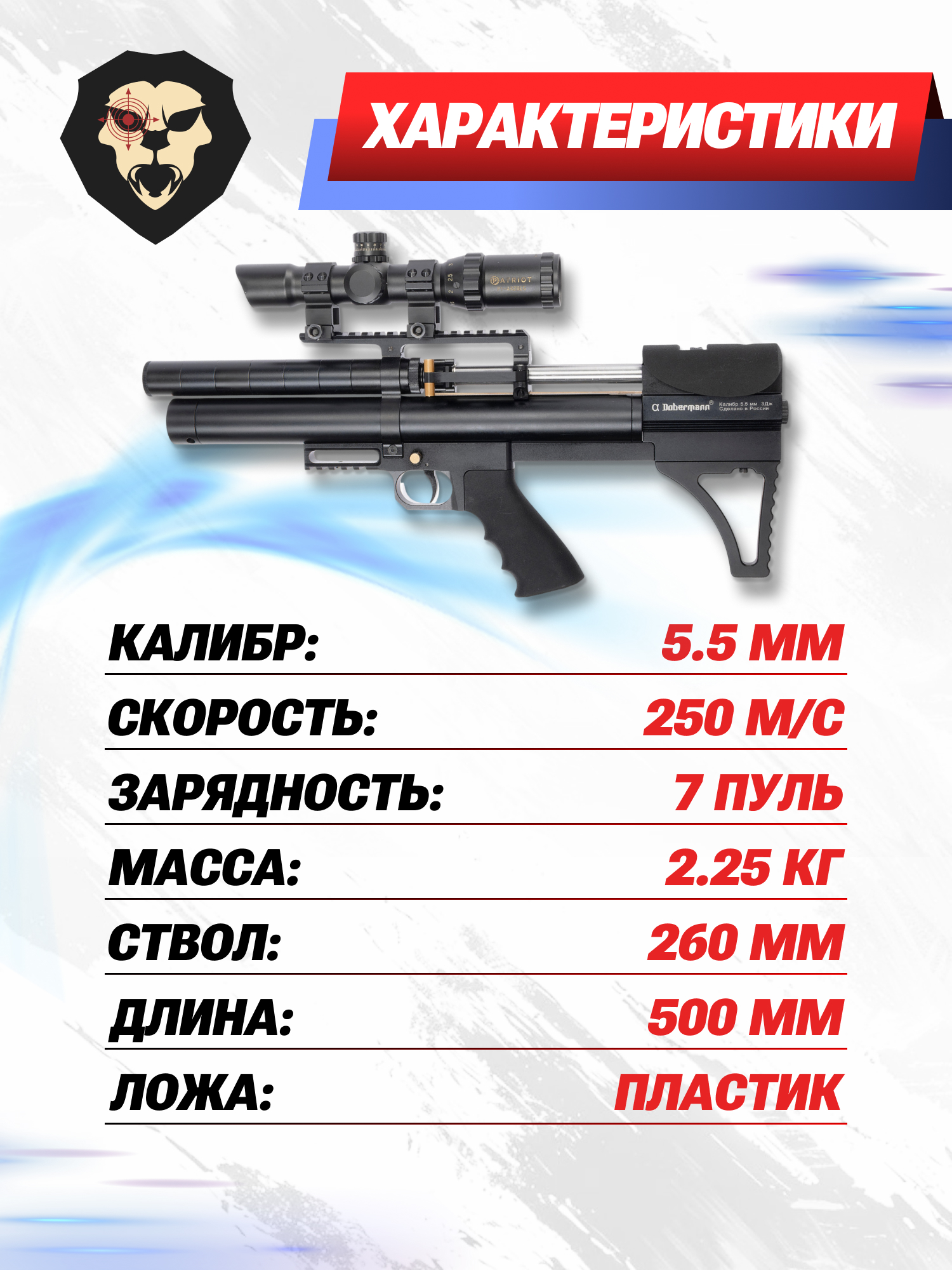 Конструкция винтовки Доберман подразумевает использование боеприпасов калибром 5.5 мм. Их теоретическая скорость вылета из канала достигает 250 метров в секунду. Тем не менее, в заводском исполнении на территории РФ разогнать так пулю не выйдет, что объясняется ограничением мощности до 3 Дж - в свою очередь, это дает каждому желающему завладеть пневматикой без лицензии.