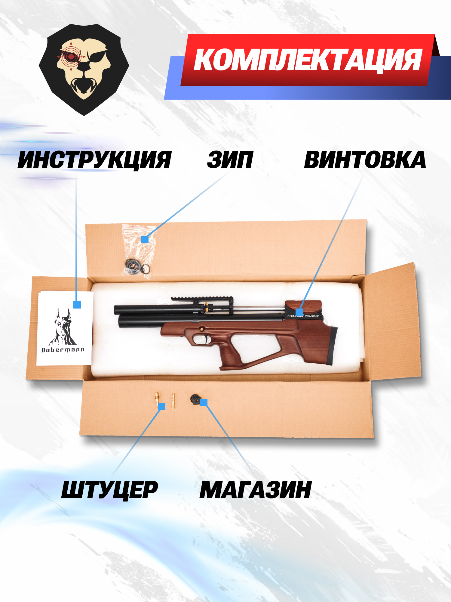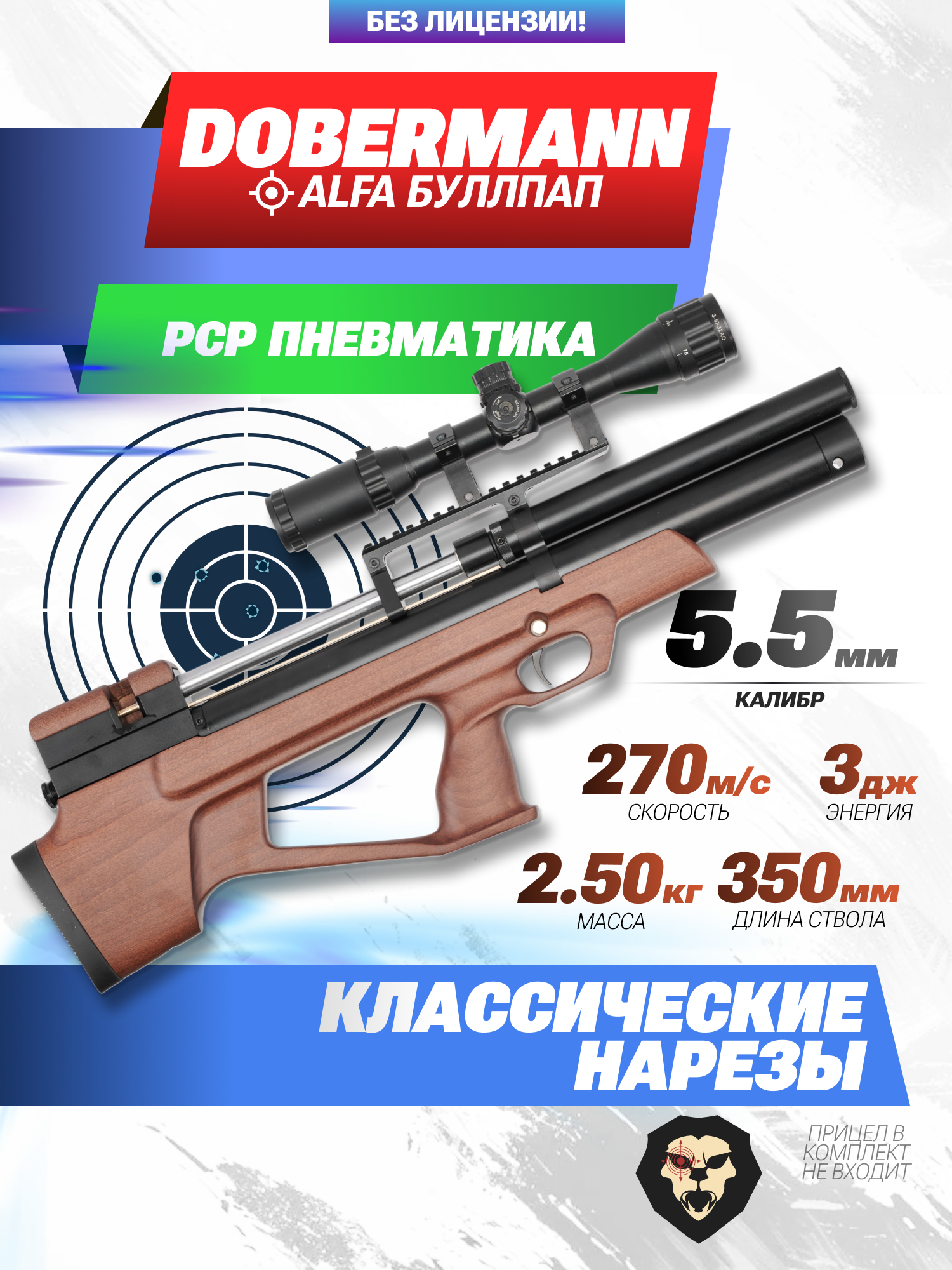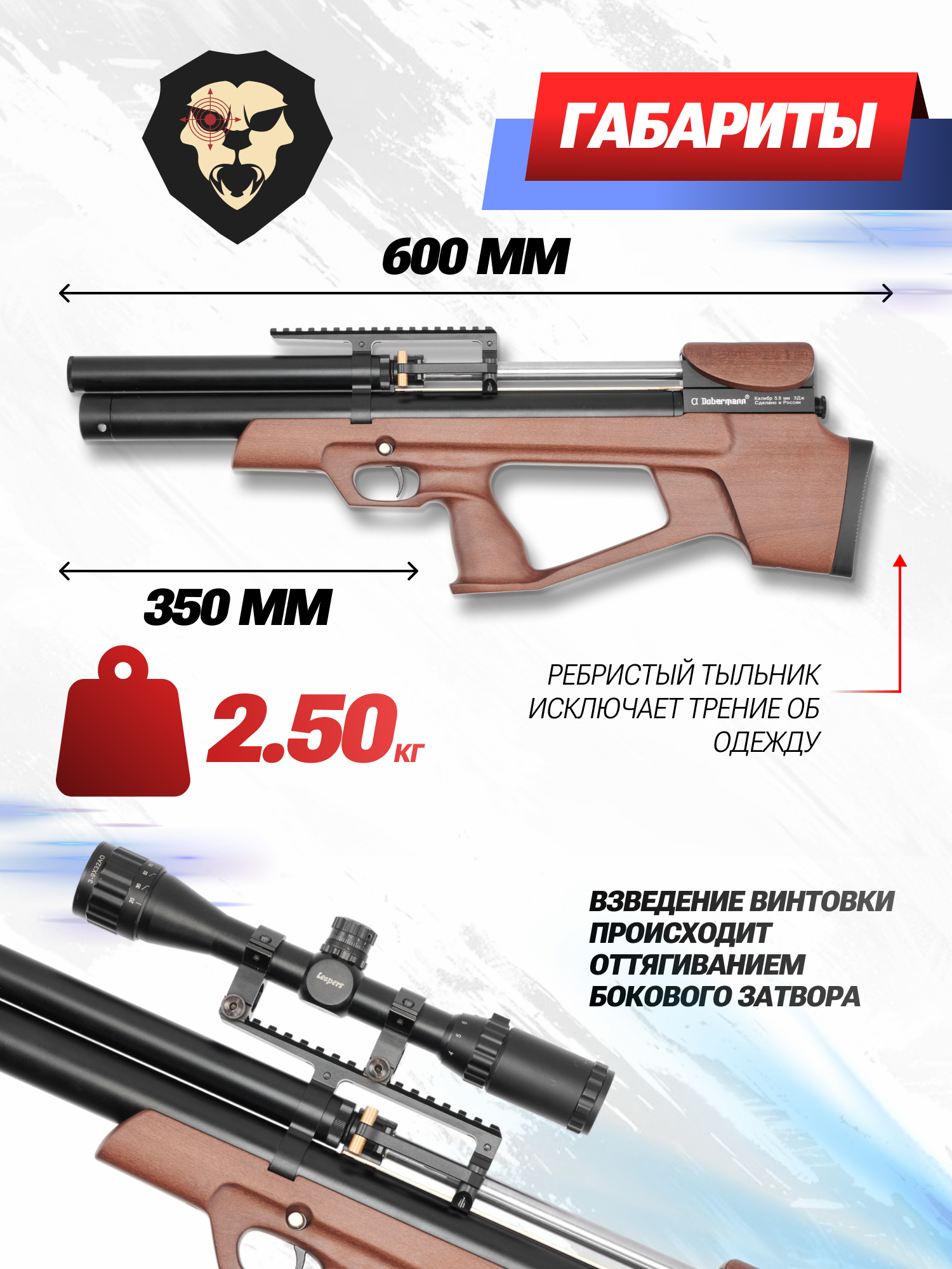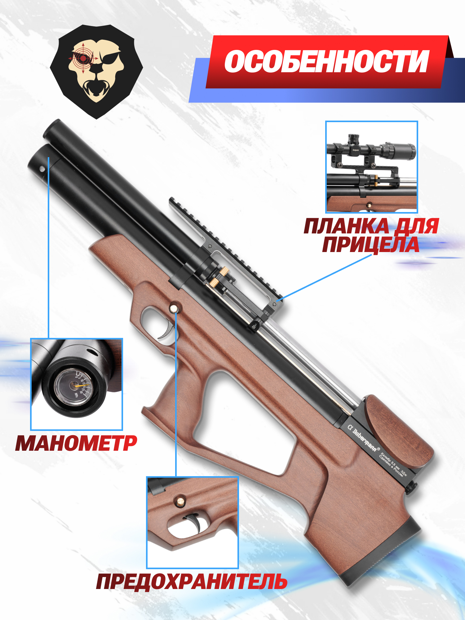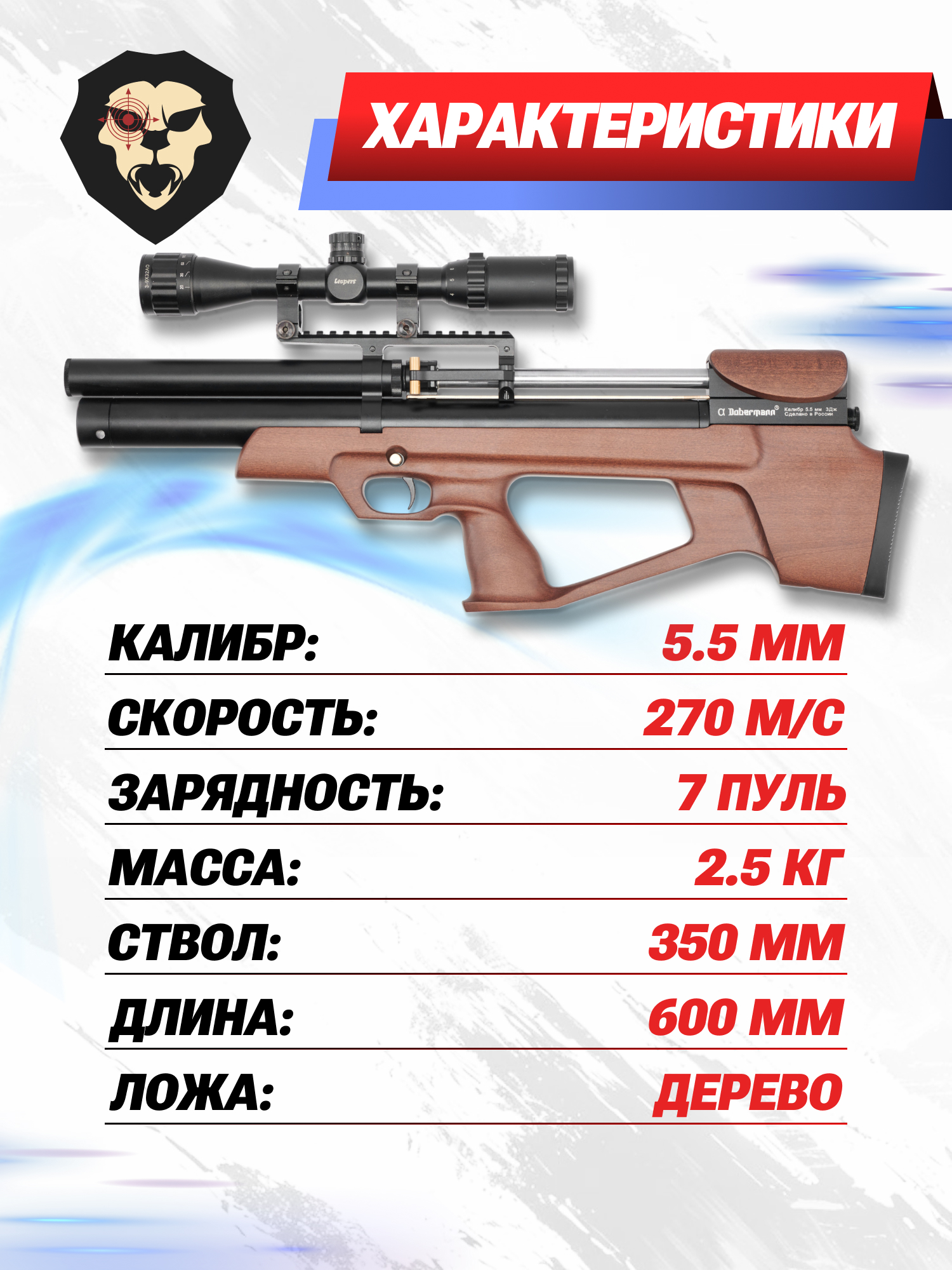 На консервативном рынке оружия появление нового имени — настоящее событие. Компания Доберман Барнаул это пример современного производителя кастомной пневматики, специализирующегося на моделях с предварительной накачкой. Следуя мировым тенденциям создания более компактных и практичных моделей, фирма выпустила линейку «Буллпап», к которой относится Doberman Alfa 5.5 мм со стволом 350 мм и деревянной ложей.