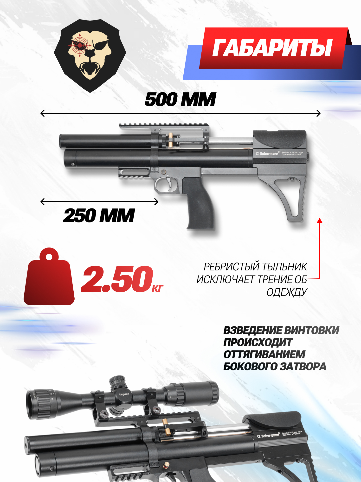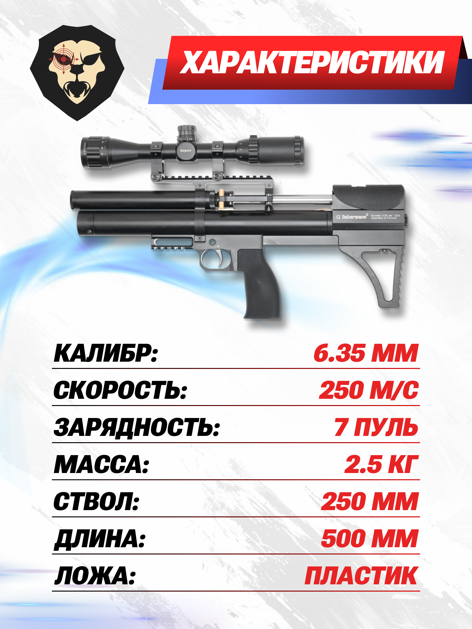 Информация о товаре "Пневматическая винтовка Dobermann Alfa Буллпап 6.35 мм (250 мм, полигональные нарезы, передний взвод)" носит ознакомительный характер, и не является публичной офертой, определяемой положениями Статьи 437 Гражданского кодекса Российской Федерации, характеристики, внешний вид, цвет и комплектация могут быть изменены производителем без уведомления.