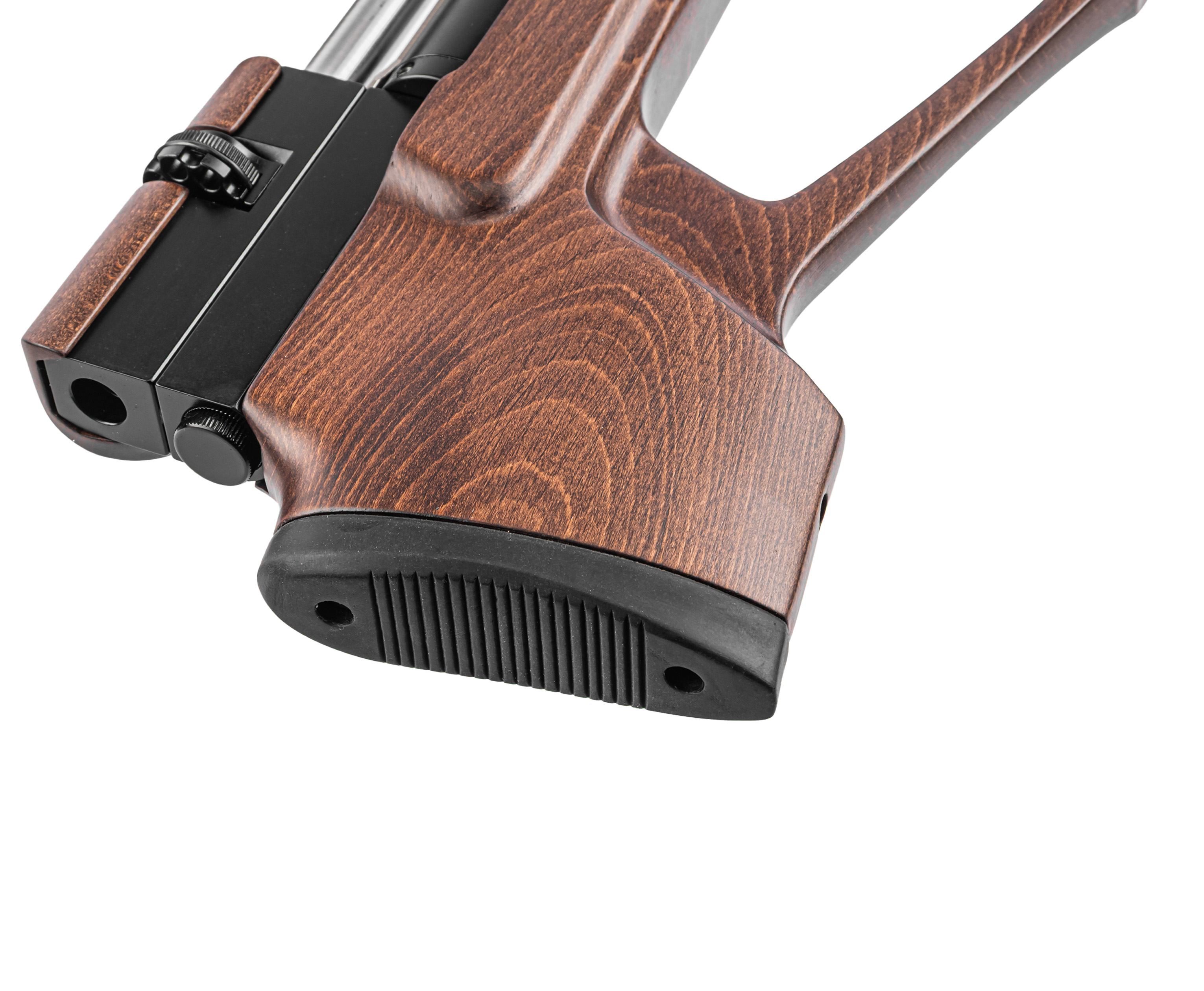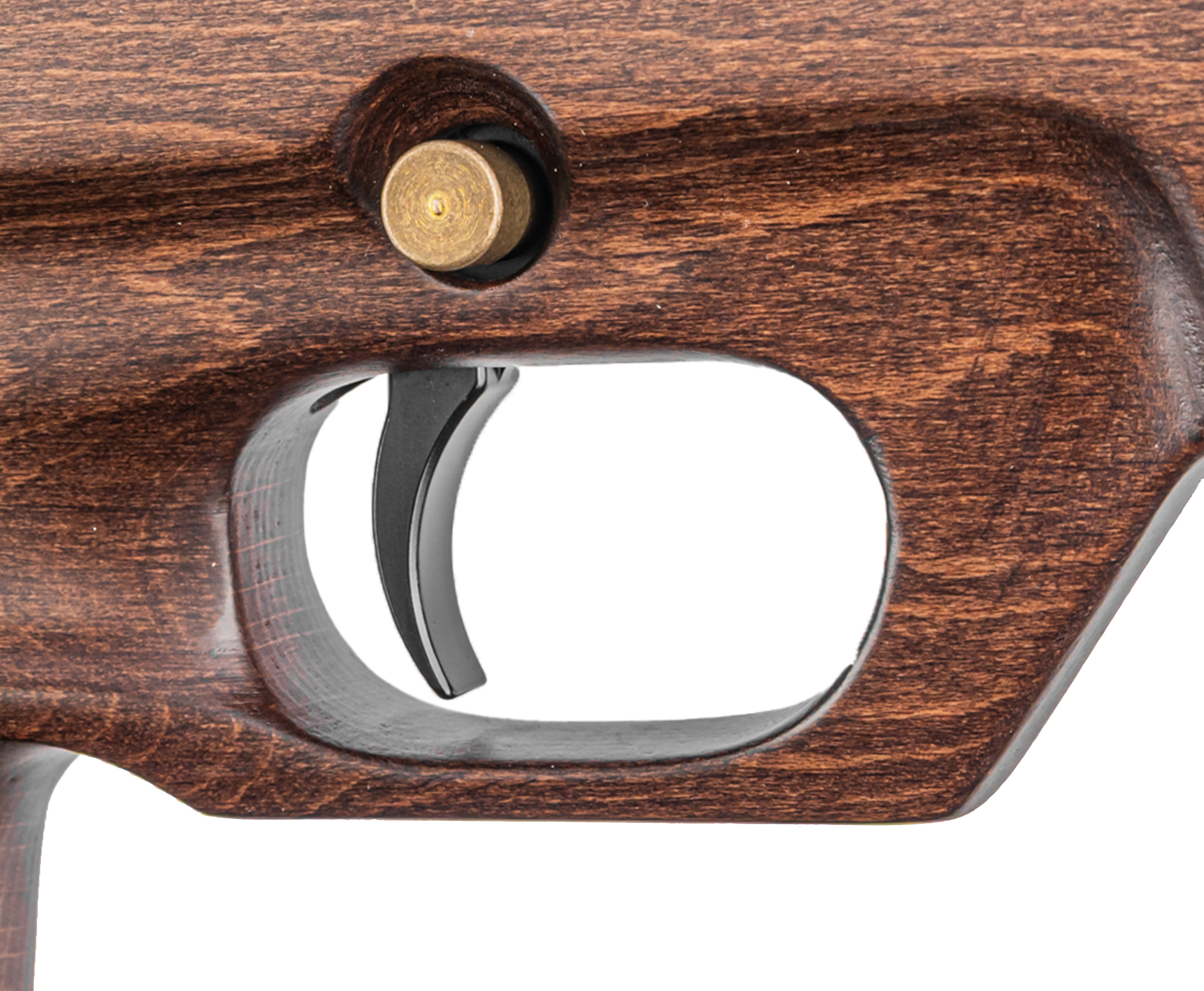 Модельный ряд малогабаритных Булл-Пап винтовок бренда представлен экземплярами как в пластике, так и в дереве. Любителям классики приглянется рассматриваемый образец с эргономичной ложей, вырезанной из натурального материала и обработанной защитной пропиткой, которая подчеркивает естественную структуру. Присутствует ортопедический приклад с резиновым тыльником, а также пистолетная рукоять с выемками под пальцы, что вкупе повышает комфорт удержания и вкладки.
