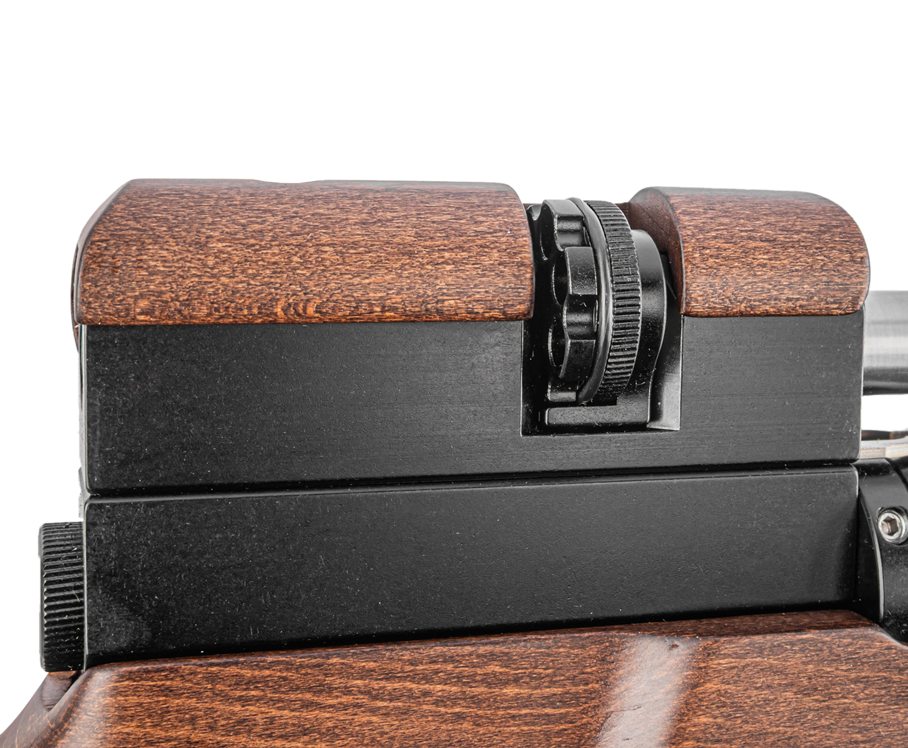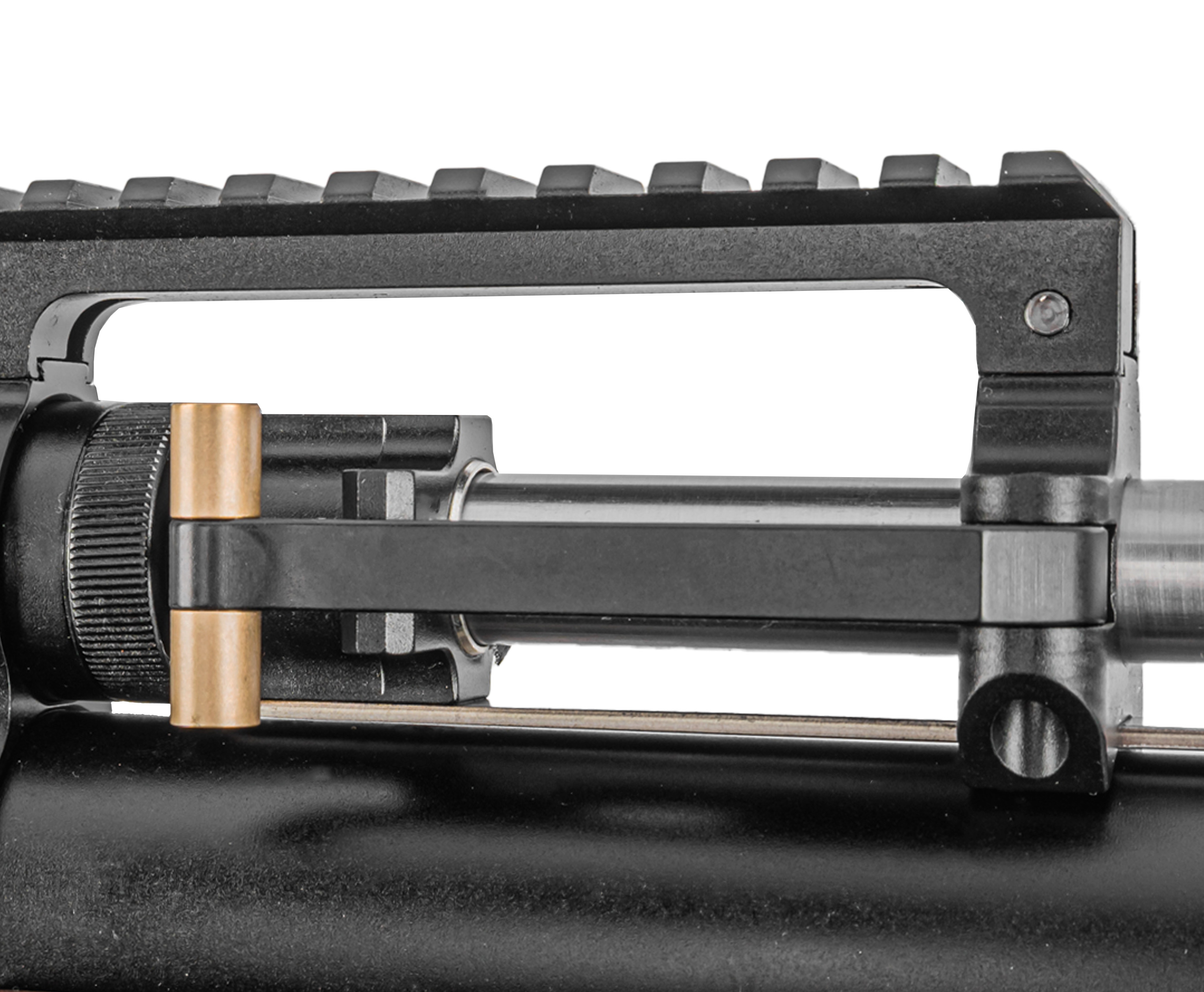 Взведение пневматики выполняется рычагом затвора. Узел вынесен вперед для удобства проведения манипуляций с сохранением вкладки в прицел. Желаемые приспособления для наведения докупаются отдельно и крепятся на посадочную планку современного стандарта Weaver 22 мм.