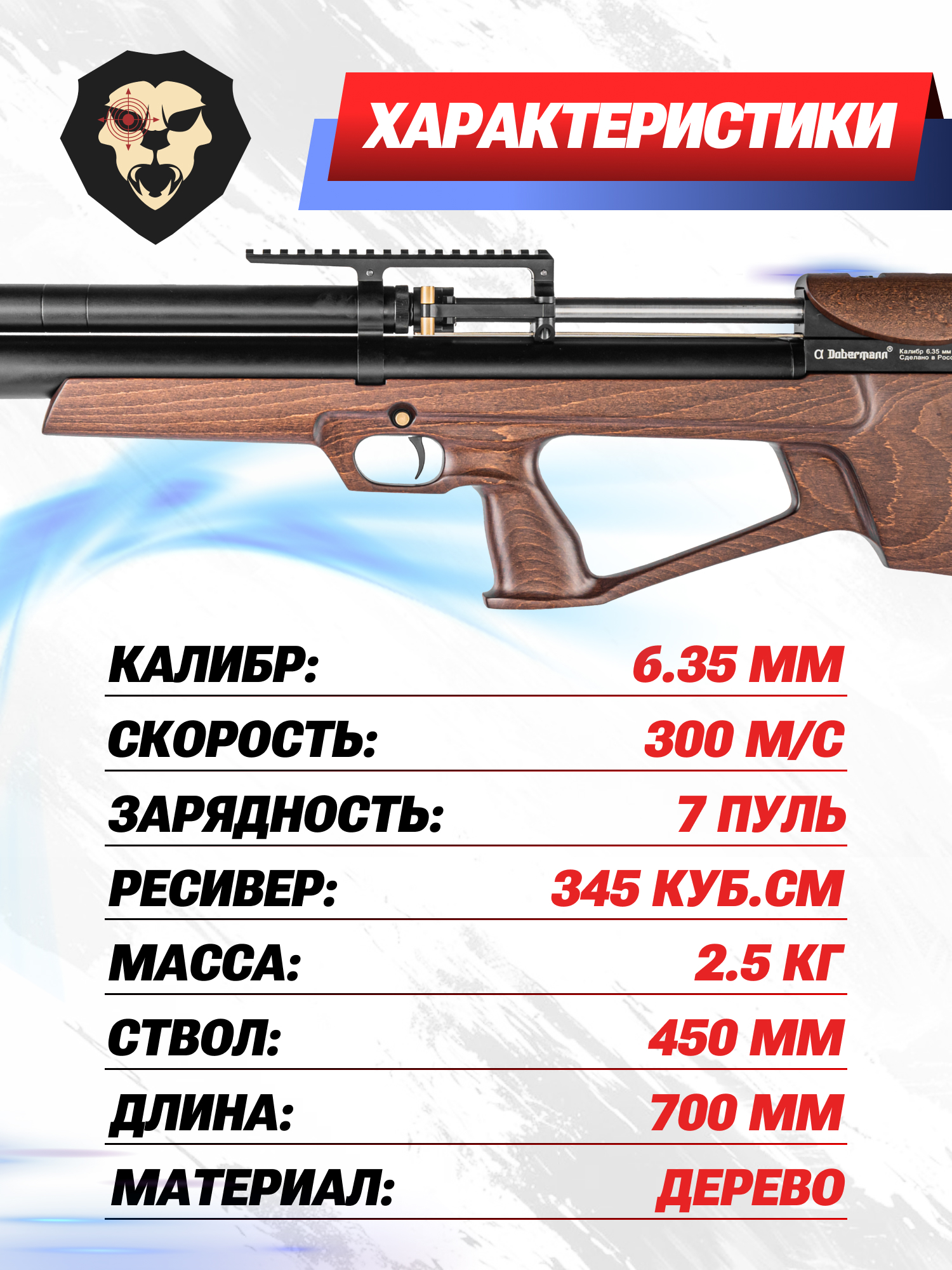 Информация о товаре "Пневматическая винтовка Alfa Dobermann Буллпап 6.35 мм (450 мм, дерево, редуктор, полигональные нарезы, передний взвод)" носит ознакомительный характер, и не является публичной офертой, определяемой положениями Статьи 437 Гражданского кодекса Российской Федерации, характеристики, внешний вид, цвет и комплектация могут быть изменены производителем без уведомления.