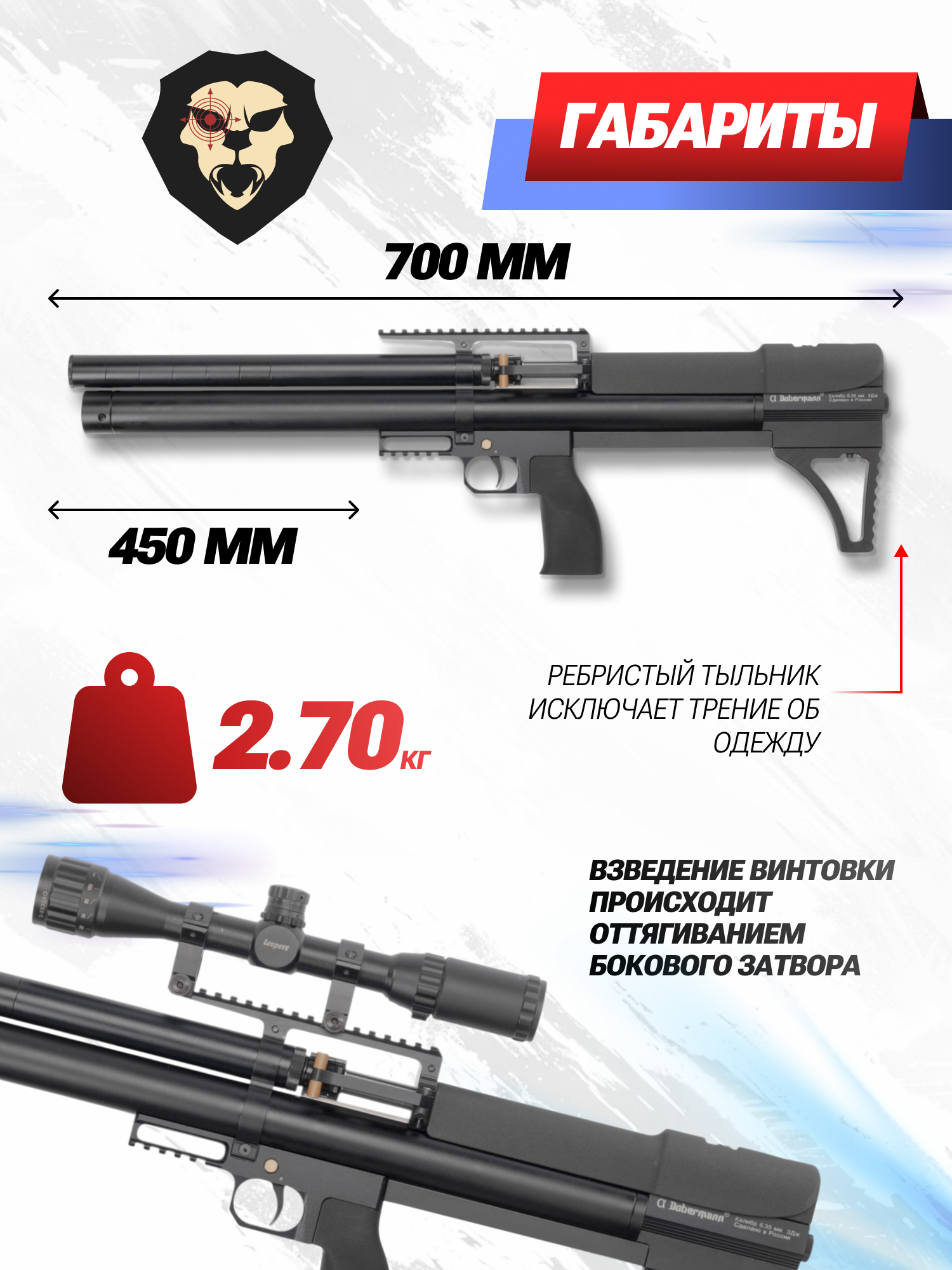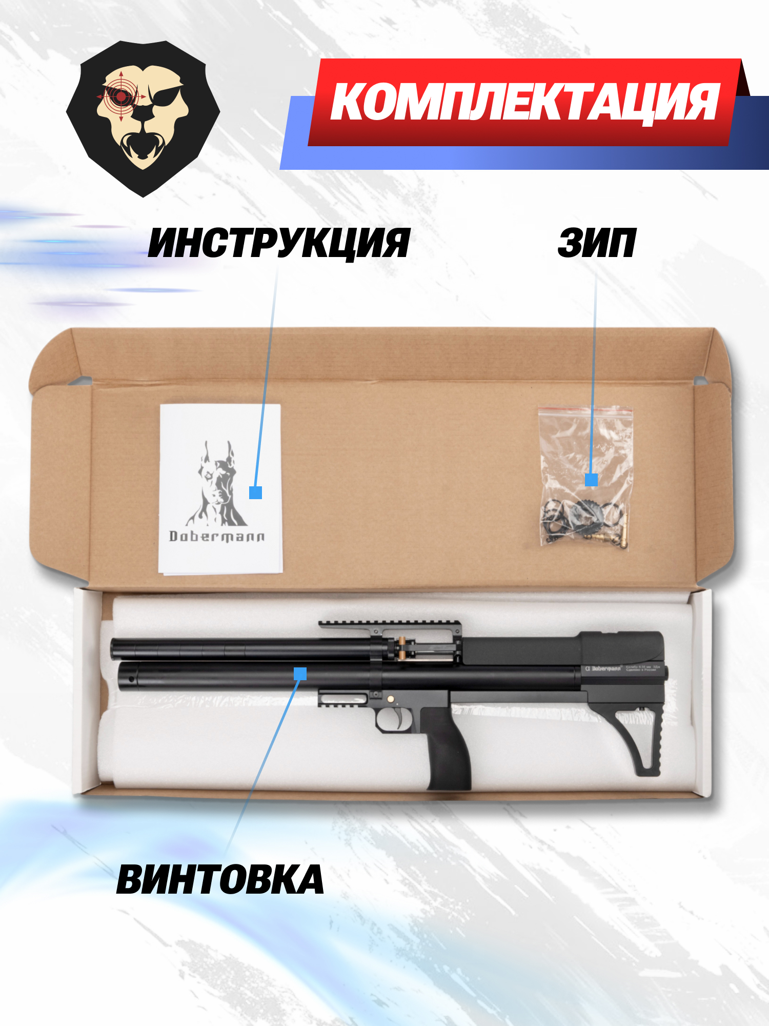 Размер винтовки Dobermann Буллпап от края приклада до среза саундмодератора - 700 миллиметров. Основным материалом для изготовления воздушки послужил Д16Т - износостойкий и прочный металл, отличившийся легкостью. Благодаря использованию последнего, а также полимера для рукоятки и кожуха-подщечника, вес винтовки снизился до 2.7 килограмма.
