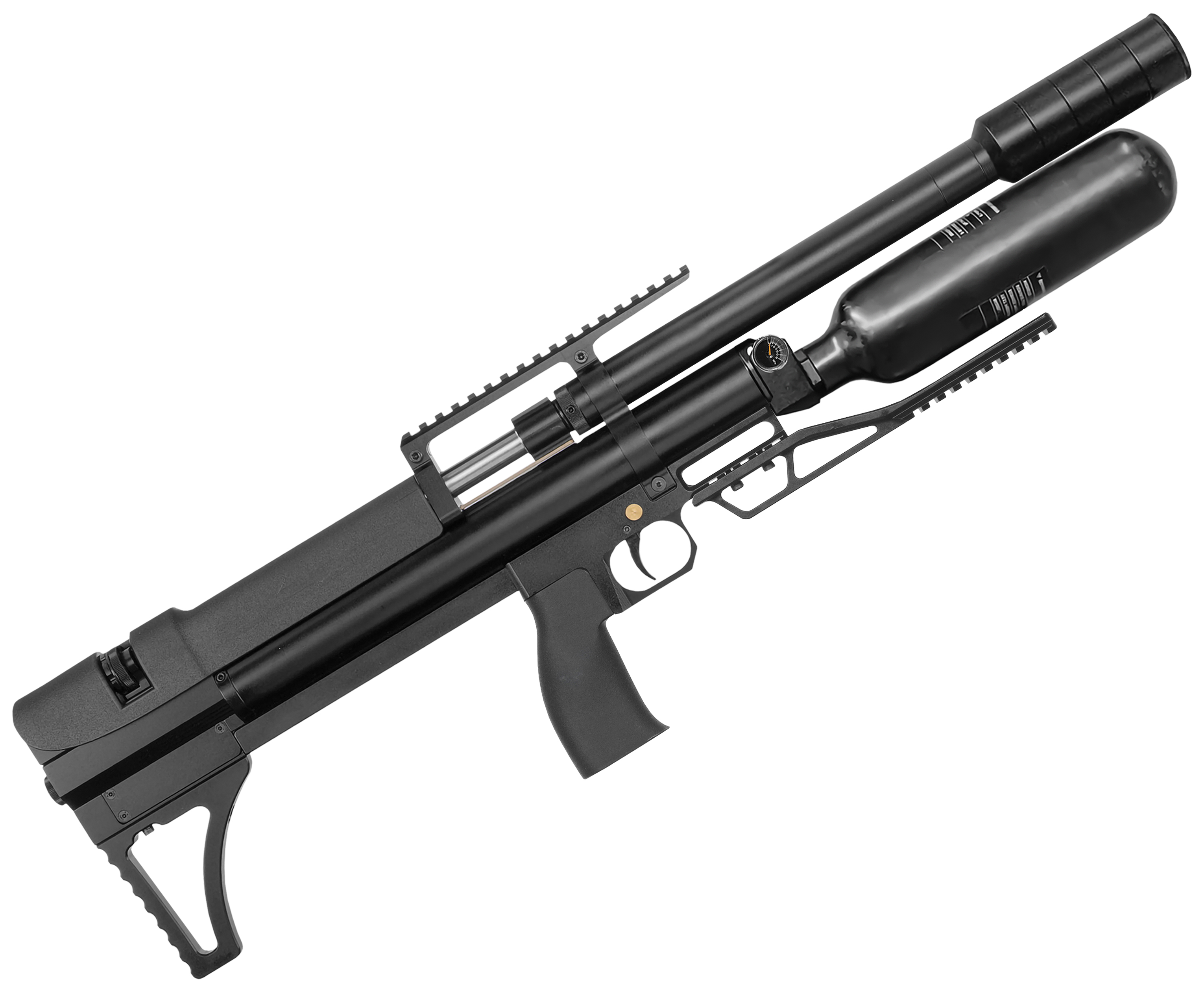 Винтовка с колбой заправляется насосами ВД, подключаемыми к разъему на корпусе через штуцер - последний идет в комплекте. Рекомендованный верхний порог давления при накачке - 250 Бар. Упростить контроль призван манометр с информативной шкалой - датчик встроен с правой стороны у основания баллона.