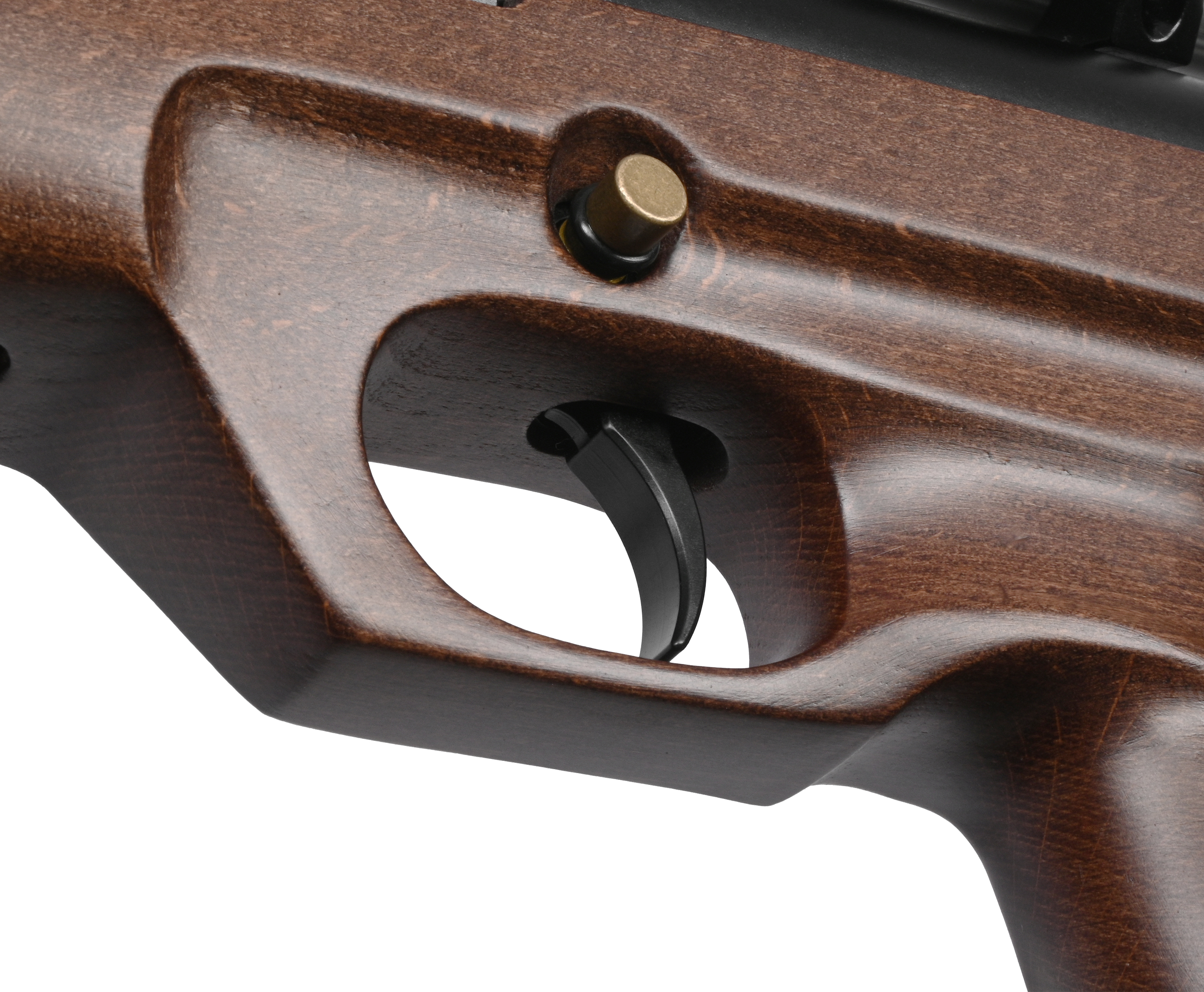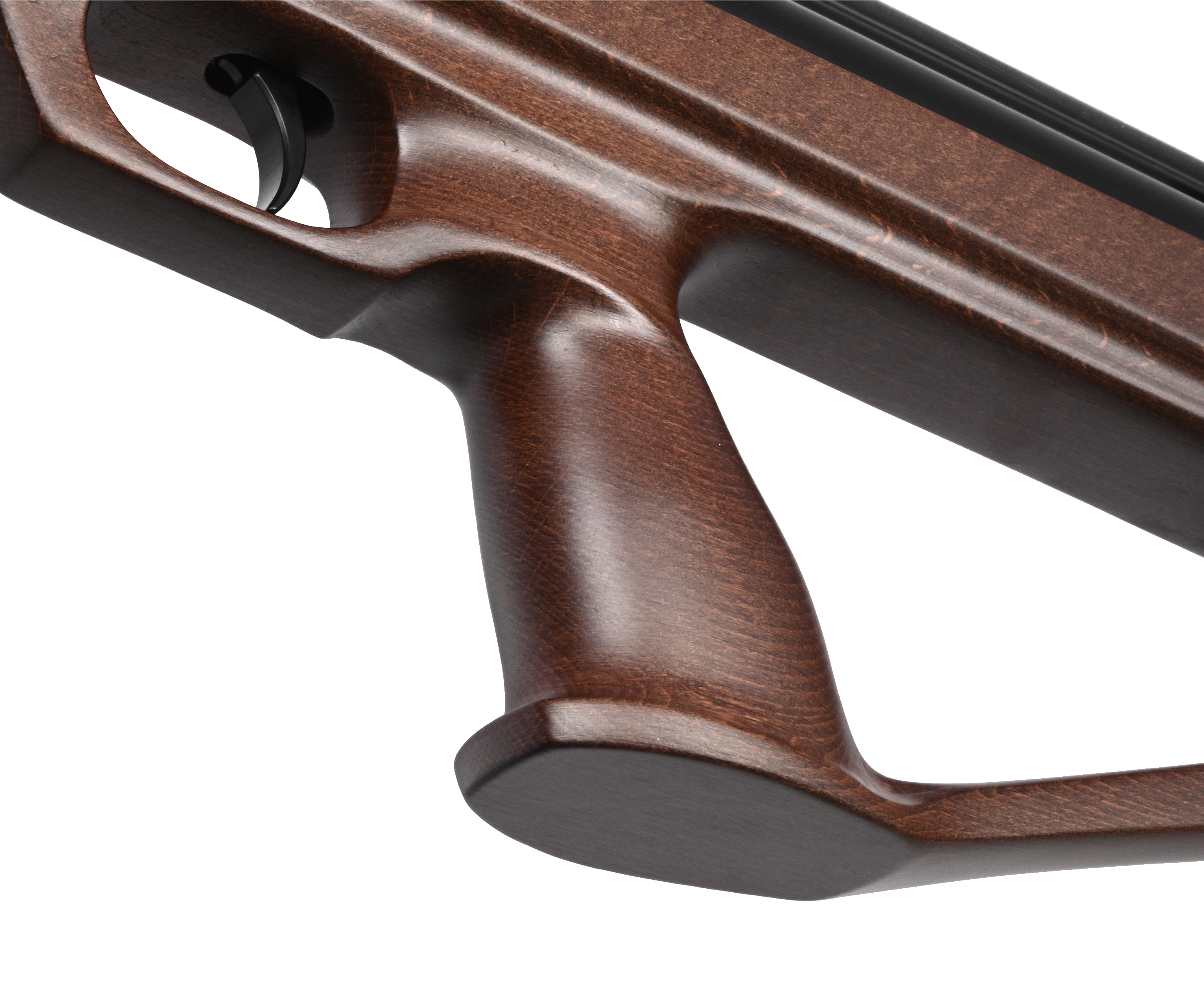 Флагманские винтовки Альфа Булл-Пап доступны не только в тактическом исполнении с дюралевой шиной, но и с полноценной ложей из натурального материала. Вырезанная из твердых пород древесины фурнитура обрабатывается защитным лаком, оберегающим от влаги и подчеркивающим естественную структуру. Приклад вкупе с рукоятью обладает правильной формой с точки зрения анатомии, что способствует плотному хвату и корректной вкладке в прицел.