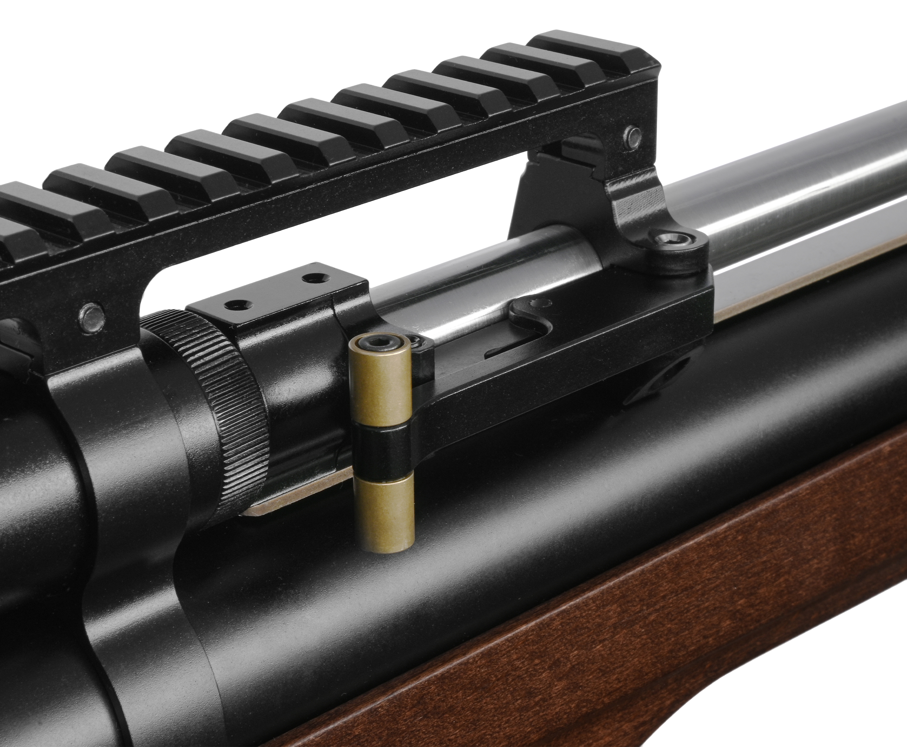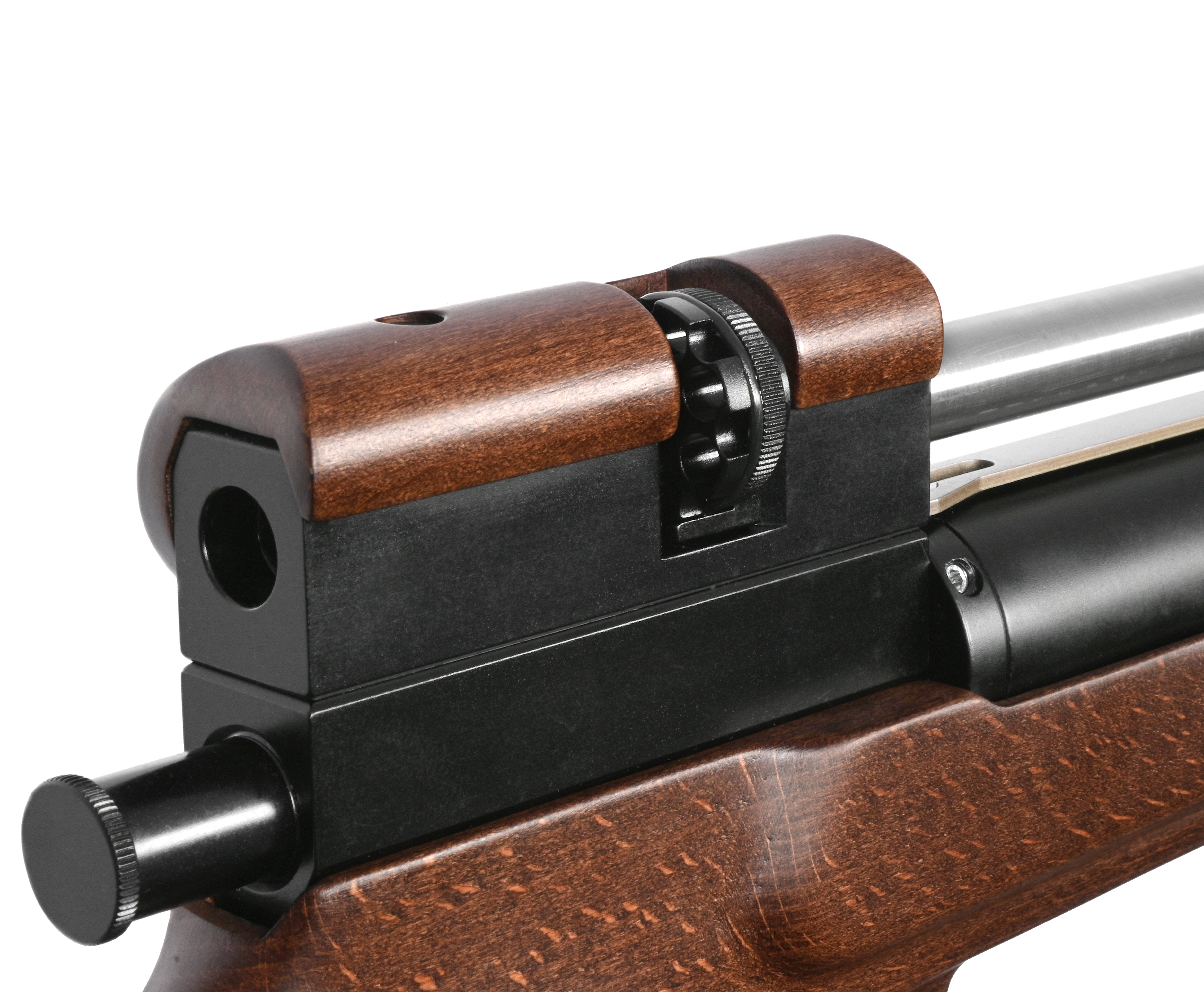 Чтобы придать пуле необходимое ускорение, задействуется воздух, который нагнетается насосом ВД в ресивер объемом 345 куб. см. Из резервуара газ поступает в ствол по прямоточной схеме. Хранилище снабдили манометром для контроля текущего давления - максимальный разрешенный показатель для штатного функционирования системы составляет 250 Бар.