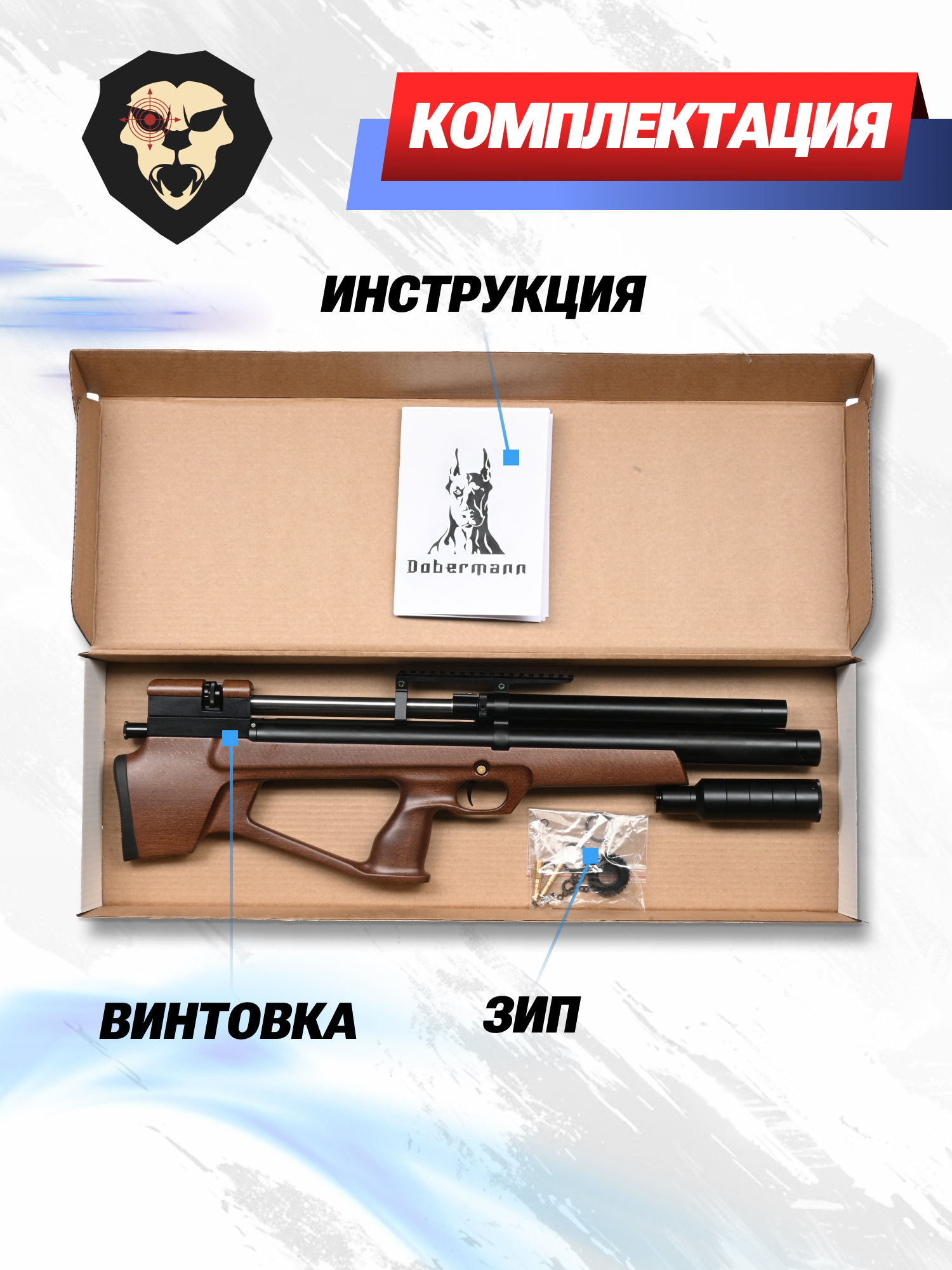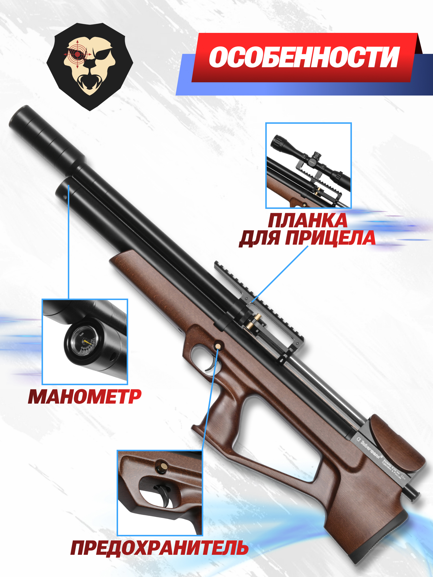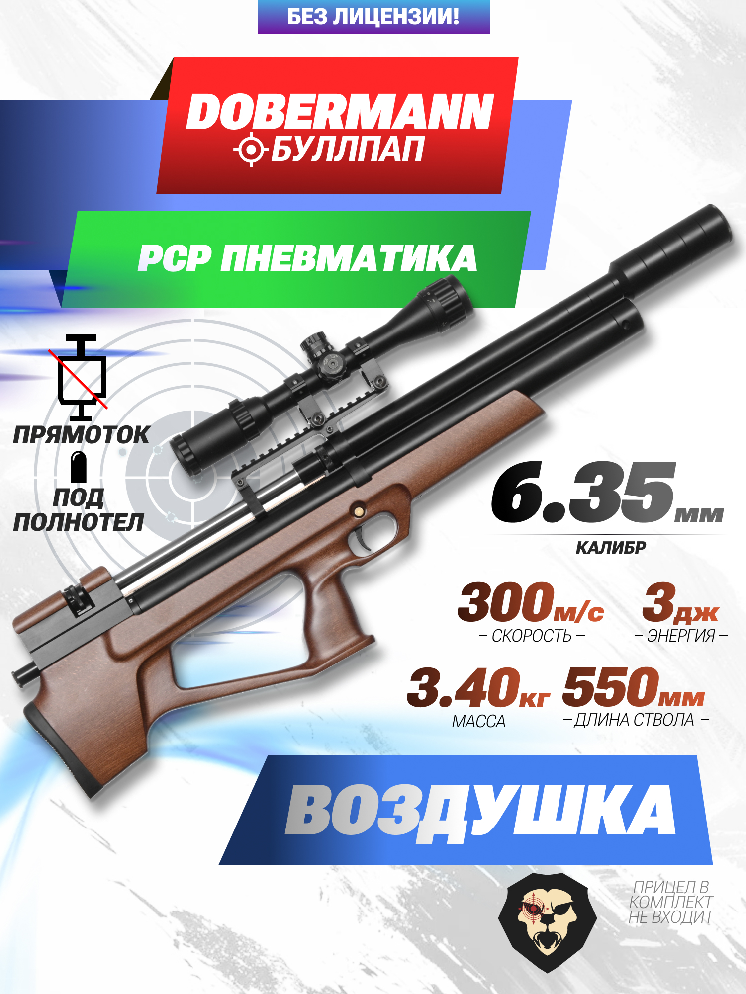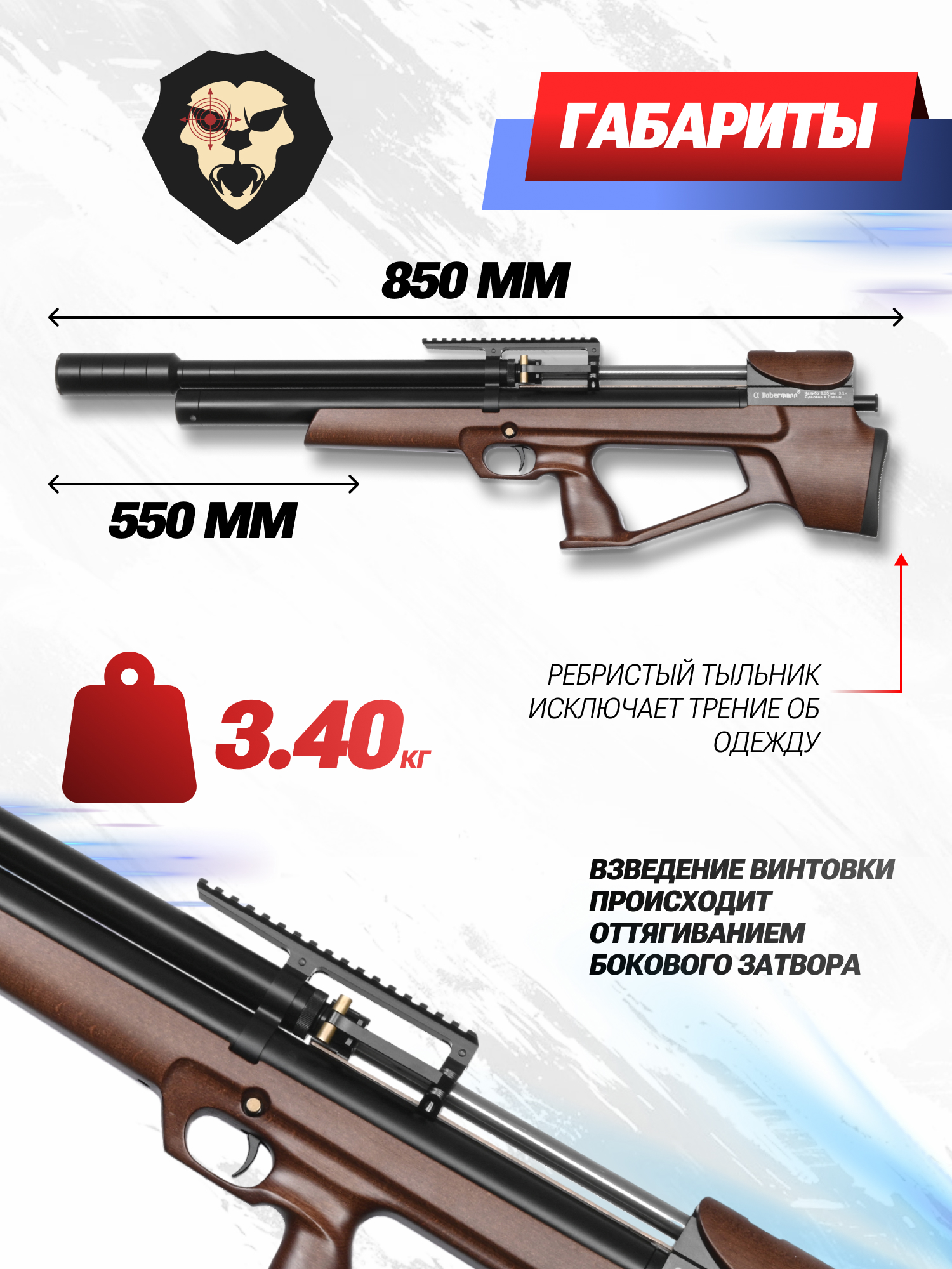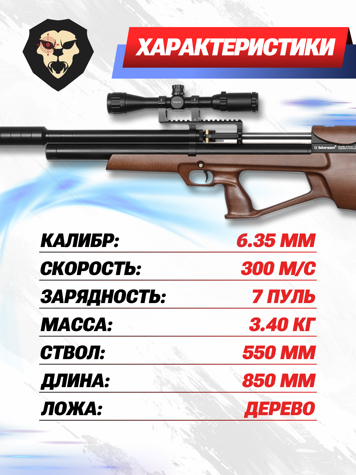 Информация о товаре "Пневматическая винтовка Alfa Dobermann Буллпап 6.35 мм (550 мм, прямоток, под полнотел, модератор 44 мм, передний взвод, дерево)" носит ознакомительный характер, и не является публичной офертой, определяемой положениями Статьи 437 Гражданского кодекса Российской Федерации, характеристики, внешний вид, цвет и комплектация могут быть изменены производителем без уведомления.