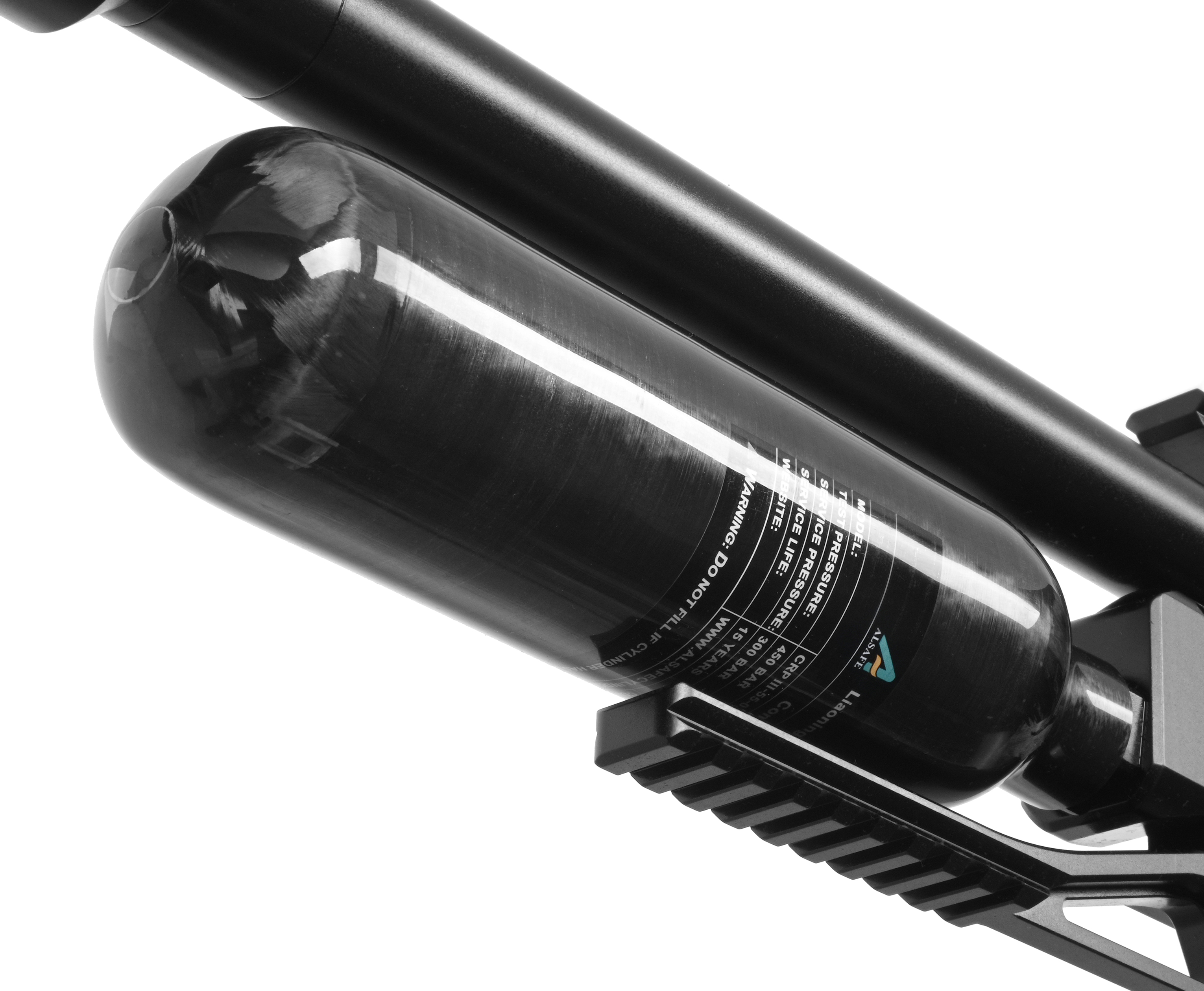 Особенностью представленного исполнения винтовки Alfa 6.35 мм стал переход от линейной системы питания к комбинированной, в которой главную роль отвели колбе - сам по себе элемент вместимостью 345 куб. см имеет емкость кратную стандартному узлу для содержания. В купе с имеющейся в конструкции частью базового резервуара это образует общий объем до 550 куб. см. Следовательно, с таким запасом стрелку придется отвлекаться на дозаправку реже, вместе с чем он получит возможность увеличить количество затрачиваемого на выстрелы воздуха одновременно без потерь в их количестве.
