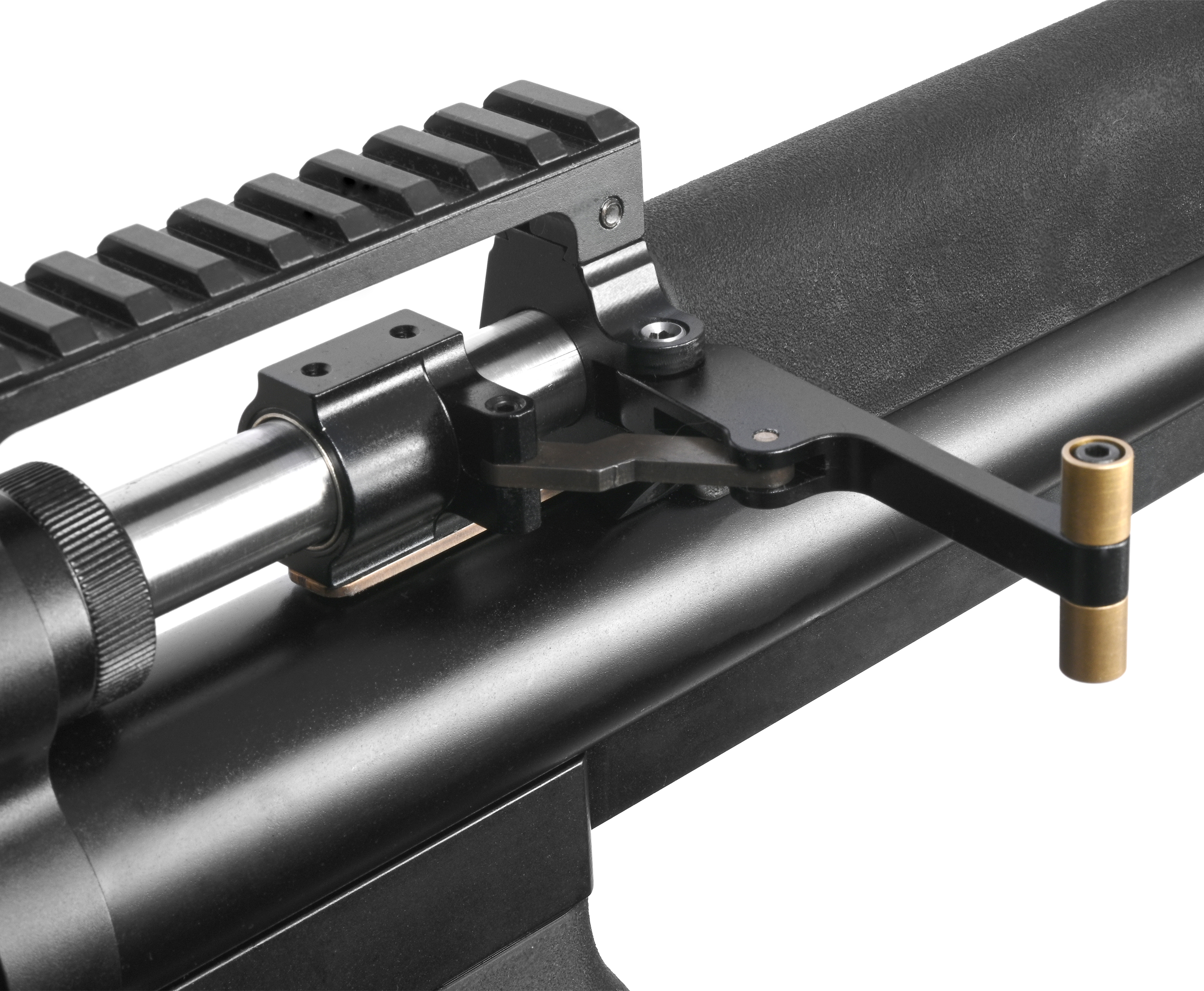 На дульном срезе бланка предусмотрена насадка - саундмодератор Ф44 имеет увеличенные распределительные каморы, благодаря чему громкость выстрела эффективно снижается до едва различимого на слух уровня. Перед нажатием на спуск понадобится взвести винтовку. Процедура осуществляется рычагом затвора с левой стороны - для удобства манипуляций узел вынесен вперед.