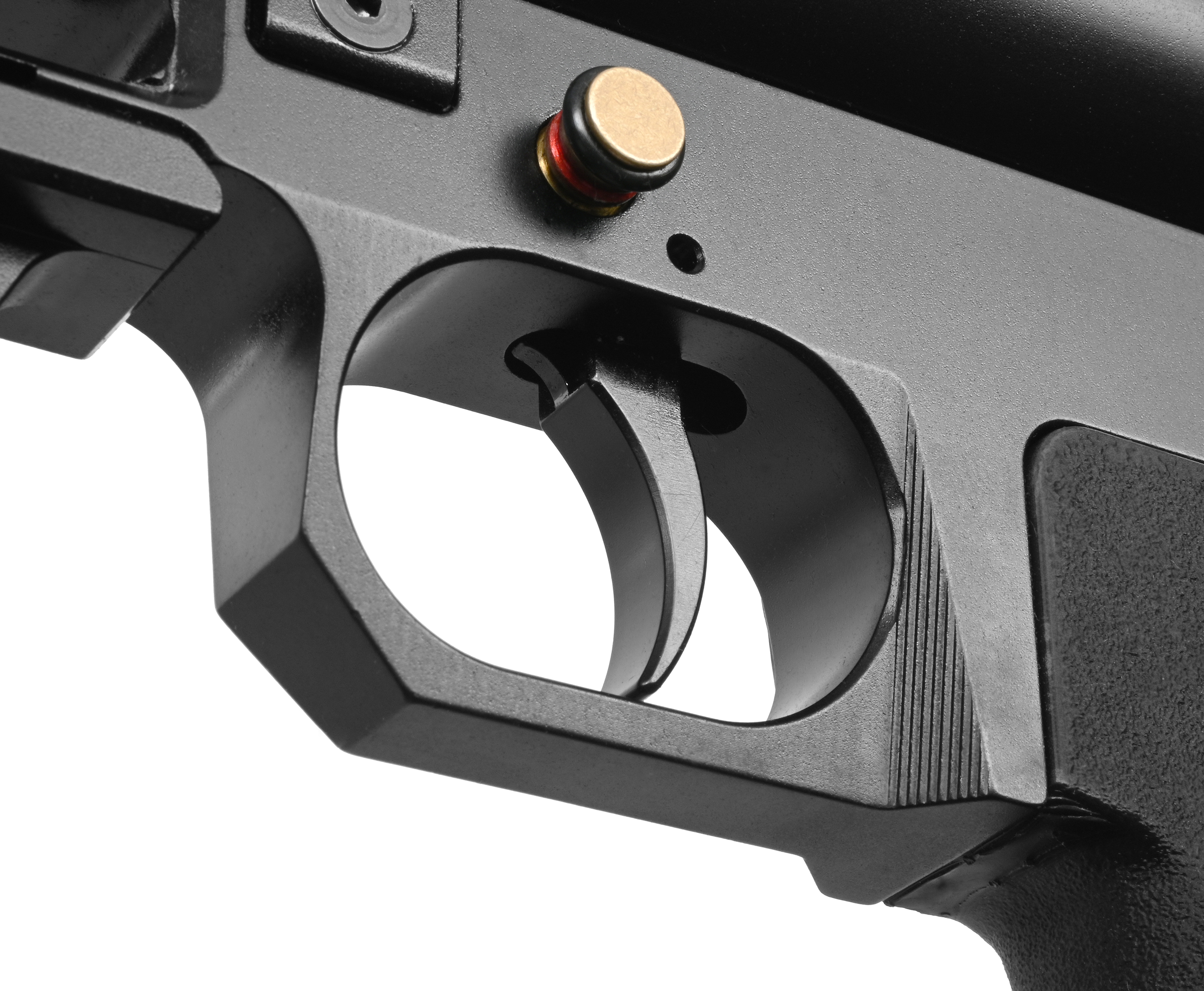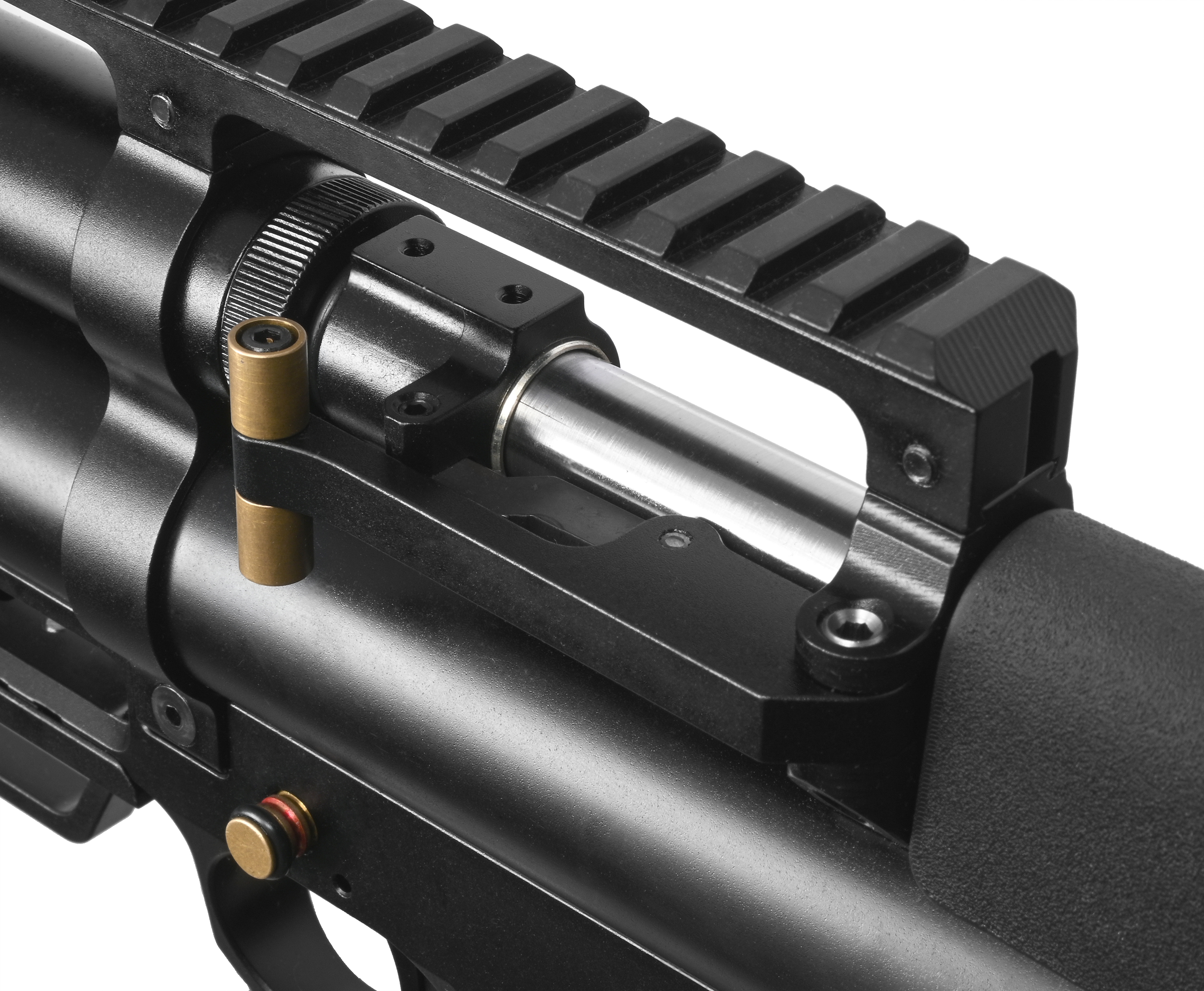 Рекомендованный предел заполнения пневматики составляет 250 Бар. В схему устройства экземпляра включен редуктор. Узел отвечает за настройку давления пропускаемого через клапан воздуха, следовательно, стрелок сможет под себя отрегулировать систему для достижения предсказуемой работы оружия.