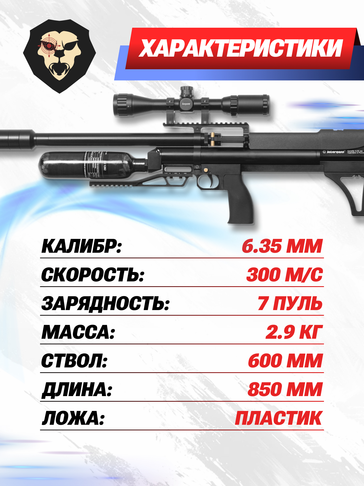 БуллПап Доберман 6.35 мм в теории может выпускать снаряды со скоростью до 300 метров в секунду. При этом для российских пользователей продукция завода выпускается с разрешенной мощностью не больше 3 Дж, следовательно, в стоковой вариации достичь заявленного значения не выйдет. Однако такая особенность делает винтовку доступной совершеннолетним гражданам без ограничения лицензией.