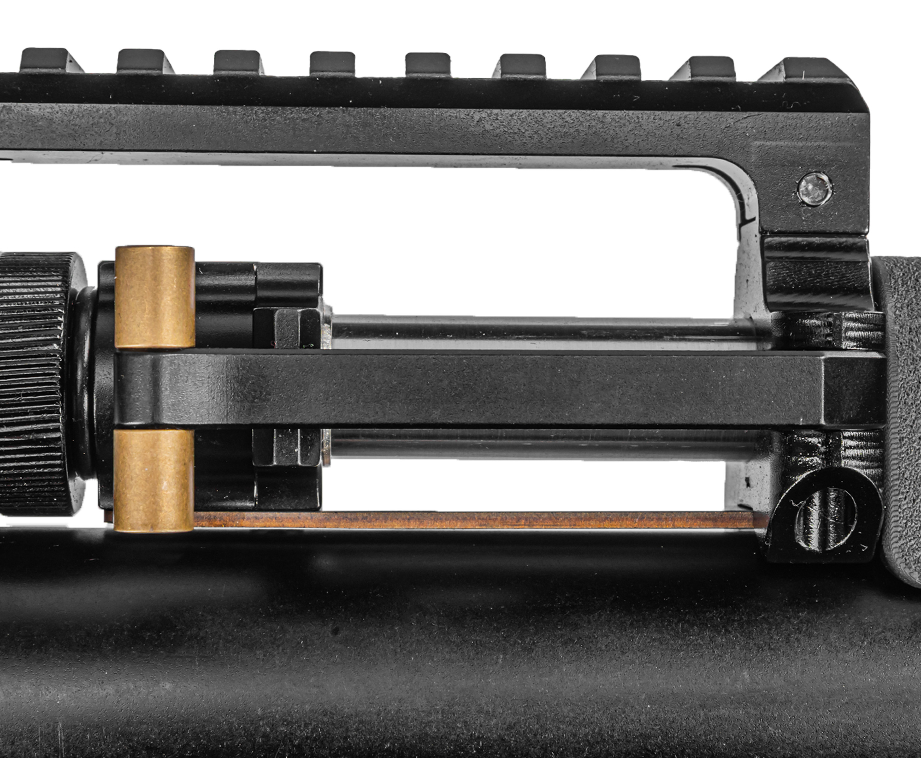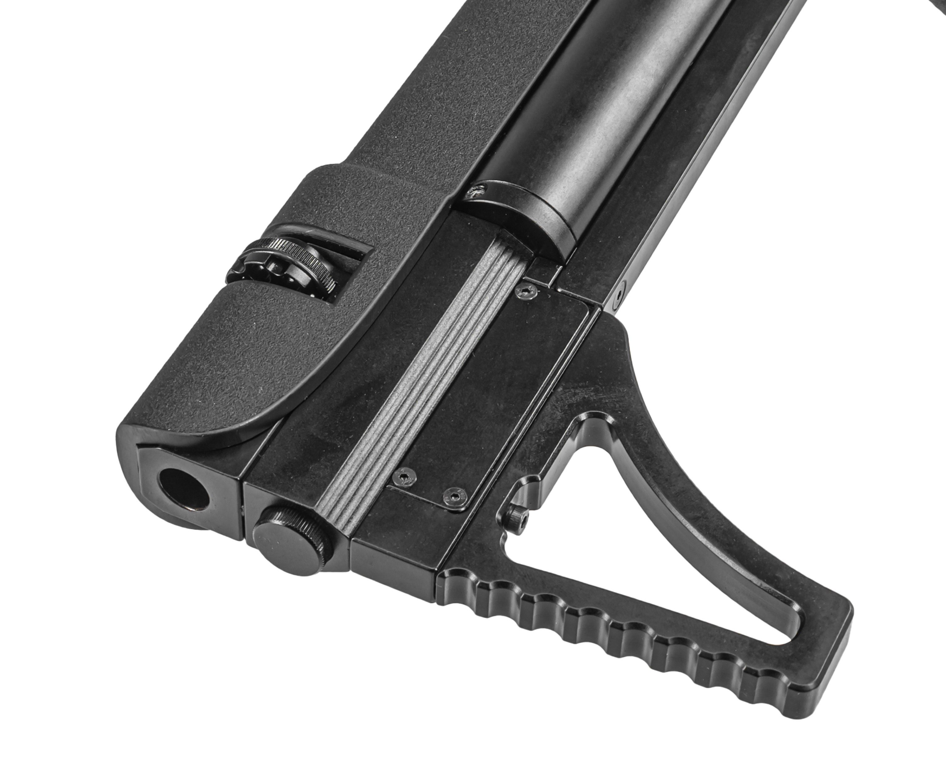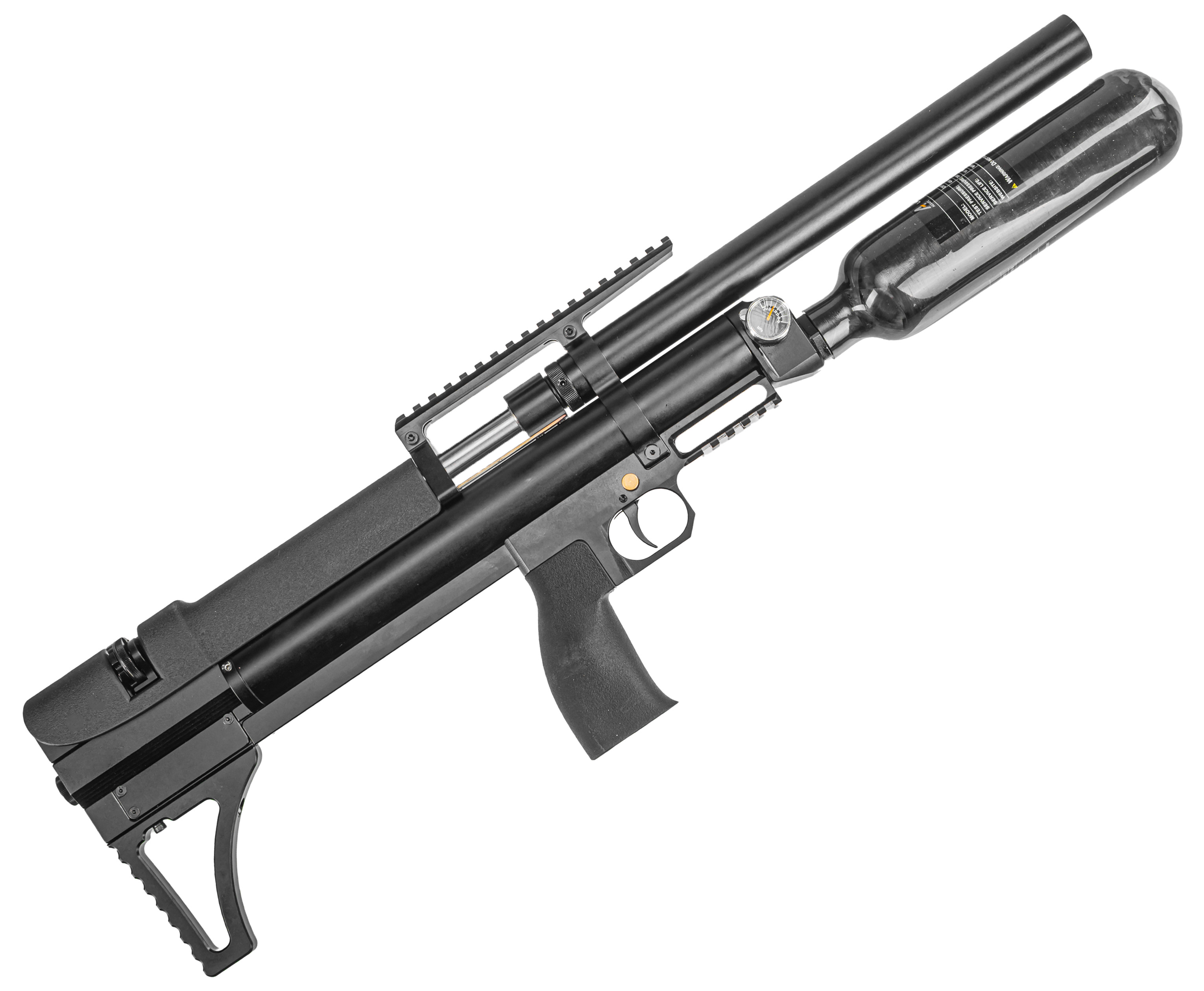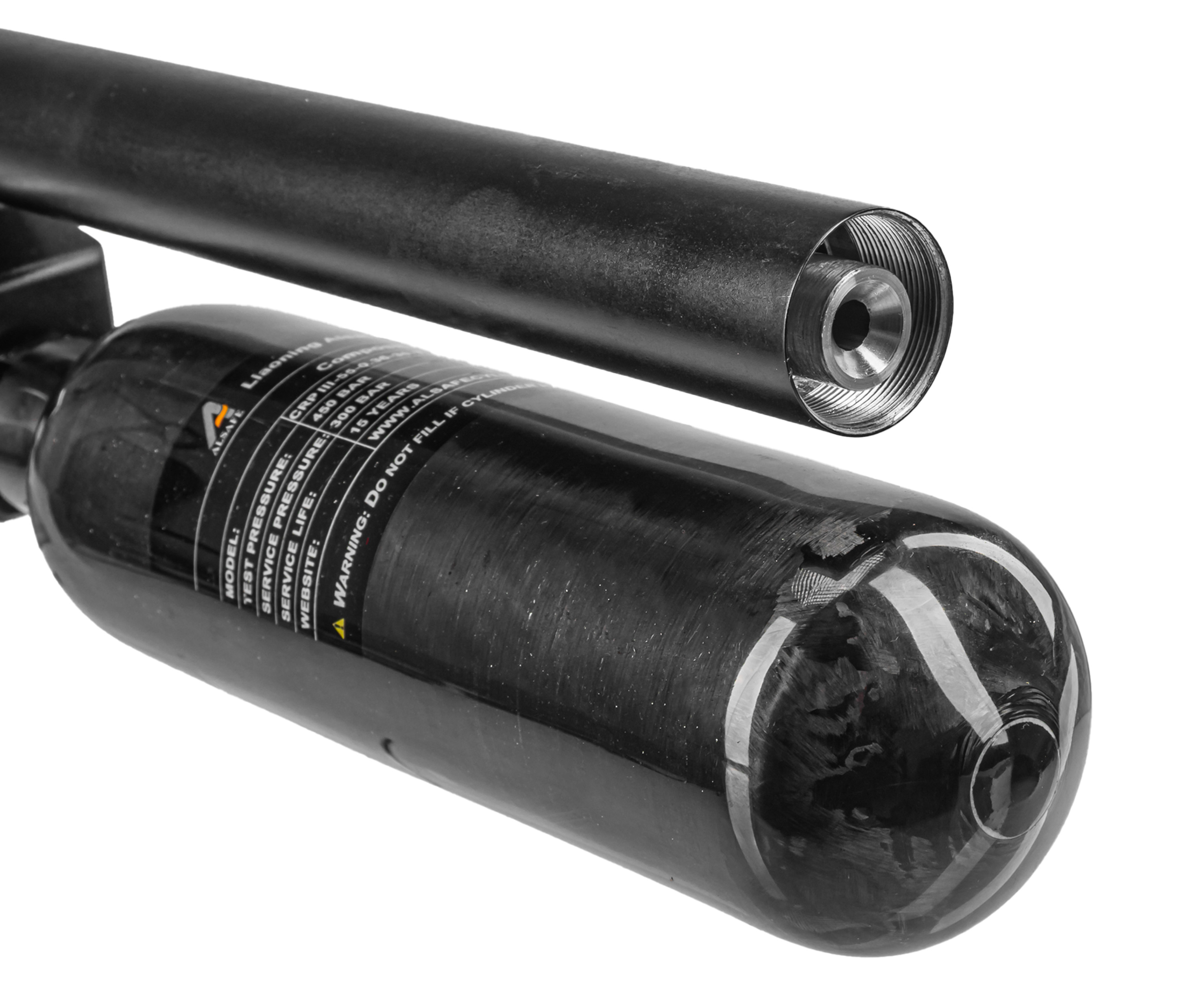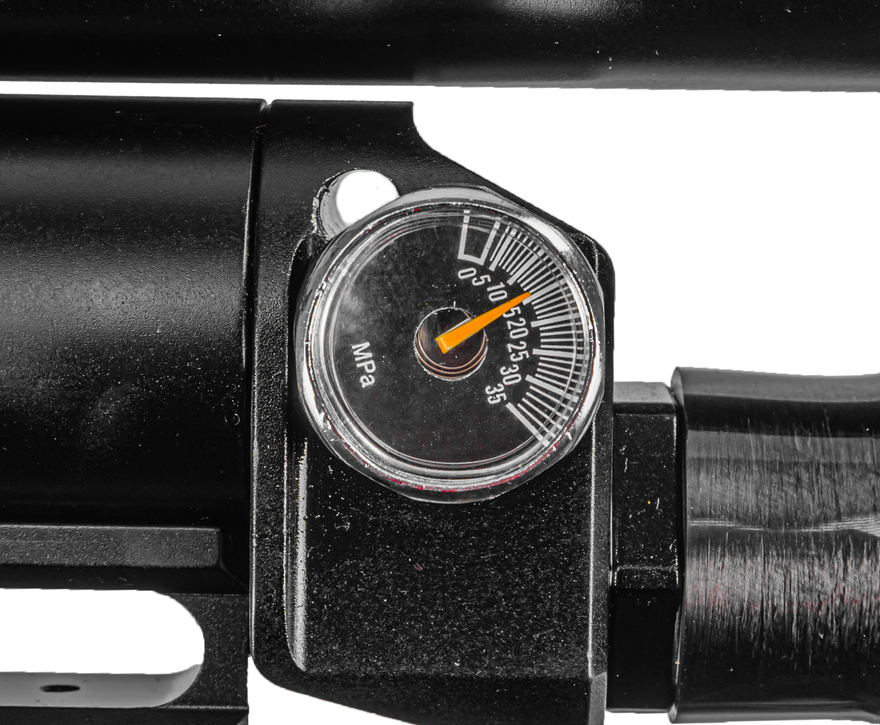 Колбовый ресивер выдерживает избыточное заполнение, однако для стабильного функционирования оружия не рекомендуется заправлять систему свыше 250 Бар. Следить за текущим давлением можно при помощи интегрированного манометра. Важная особенность модели - наличие редуктора, при помощи которого подразумевается тонкая регулировка механизма работы пневматики.