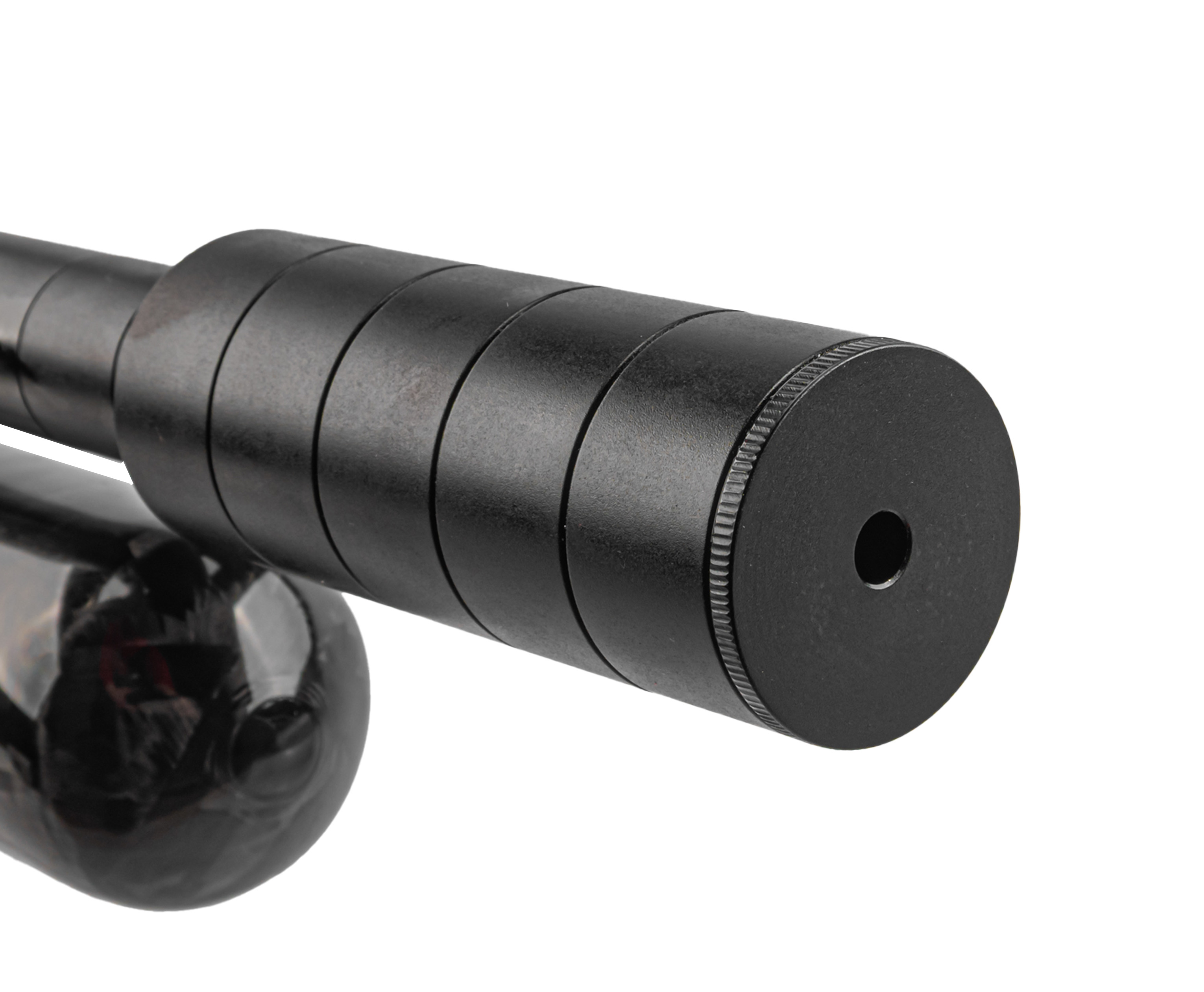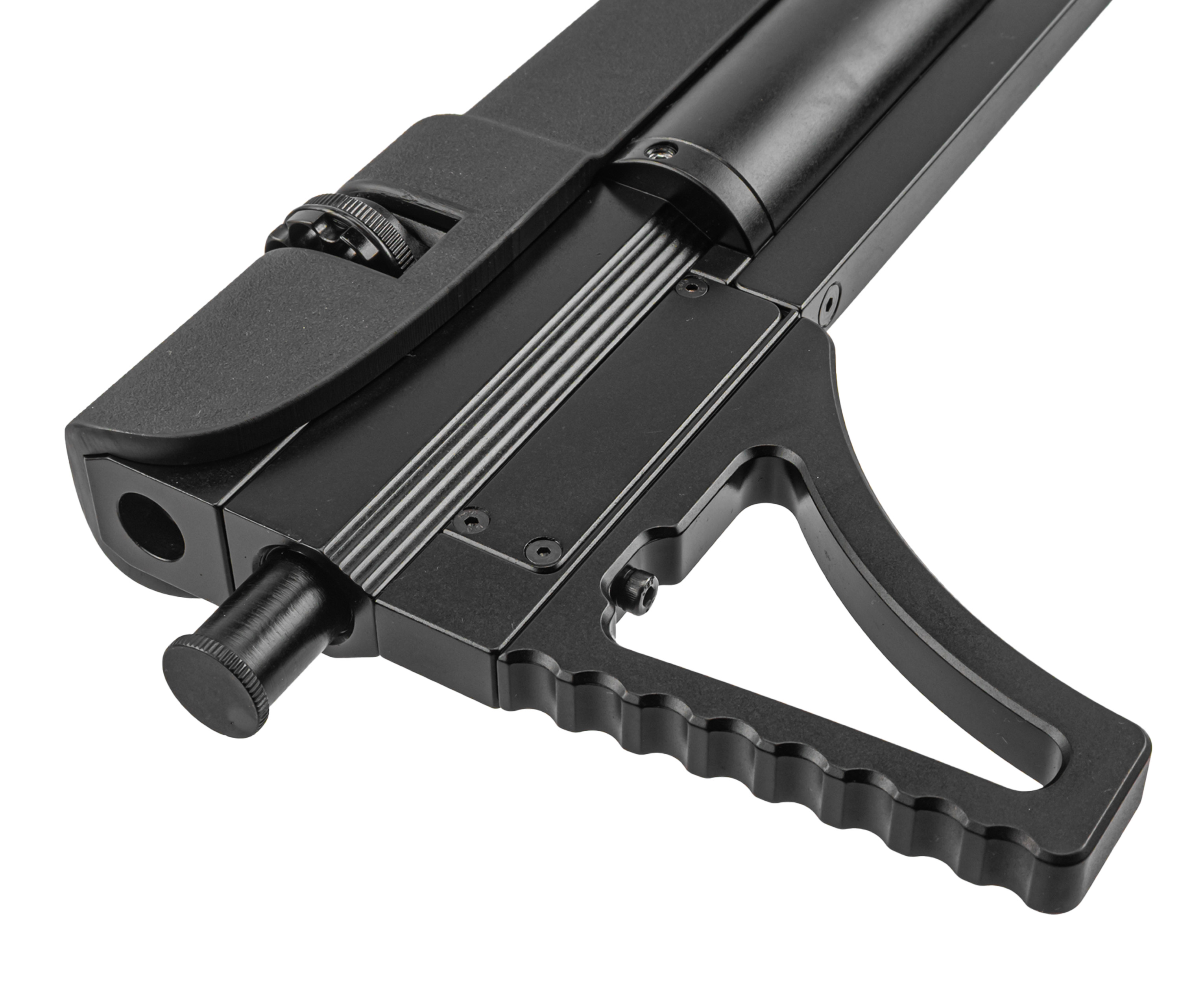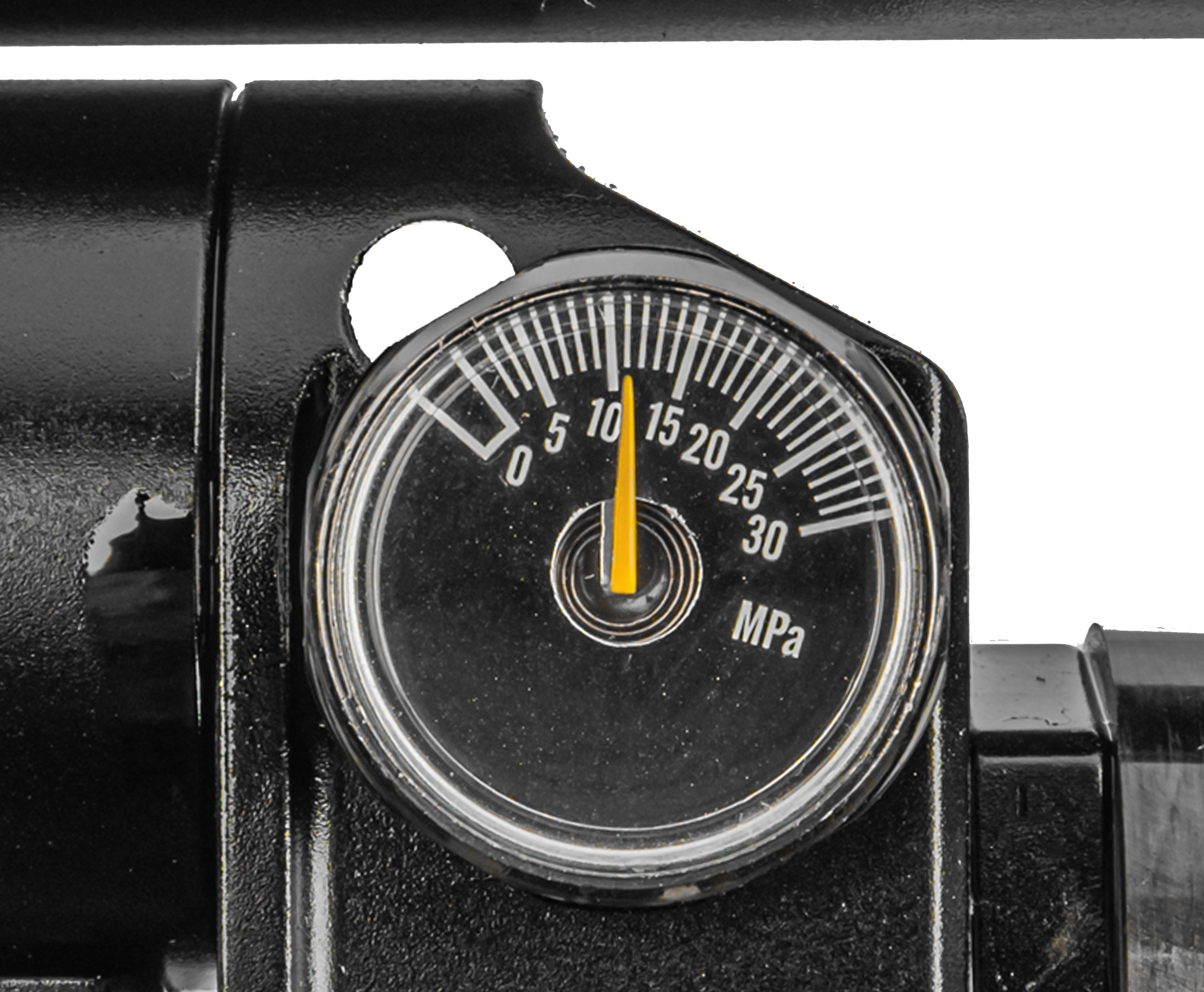 Колбовый ресивер выдерживает избыточное заполнение, однако для стабильного функционирования оружия не рекомендуется заправлять систему свыше 250 Бар. Следить за текущим давлением можно при помощи интегрированного манометра. Важная особенность модели - наличие редуктора, при помощи которого подразумевается тонкая регулировка механизма работы пневматики.