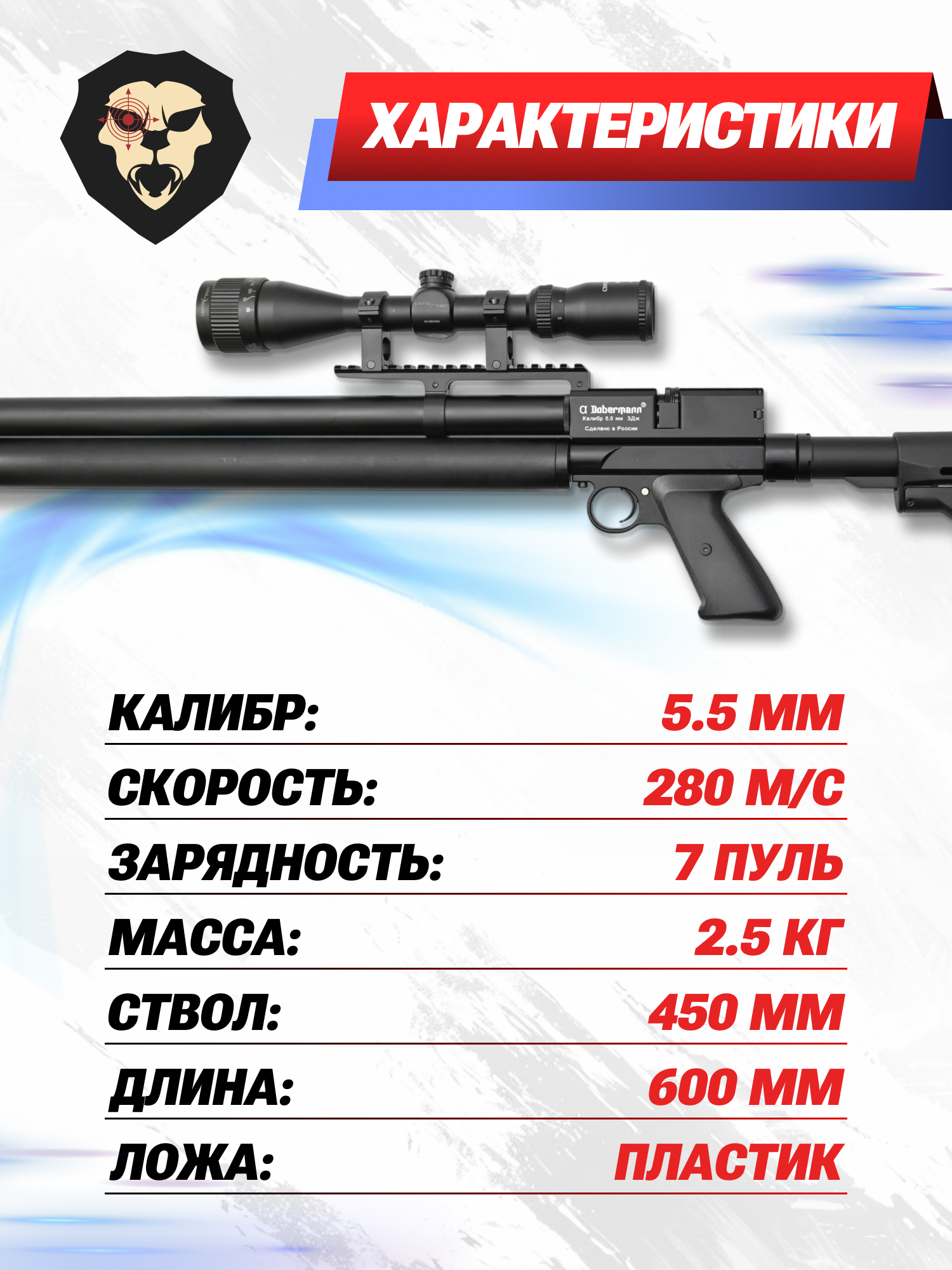 Свинцовая пуля калибра 5.5 за счёт высвобождающихся газов из баллона высокого давления разгоняется до 290 метров в секунду. Для соответствия с сертификатом энергетика винтовки уменьшена до 3 Джоулей.