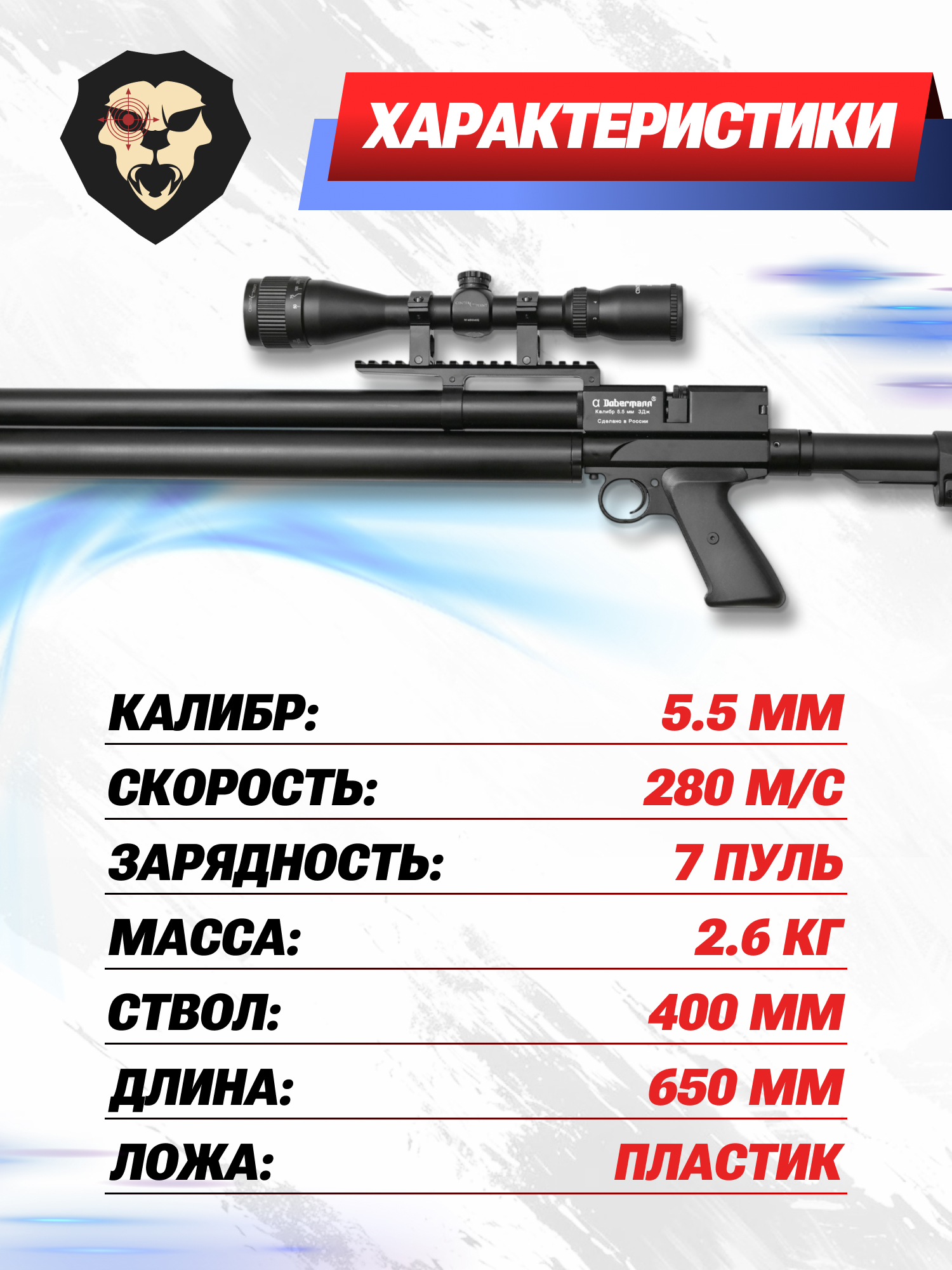 Информация о товаре "Пневматическая винтовка Alfa Dobermann Карабин 5.5 мм (PCP, ствол 400 мм, стандартные нарезы)" носит ознакомительный характер, и не является публичной офертой, определяемой положениями Статьи 437 Гражданского кодекса Российской Федерации, характеристики, внешний вид, цвет и комплектация могут быть изменены производителем без уведомления.
