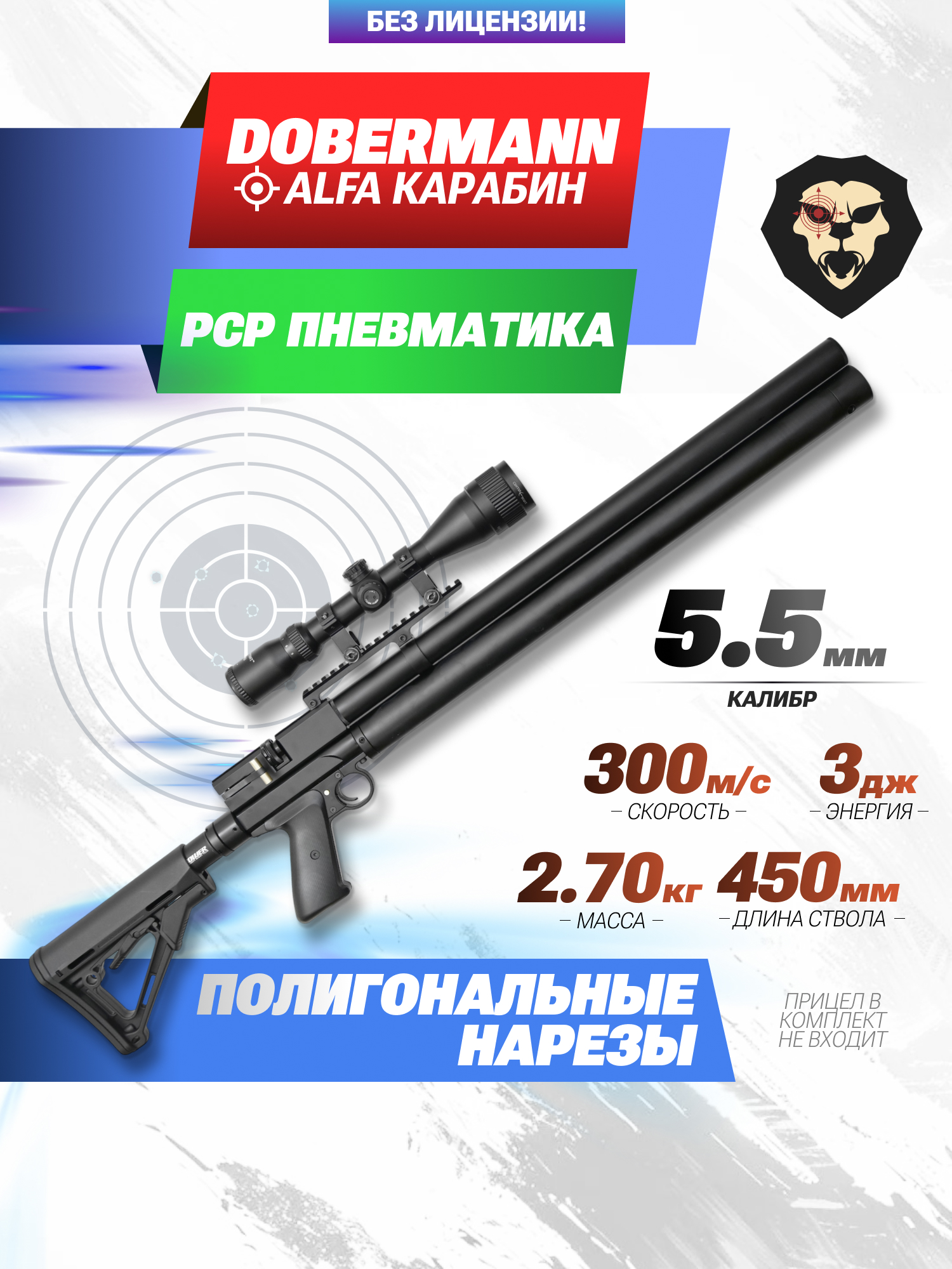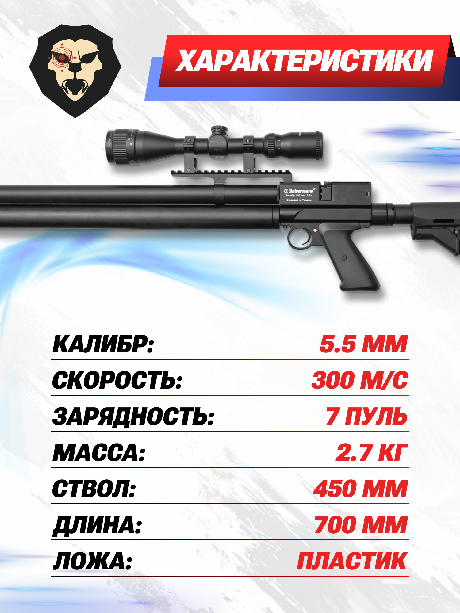 Информация о товаре "Пневматическая винтовка Alfa Dobermann Карабин 5.5 мм (ствол 450 мм, полигональные нарезы)" носит ознакомительный характер, и не является публичной офертой, определяемой положениями Статьи 437 Гражданского кодекса Российской Федерации, характеристики, внешний вид, цвет и комплектация могут быть изменены производителем без уведомления.