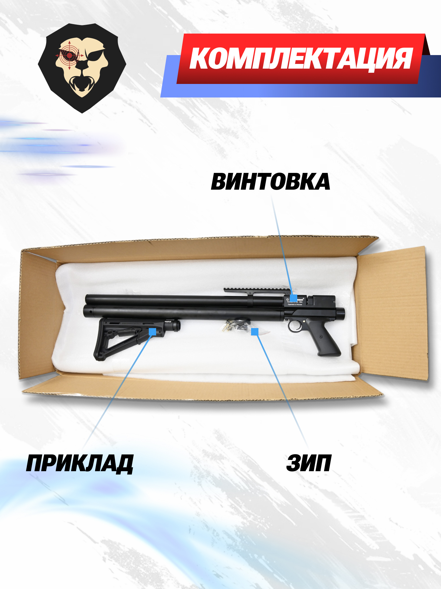 | Комплектация | Винтовка, магазин, ключ для манометра, упаковка, набор запасных РТИ, заправочный штуцер, краткая документация, копия сертификата (по запросу покупателя) |