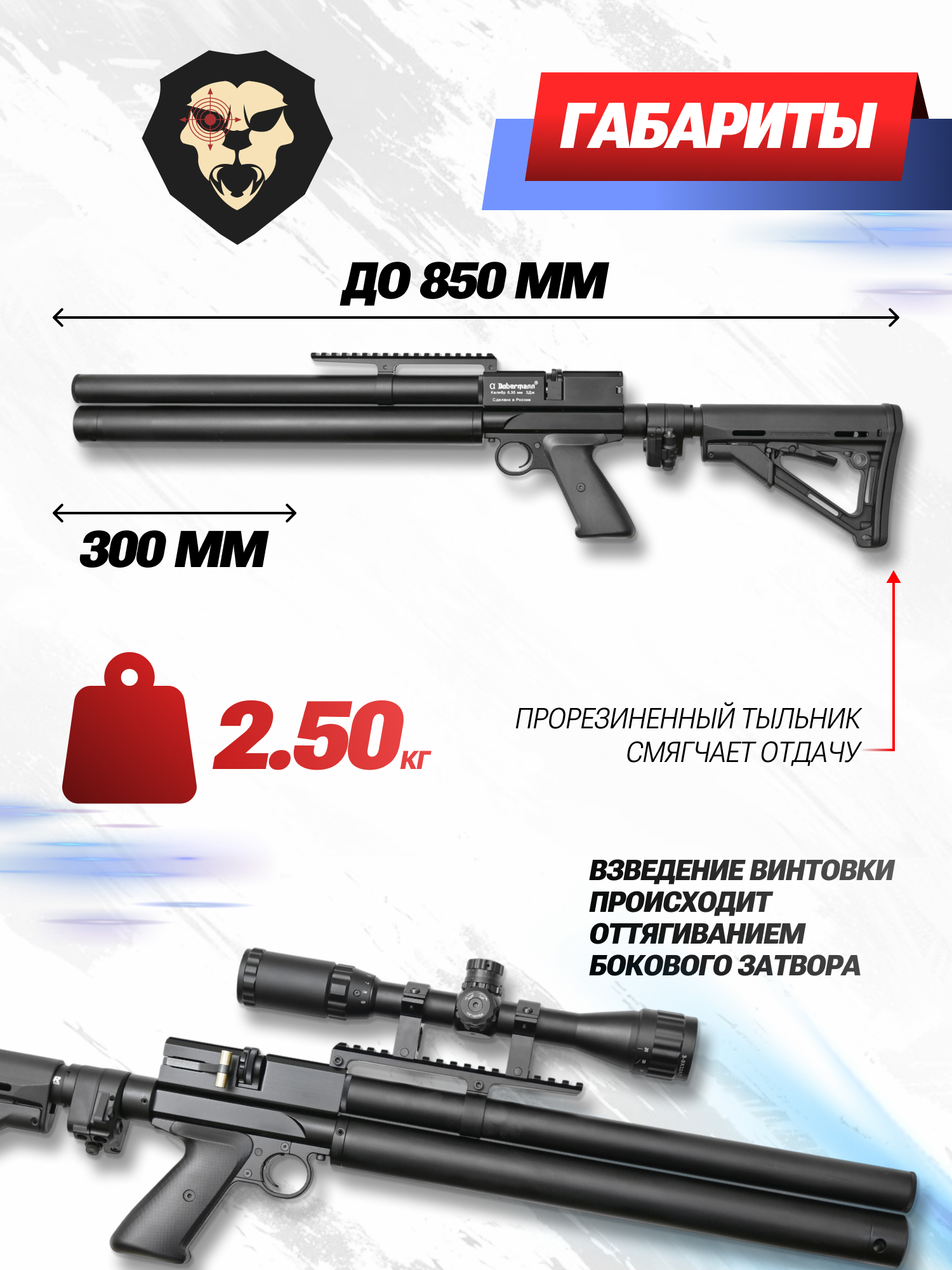 Характеристики пневматической винтовки Alfa Dobermann Карабин 6.35 мм (300 мм ствол, стандартные нарезы, складной приклад, PCP, прямоток)